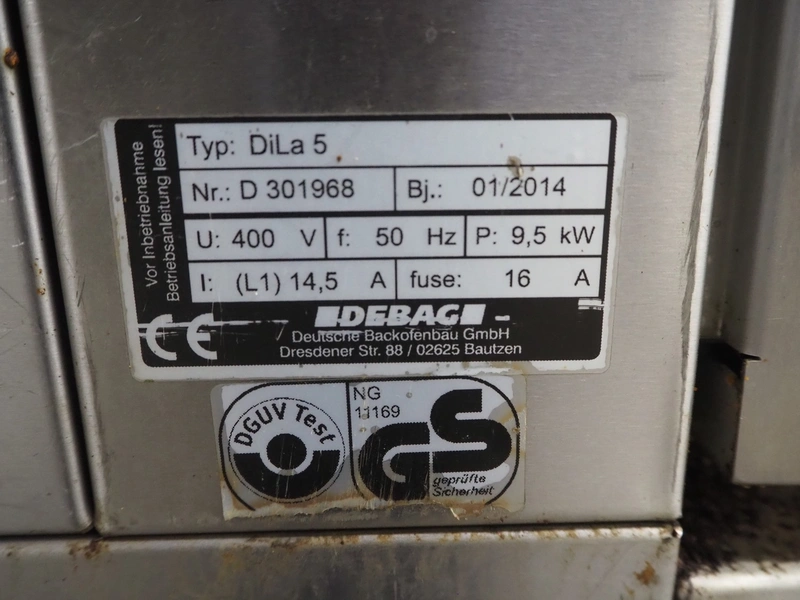 DEBAG double stacked oven, type: Dila 5, serial number: D 301967/D 301968, year of construction: 01/2014, 400 V, 50 Hz, 14.5/16 A, 9.5 kW, inside dimensions: (2x) 700 mm x 440 mm x 440 mm, total dimensions: 1150 mm x 950 mm x 2100 mm.