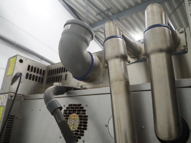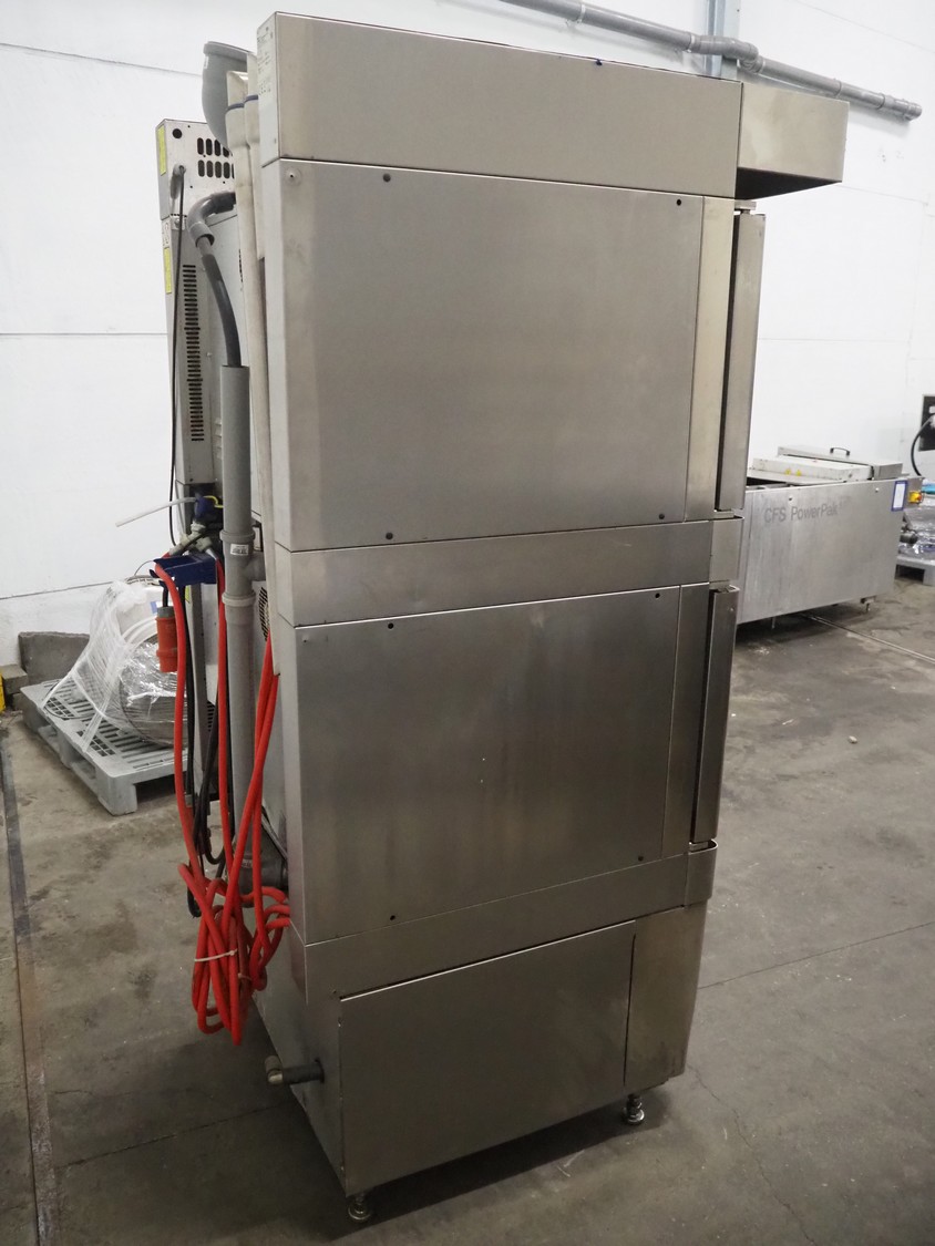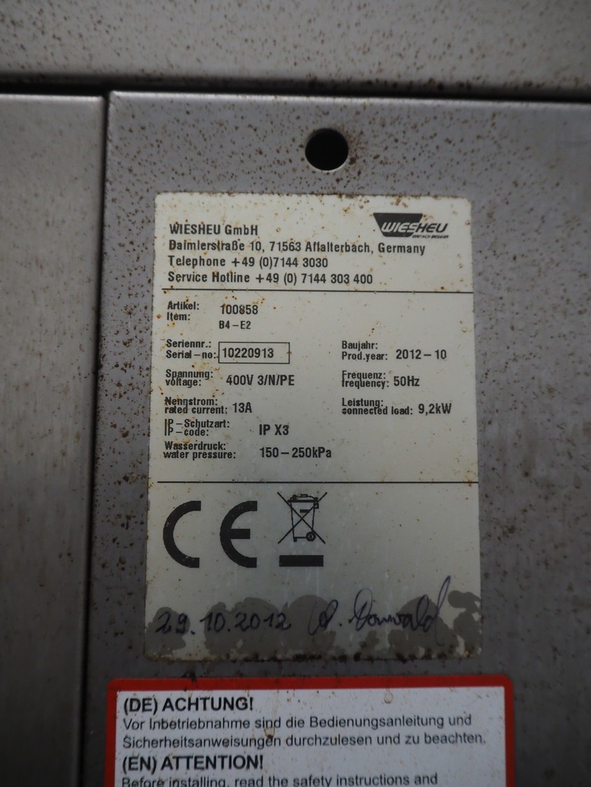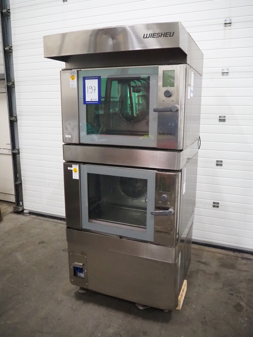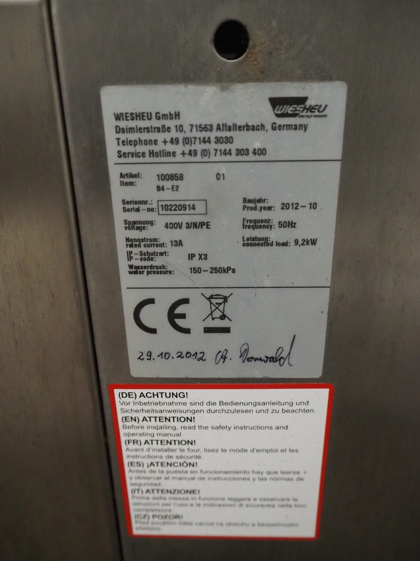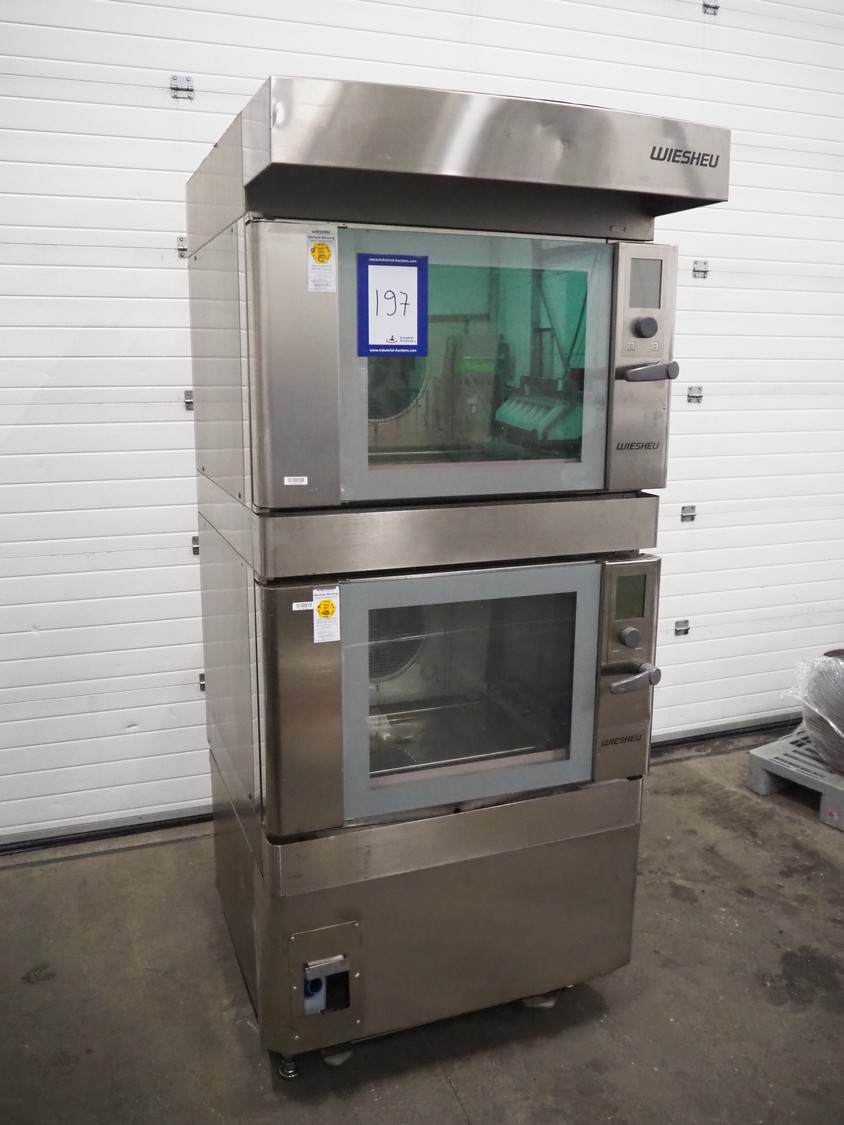 Wiesheu GmbH double stacked oven, type top oven: B4-E2, serial number: 10220913, year of construction: 2012, 400 V, 3 Ph, 50 Hz, 13 A, 9.2 kW, type bottom oven: B4-E2, serial number: 10220914, year of construction: 10/2012, 400 V, 3 Ph, 50 Hz, 13 A, 9.2 kW, total dimensions: 765 mm x 530 mm x 1985 mm.