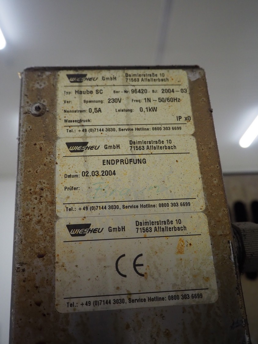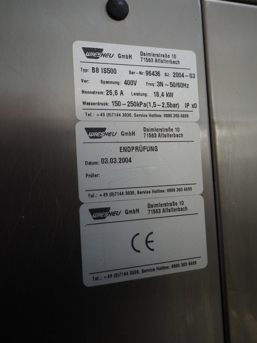 Wiesheu GmbH convection oven, type: B8 IS500, serial number: 96436, year of construction: 2004-03, 400 V, 3 Ph, 50/60 Hz, 26.6 A, 18.4 kW, 10 floors, dimensions each floor: 615 mm x 370 mm, total dimensions: 1050 mm x 930 mm x 2050 mm.