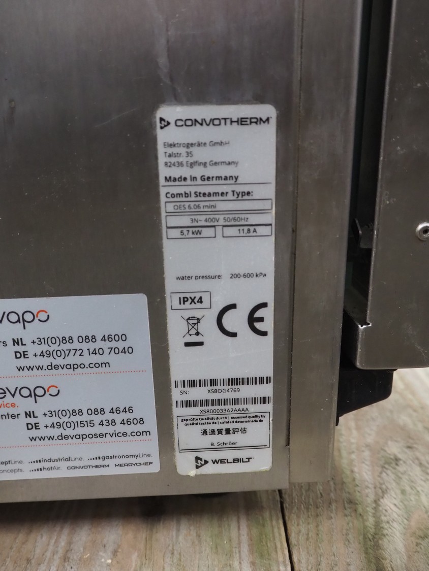 Convotherm oven, type: OES6.06 mini, serial number: XS8OG4769, 400 V, 3 Ph, 50/60 Hz, 11.8 A, 5.7 kW, water pressure: 200-600kPa, total dimensions: 840 mm x 550 mm x 500 mm.