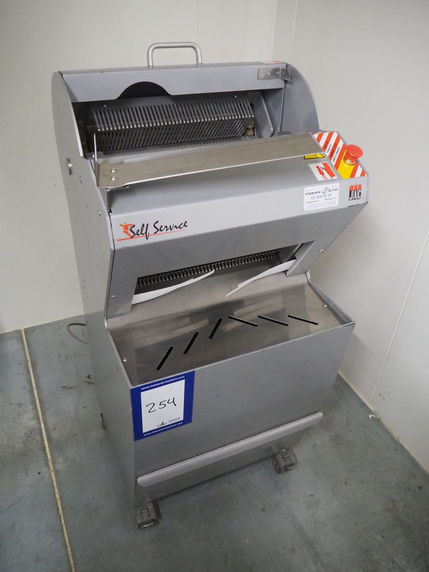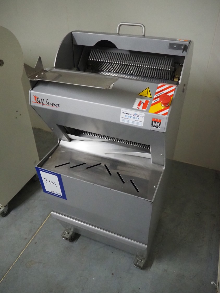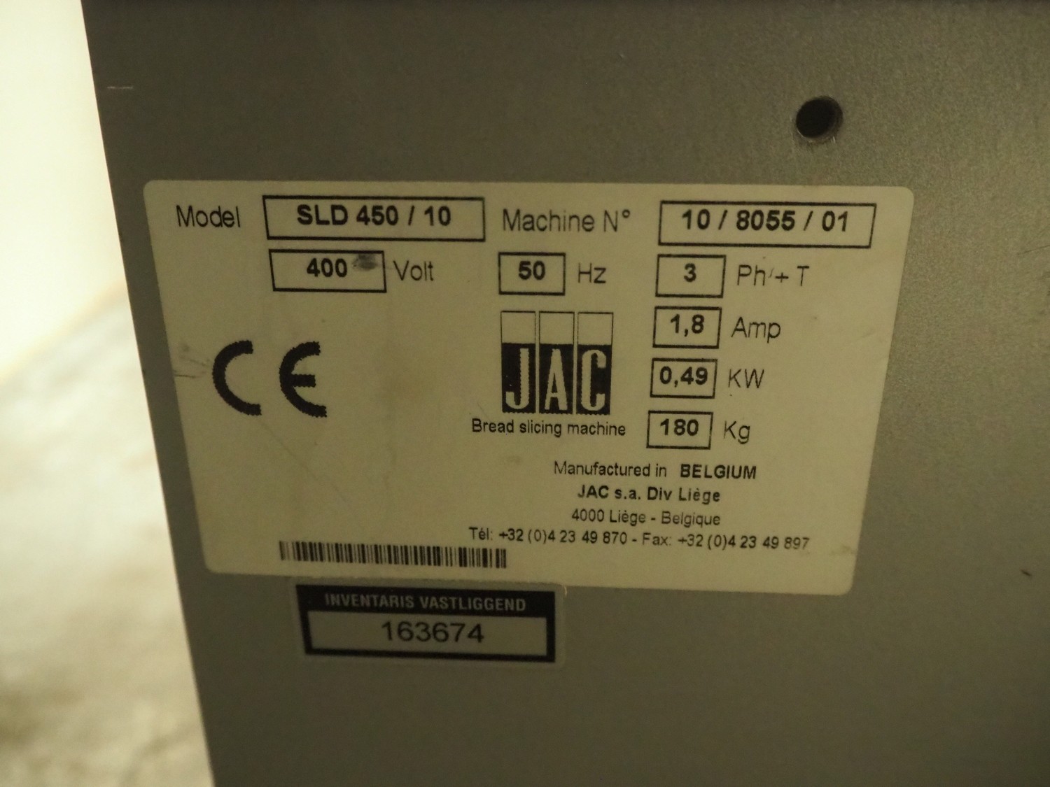 Jac mobile bread slicer, model: SLD 450/10, machine number: 10/8055/01, 400 V, 3 Ph, 50 Hz, 1.8 A, 0.49 kW, weight: 180 kg, working width: 440 mm, 41 knifes, distance between knifes: 10 mm, total dimensions: 700 mm x 600 mm x 1300 mm.