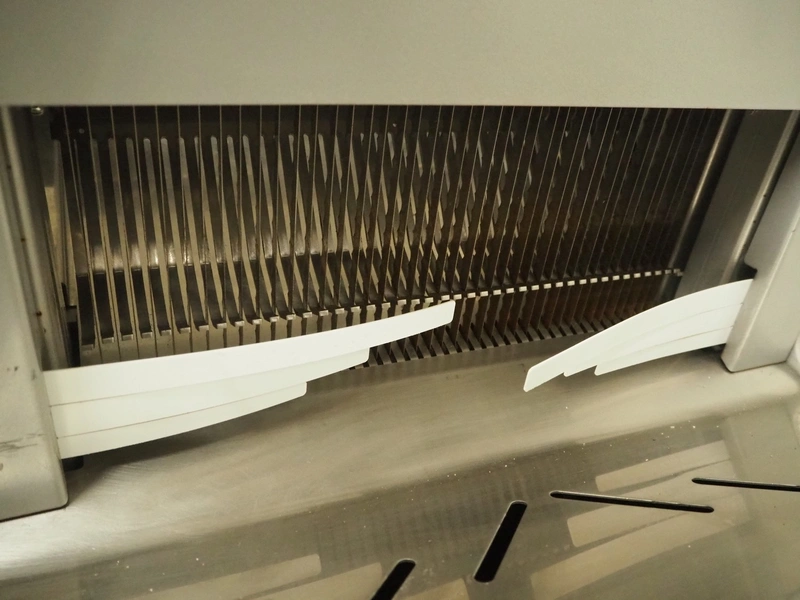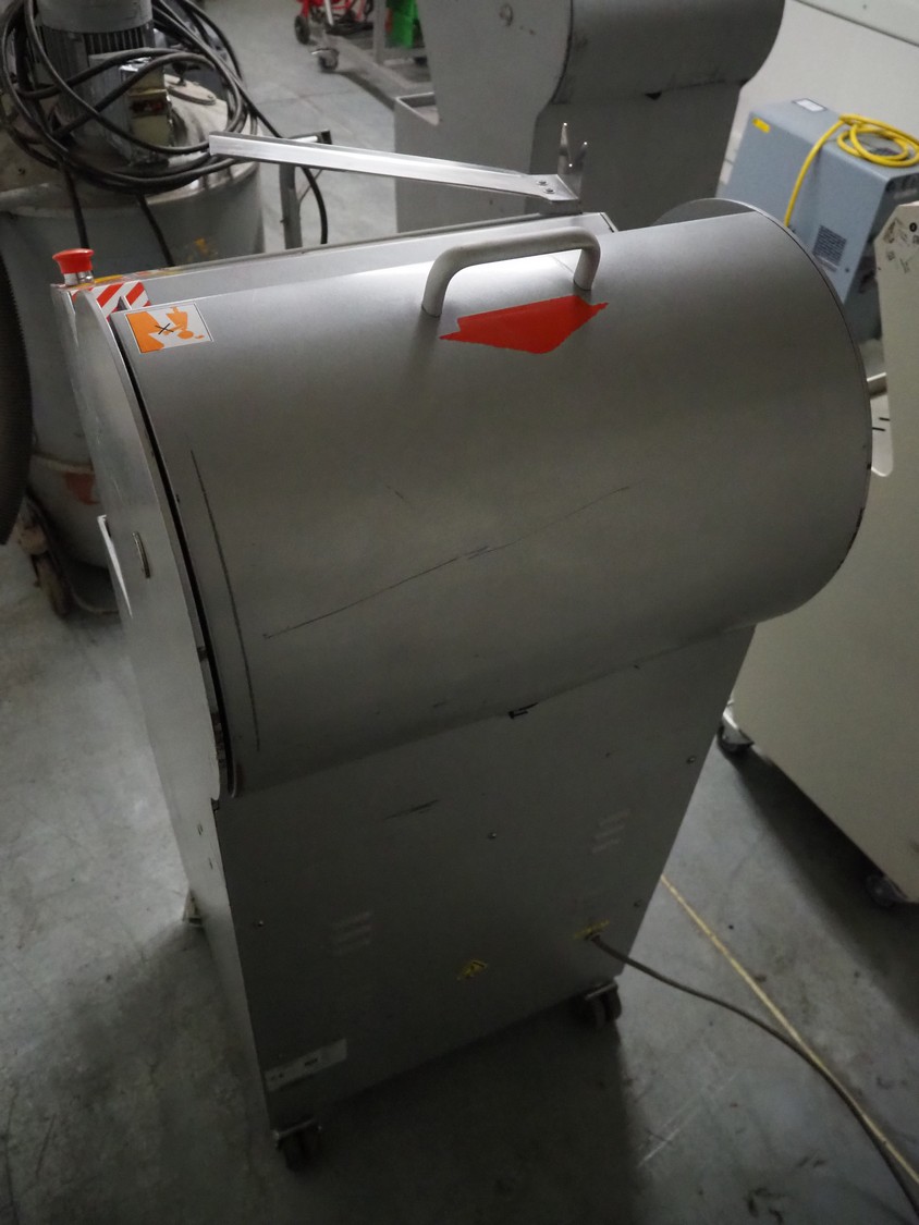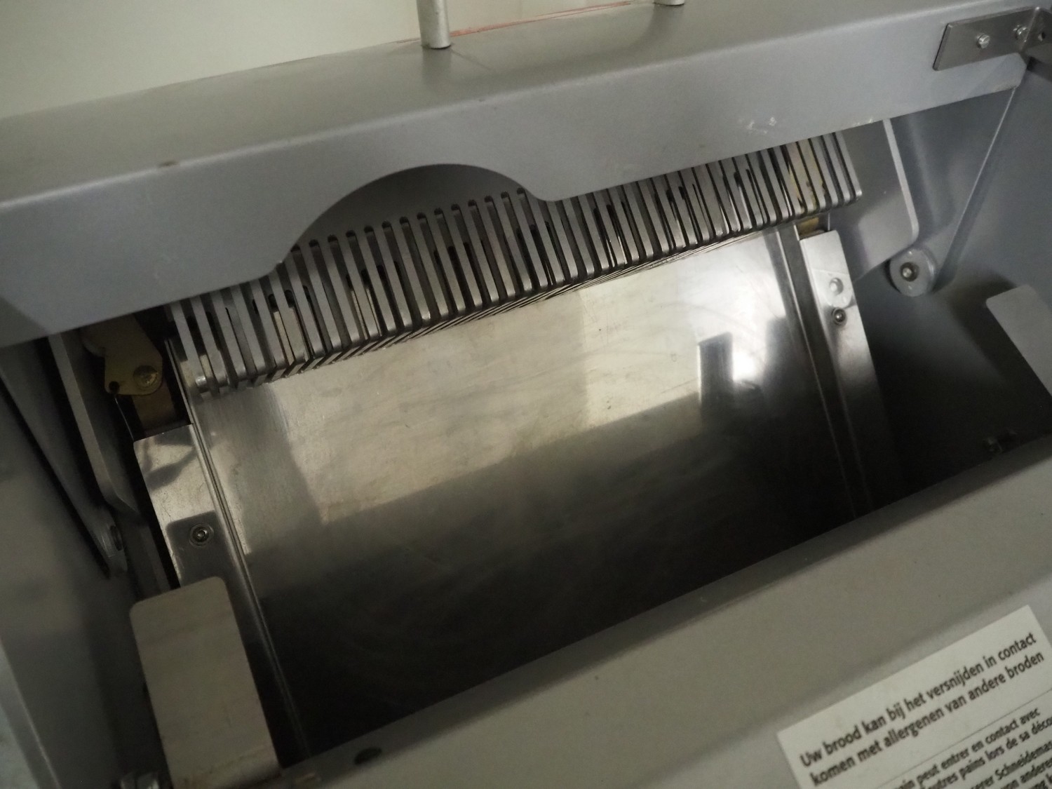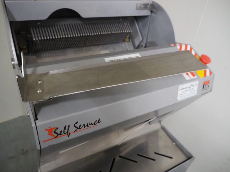 Jac mobile bread slicer, model: SLD 450/10, machine number: 10/8055/01, 400 V, 3 Ph, 50 Hz, 1.8 A, 0.49 kW, weight: 180 kg, working width: 440 mm, 41 knifes, distance between knifes: 10 mm, total dimensions: 700 mm x 600 mm x 1300 mm.