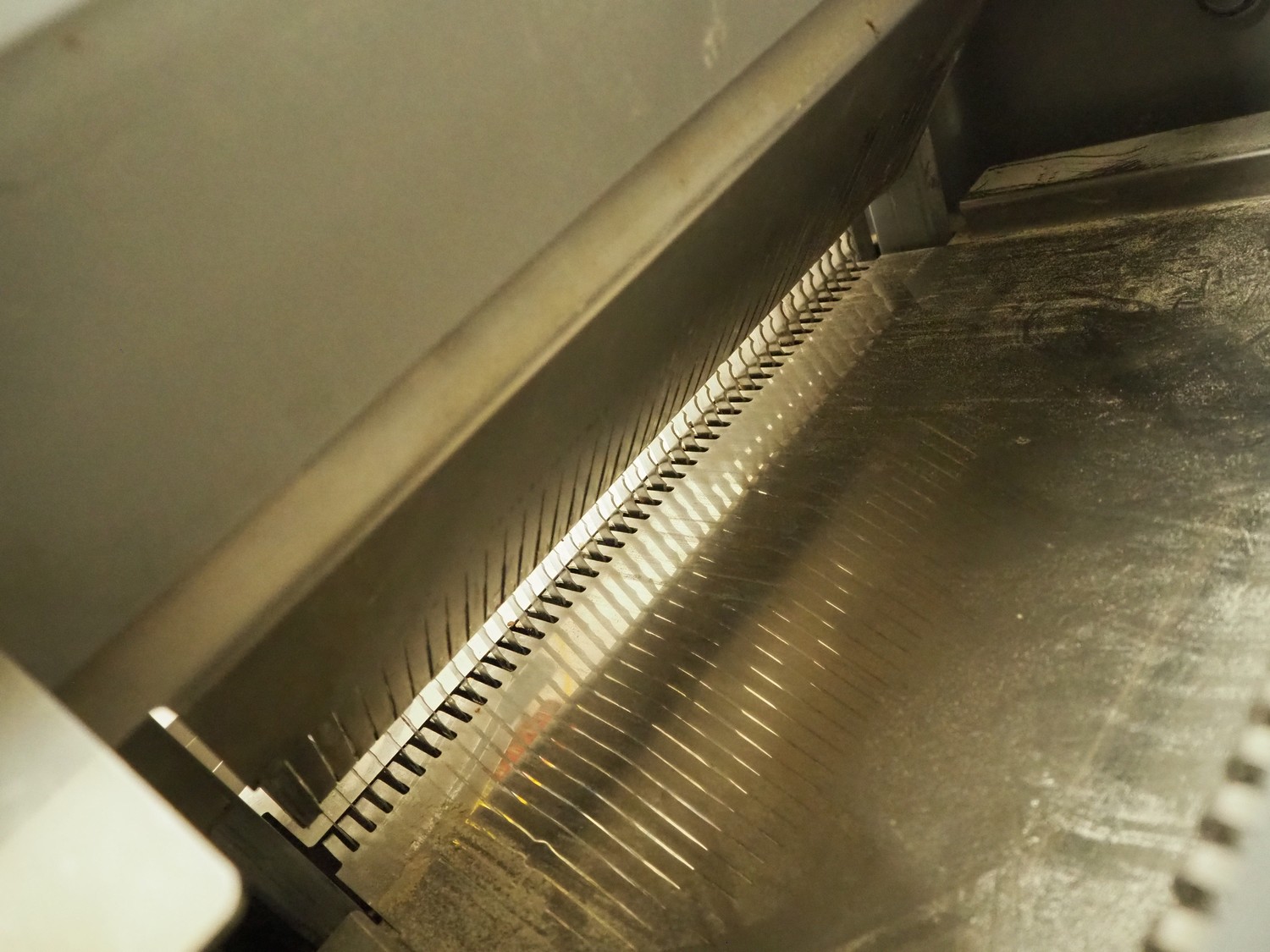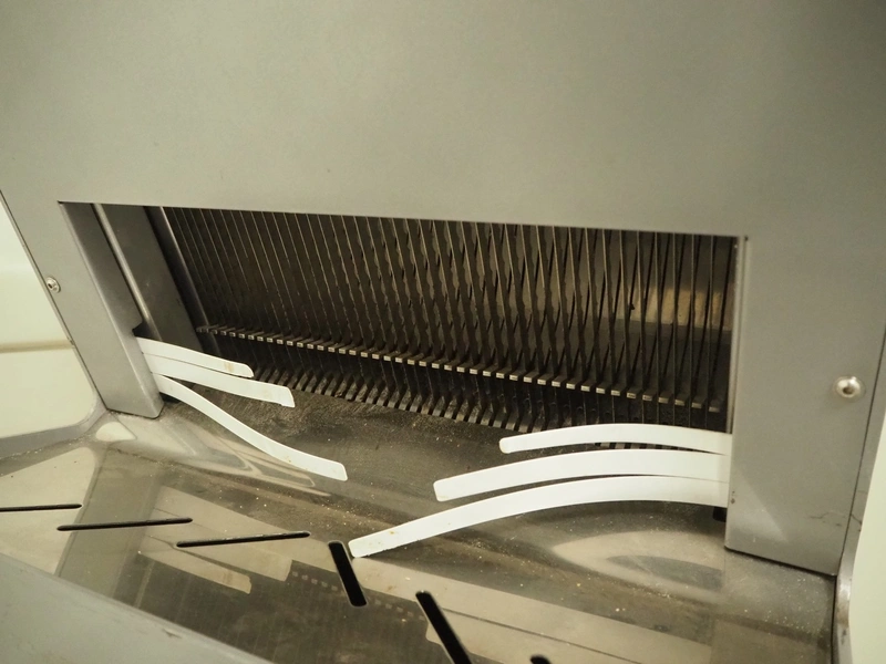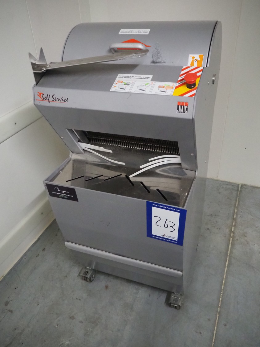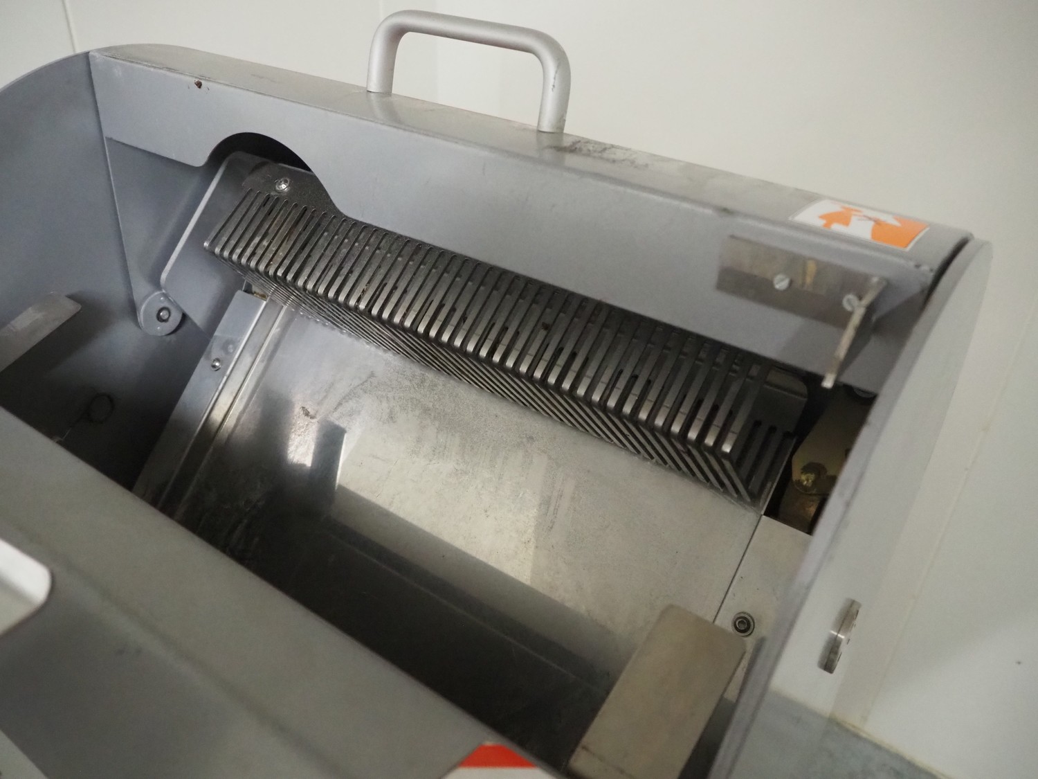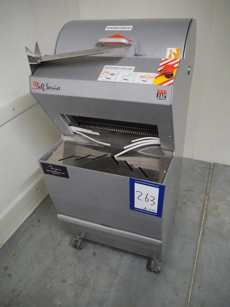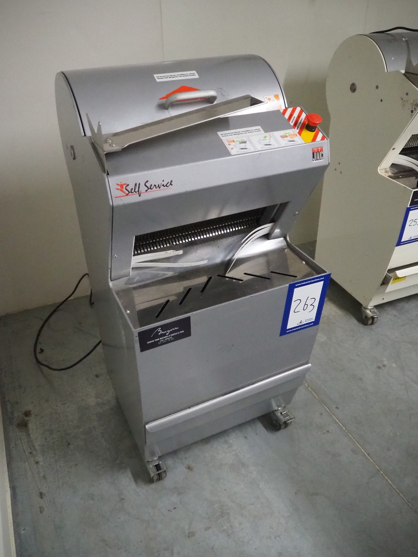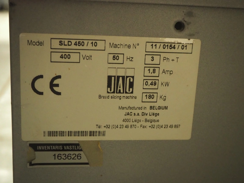 Jac mobile bread slicer, model: SLD 450/10, machine number: 11/0154/01, 400 V, 3 Ph, 50 Hz, 1.8 A, 0.49 kW, weight: 180 kg, working width: 440 mm, 41 knifes, distance between knifes: 11 mm, total dimensions: 700 mm x 600 mm x 1300 mm.