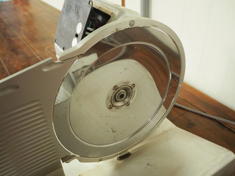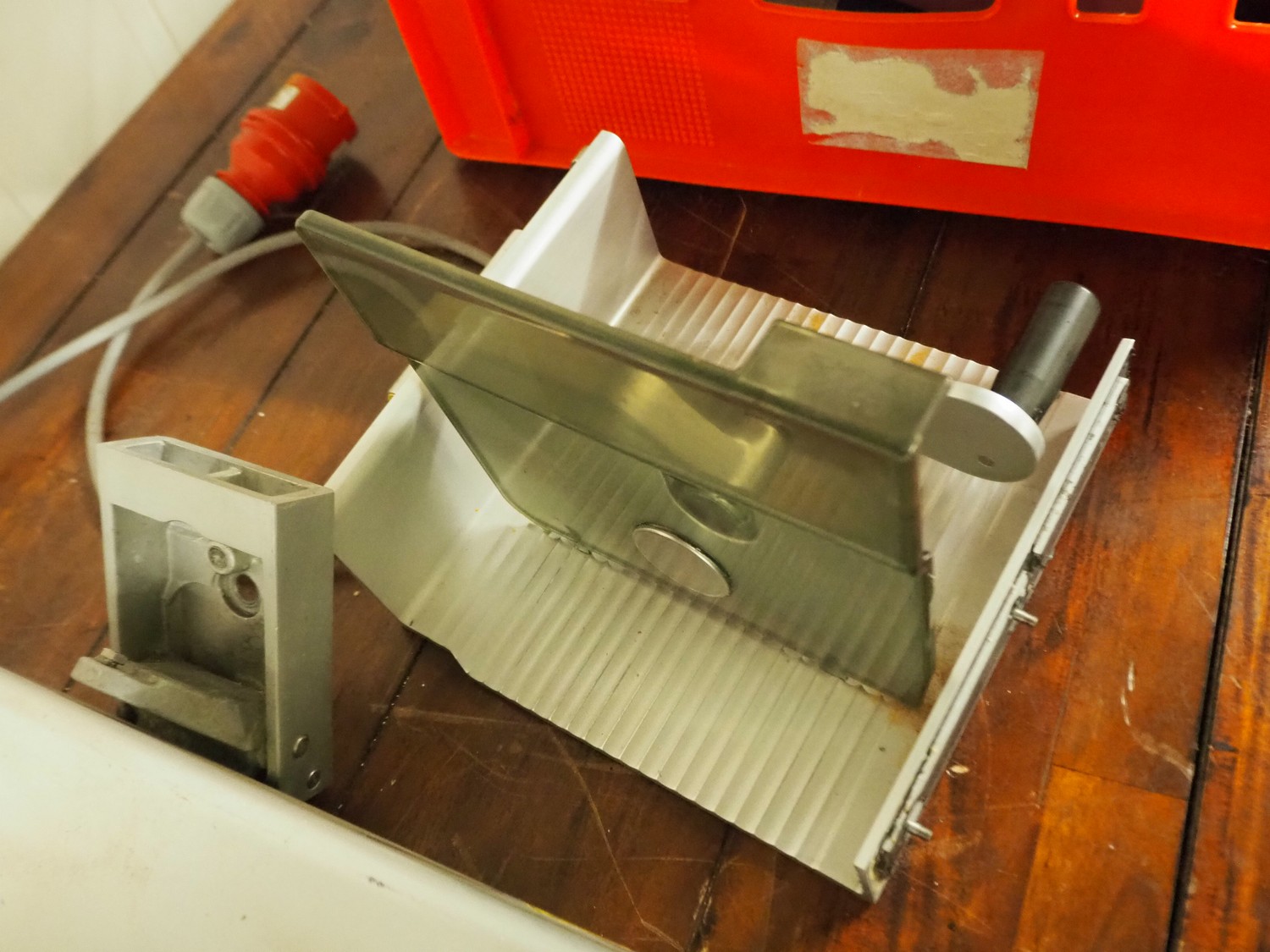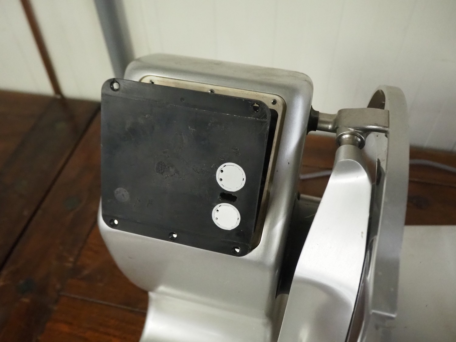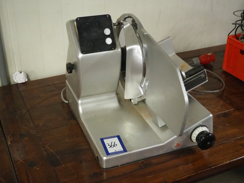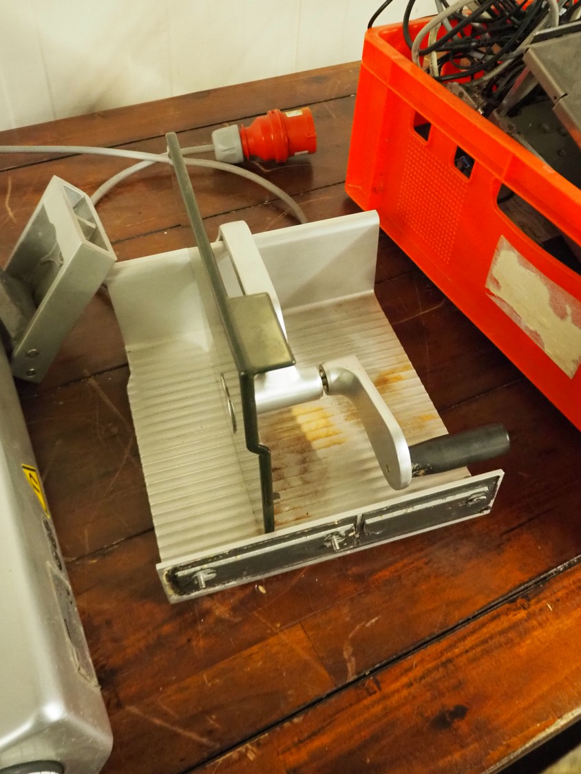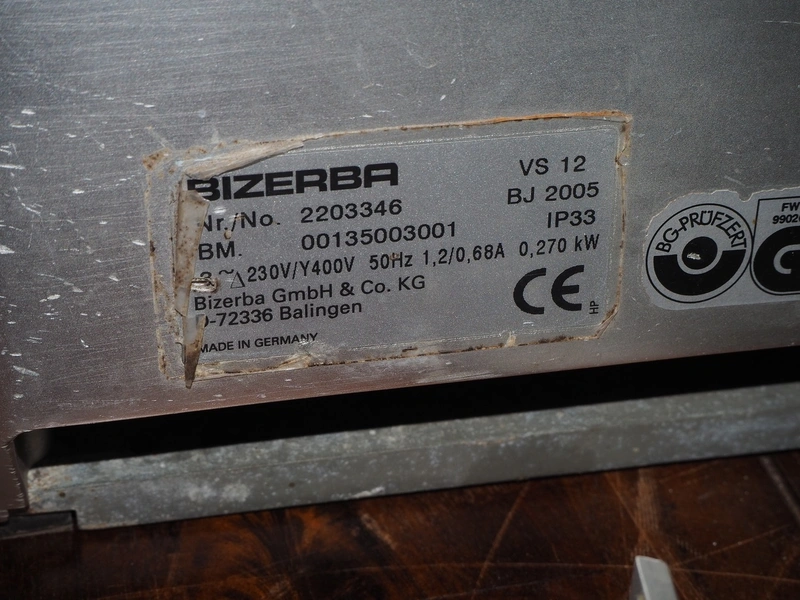 Bizerba slicer, model: VS 12, number: 2203346, year of construction: 2005, 230/400 V, 3 Ph, 50 Hz, 1.2/0.68 A, 0.270 kW, dimensions: 600 mm x 540 mm x 420 mm. Defect.