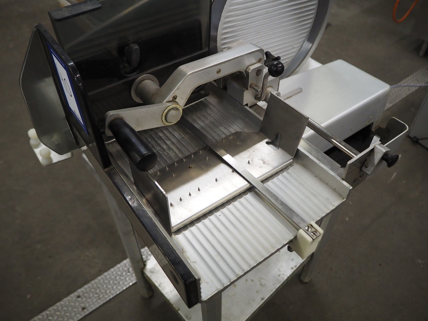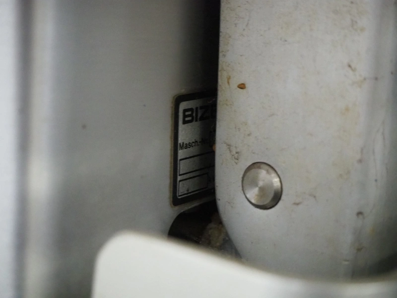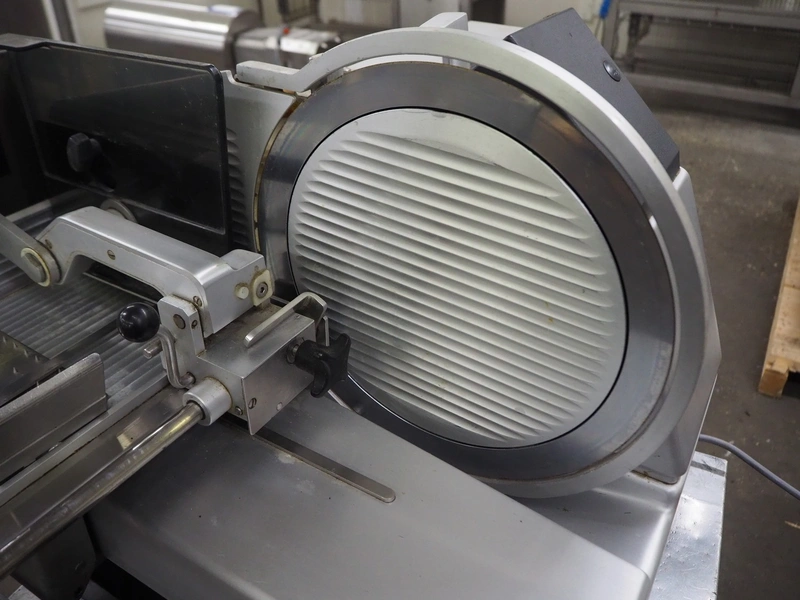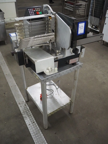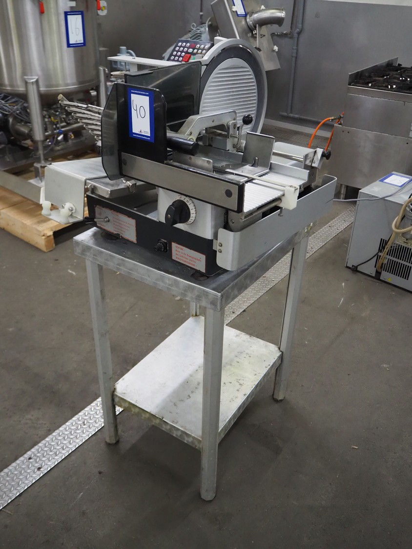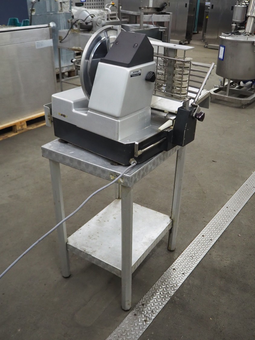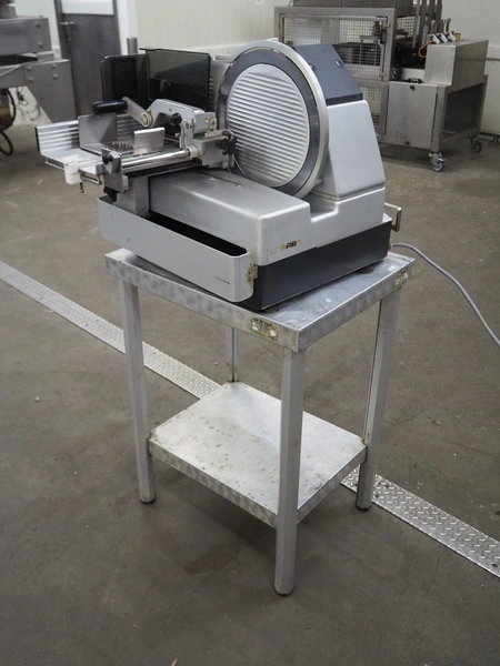 Bizerba slicer on s/s table, dimensions: 800 mm x 800 mm x 1400 mm.