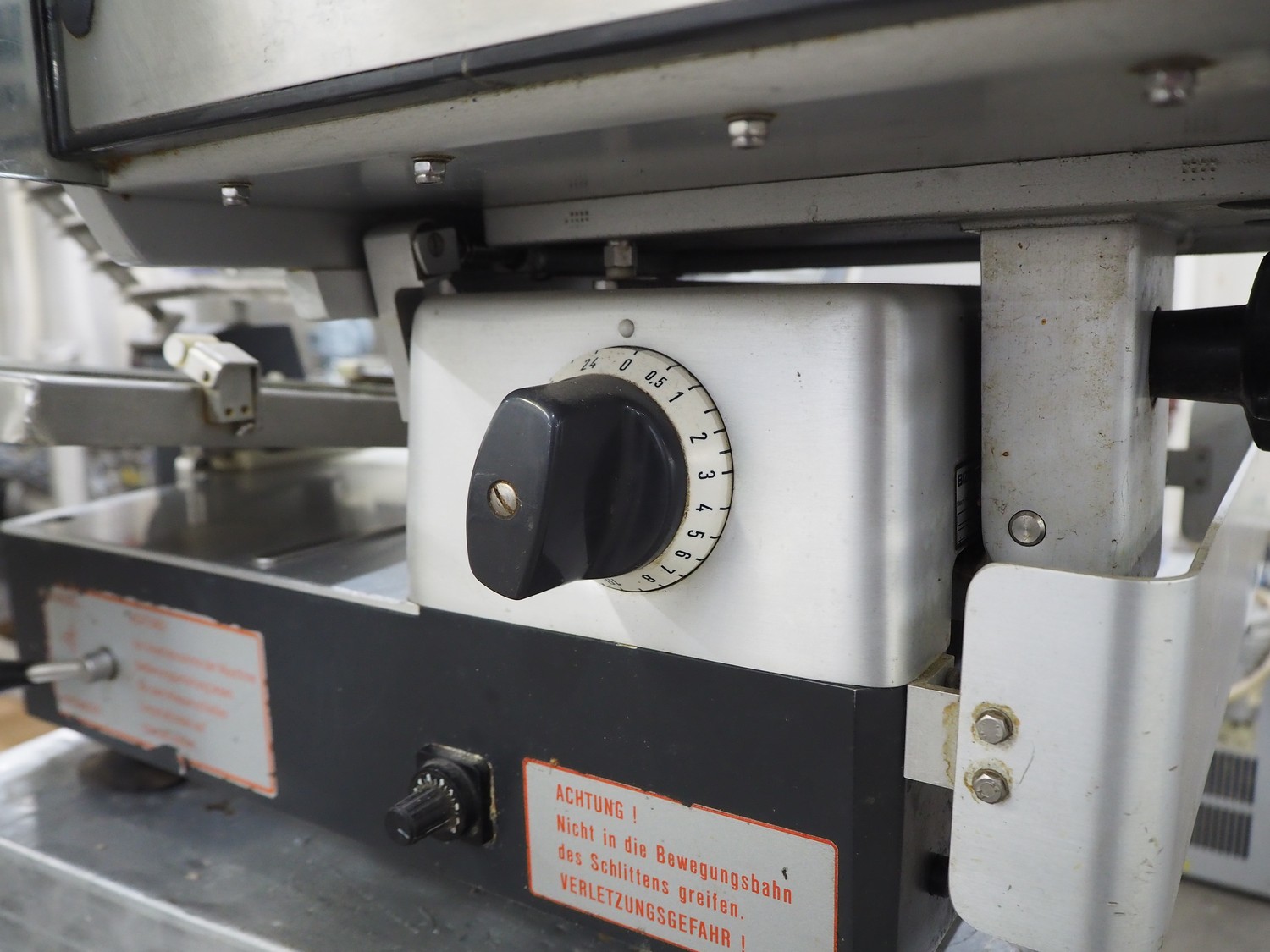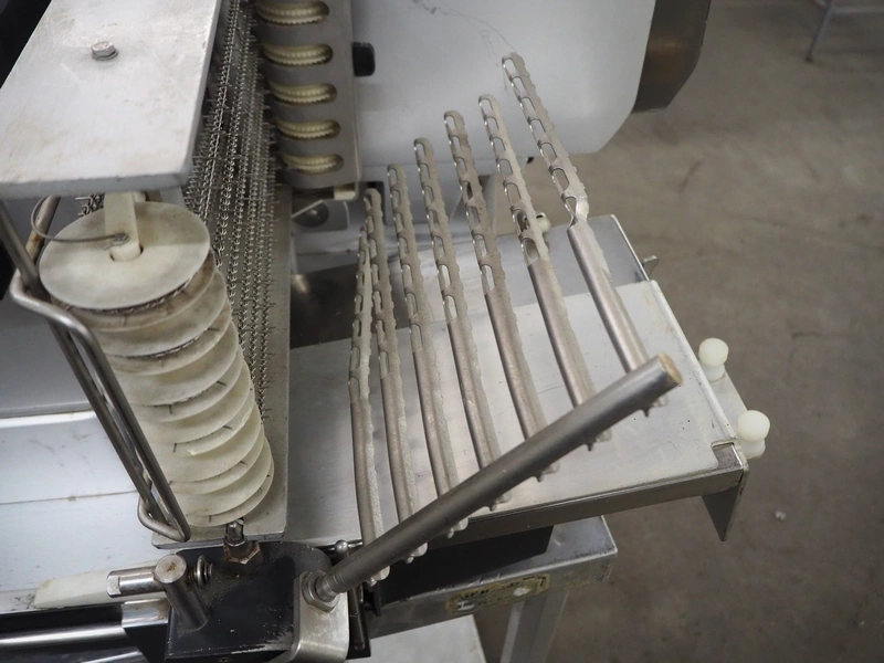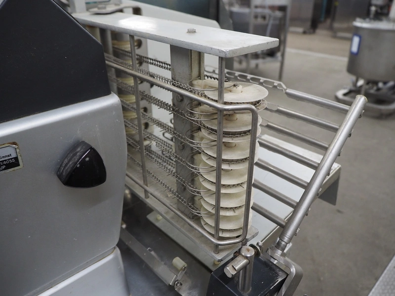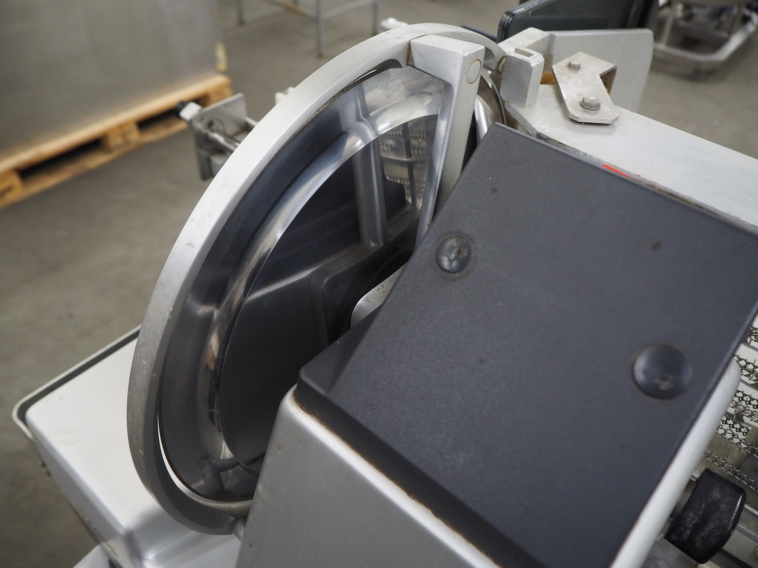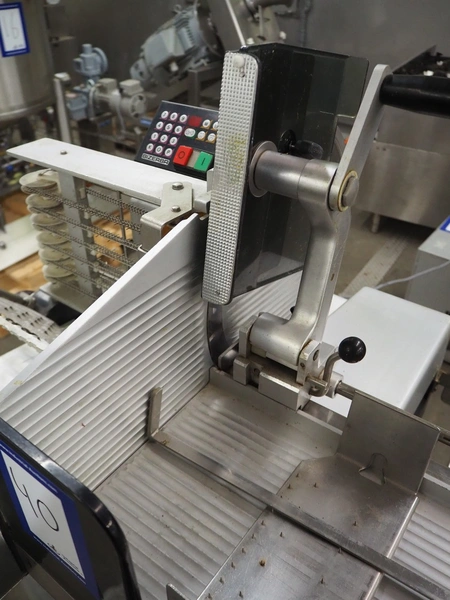 Bizerba slicer on s/s table, dimensions: 800 mm x 800 mm x 1400 mm.