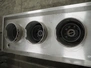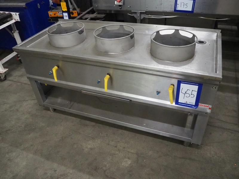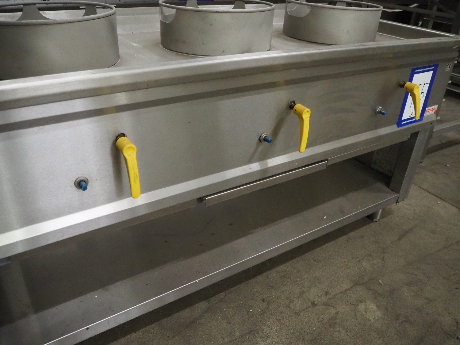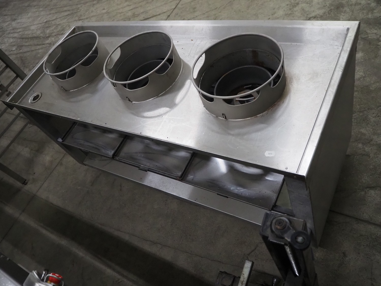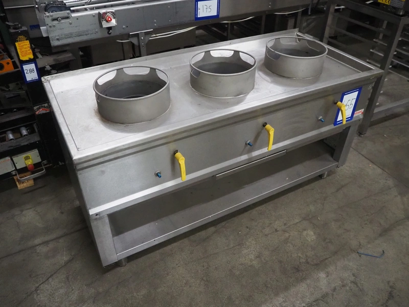 Bertrand 3-pits wok stove, ø stove: (3x) 290 mm, total dimensions: 1500 mm x 680 mm x 800 mm.