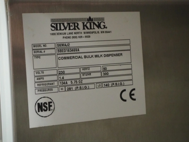 Silver King milk dispenser, model: SKMAJ2, serial number: SBED163469A, 230 V, 50 Hz, 1.4 A, refrigerant: 134A, inside dimensions: (2x) 290 mm x 260 mm x 500 mm, total dimensions: 720 mm x 440 mm x 1000 mm.