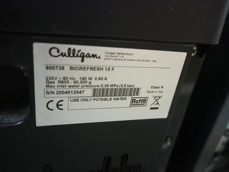 Culligan drink water dispenser, serial number: 2004012547, 230 V, 50 Hz, 0.6 A, 140 W, dimensions: 420 mm x 340 mm x 1100 mm.