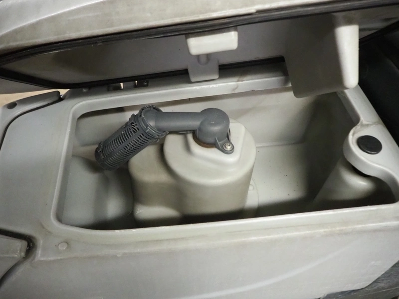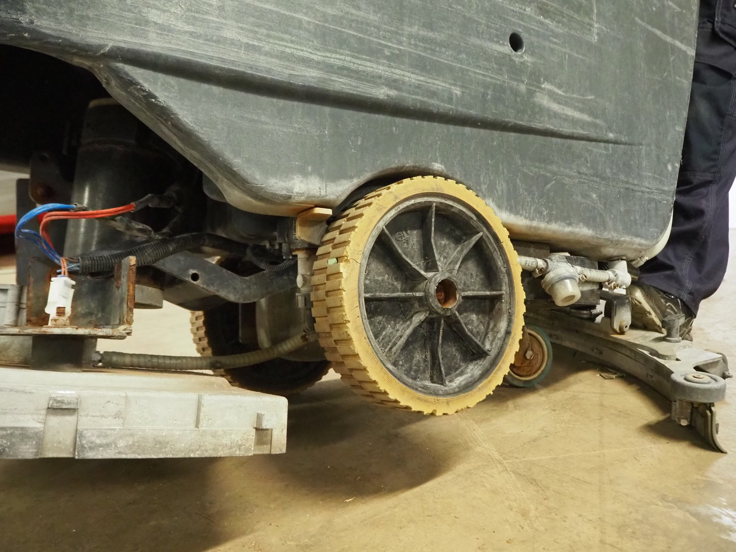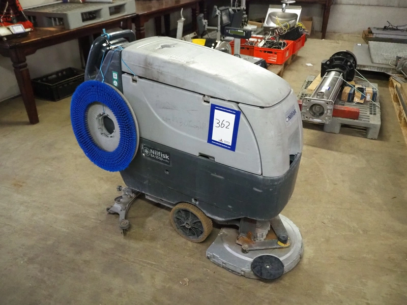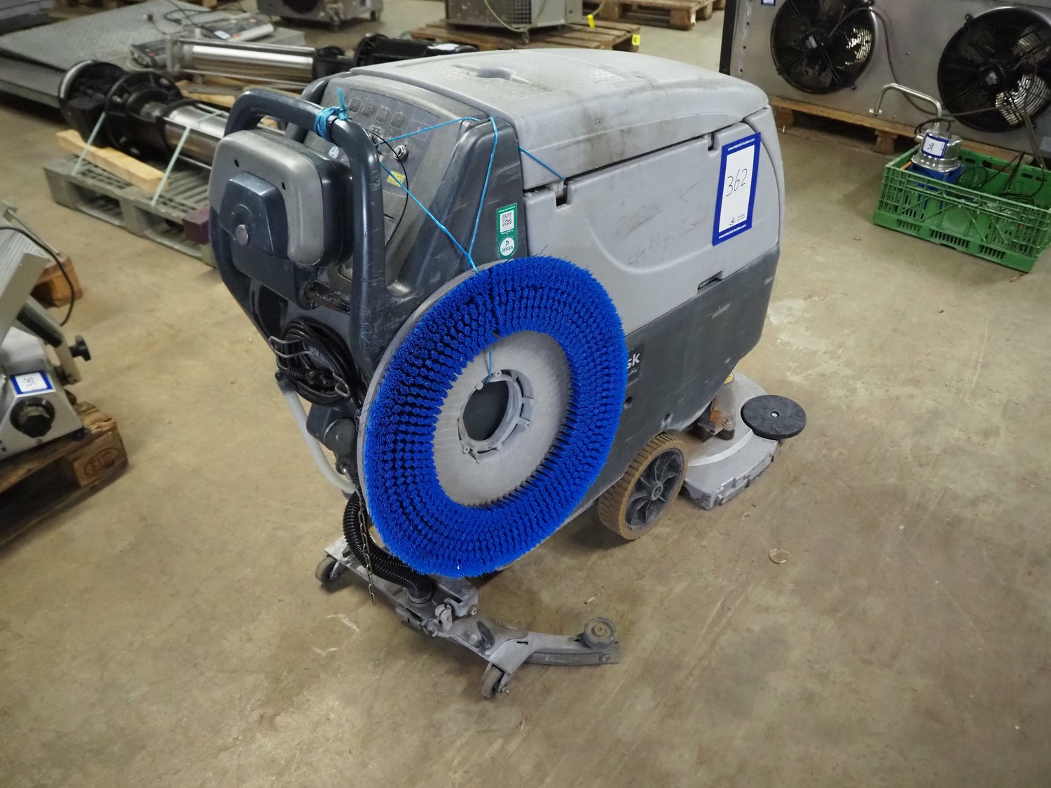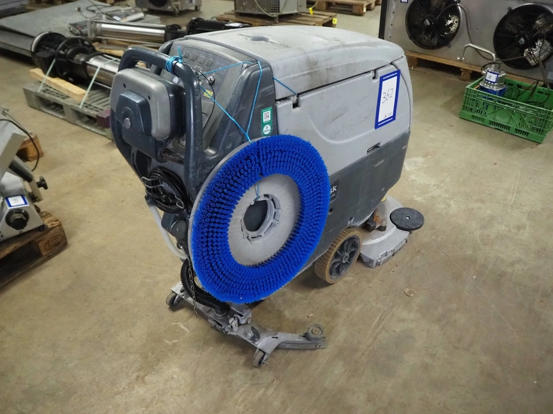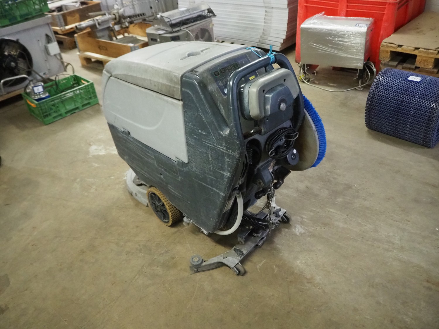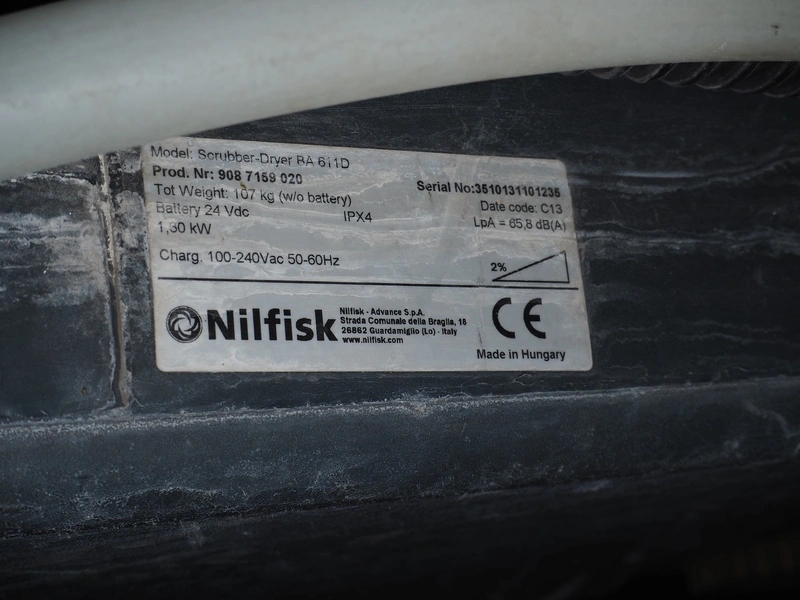 Nilfisk floor scrubbing machine, model: Scrubber-Dryer BA 611D, serial number: 3510131101235, 100-240 Vac, 50-60 Hz, 1.3 kW, dimensions: 1400 mm x 800 mm x 1080 mm.