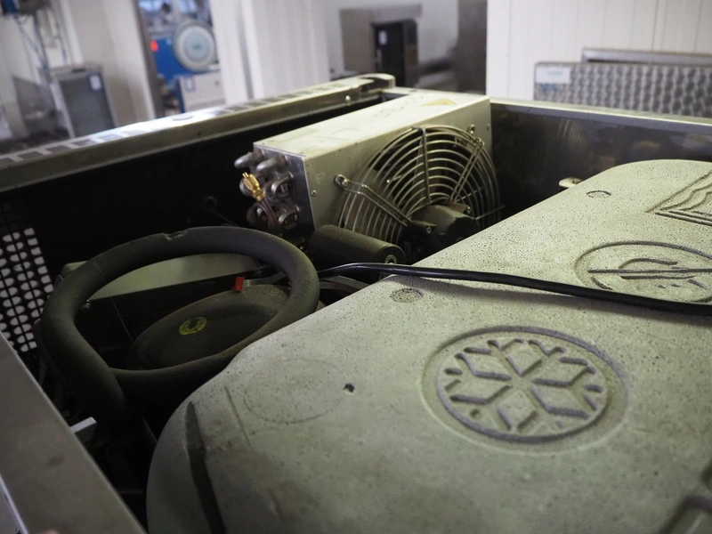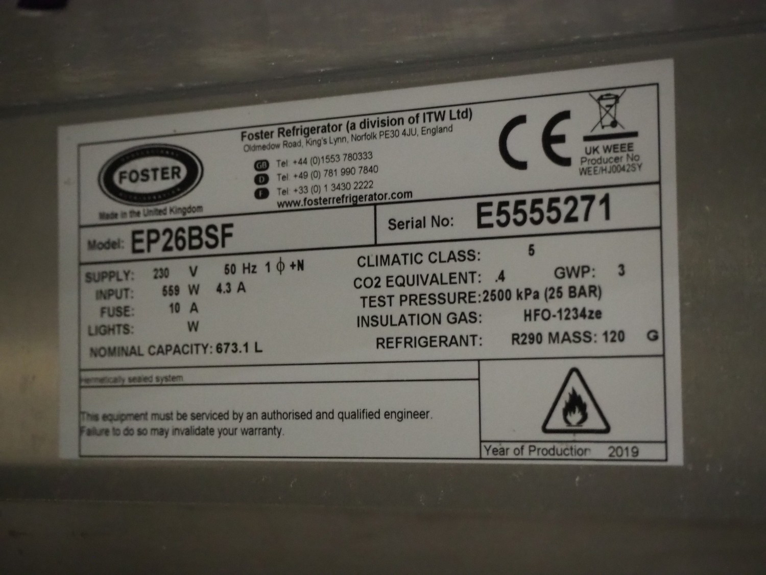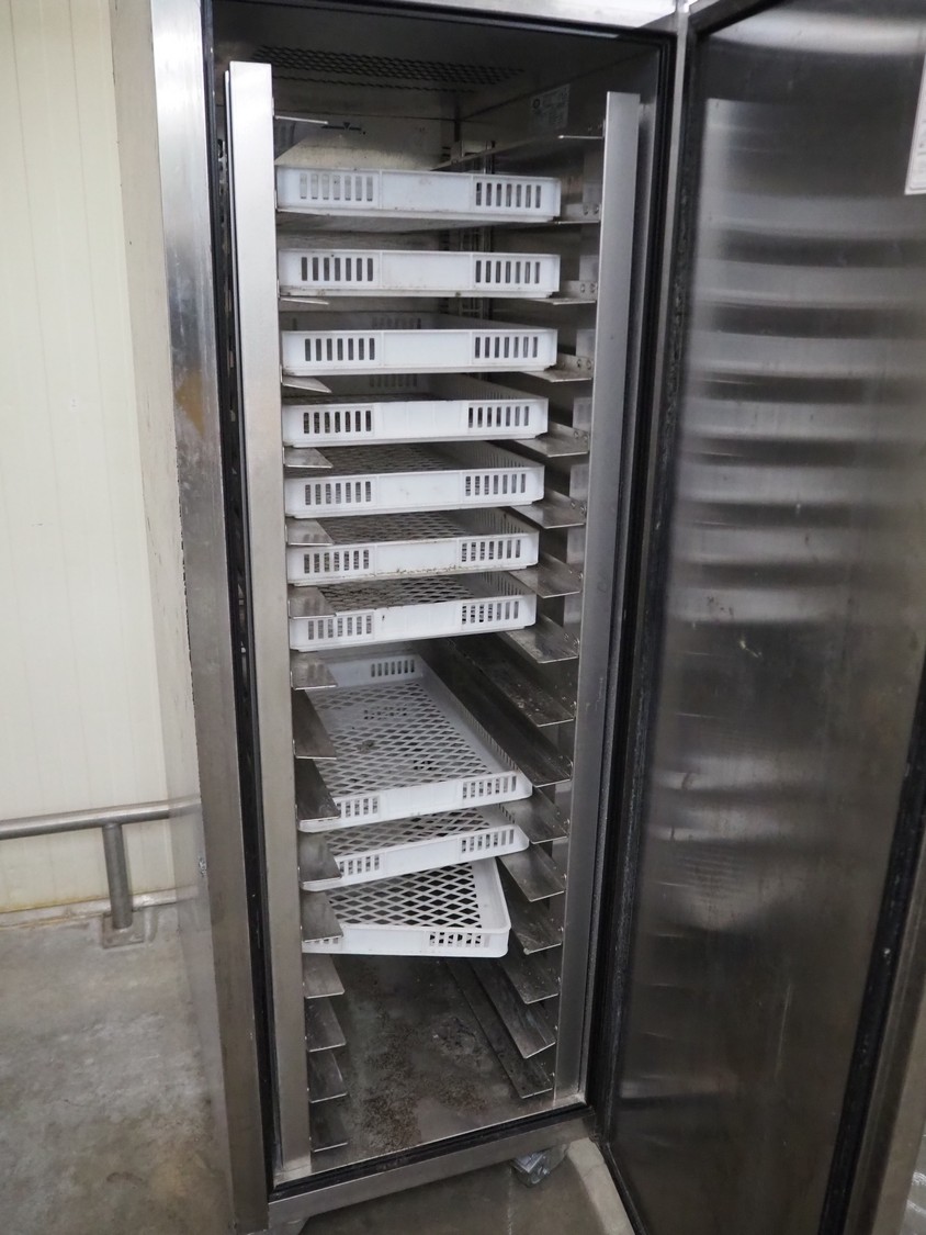 Foster mobile refrigerator, model: EP 26 BSF, serial number: E5555271, year of construction: 2019, 230 V, 1 Ph, 50 Hz, 4.3 A, 559 W, capacity: 673.1 liter, refrigerant: R290/120 g, 16 floors, dimensions each floor: 730 mm x 420 mm, total dimensions: 940 mm x 700 mm x 2300 mm.