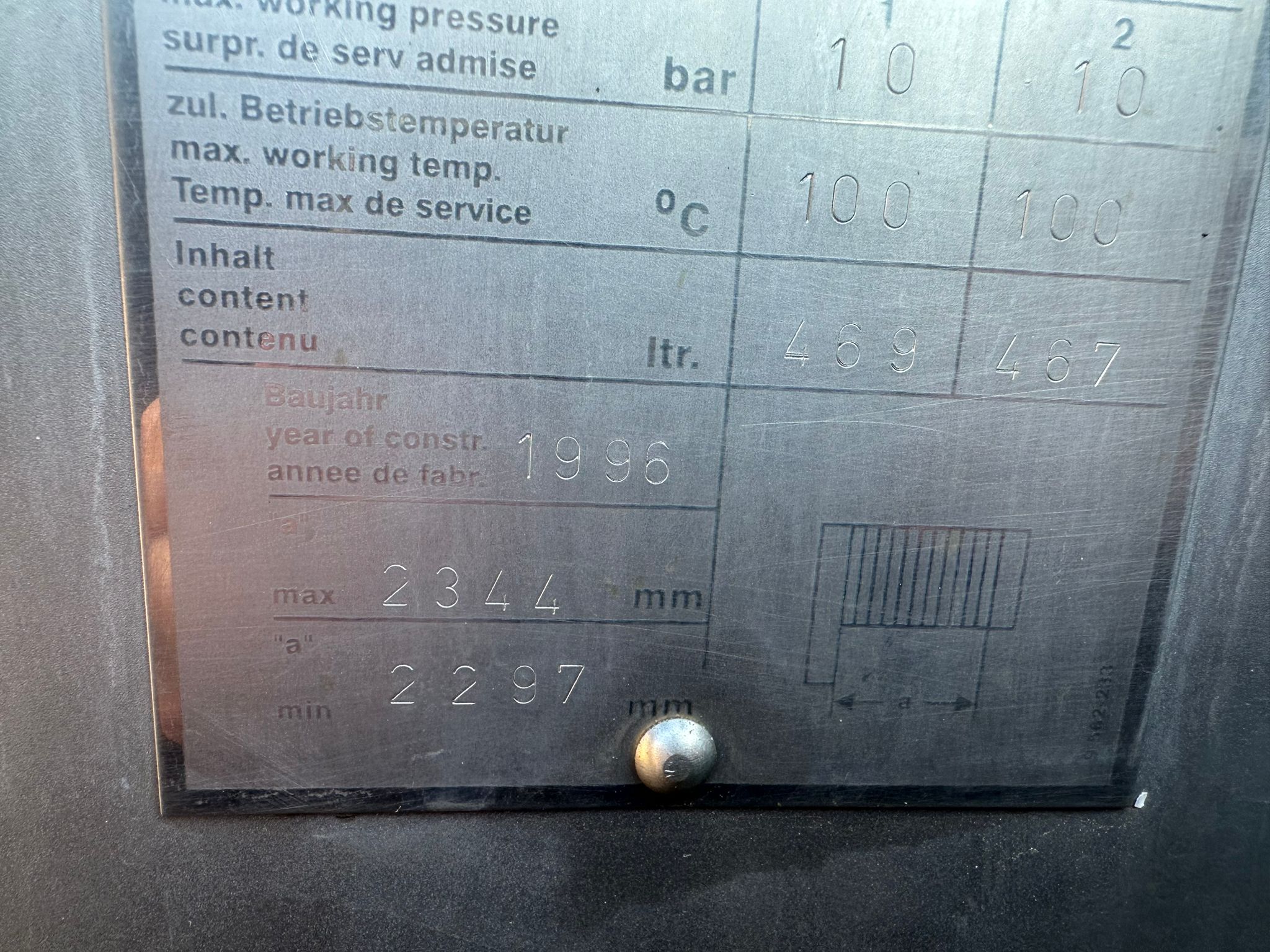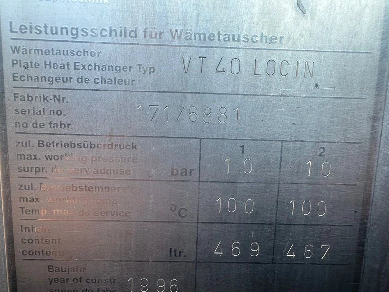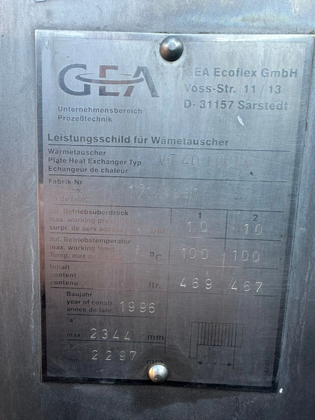 GEA heat exchanger, type: VT40 LOCIN, fabrication: 171/6881, year of construction: 1996, volume: 469/467 liter, estimated weight: 4000 kg, dimensions: 3500 mm x 600 mm x 1900 mm.