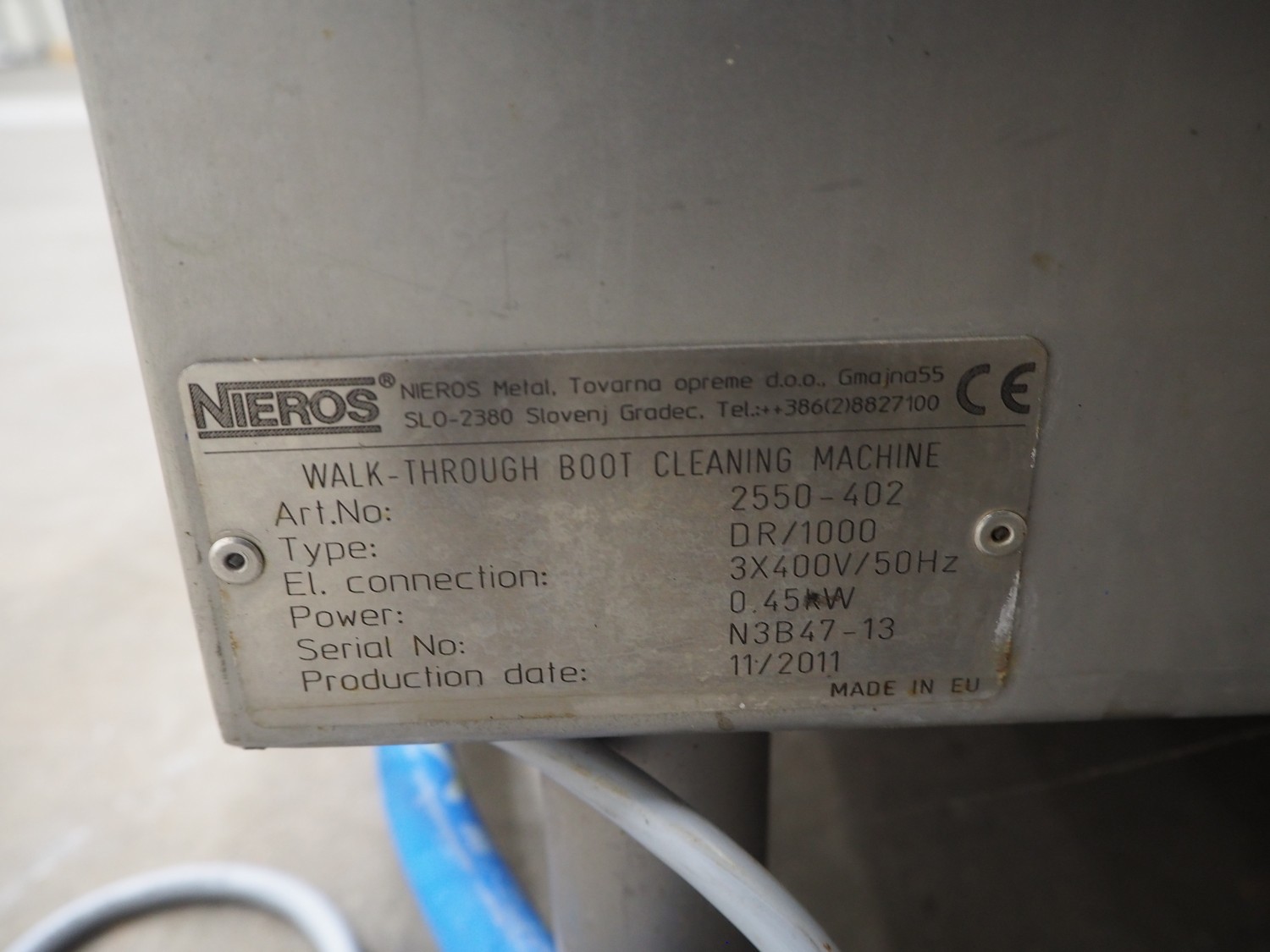 Nieros sole cleaner, type: DR/1000, serial number: N3B47-13, year of construction: 11/2011, 400 V, 3 Ph, 50 Hz, 0.45 kW, brush length: (2x) 800 mm, total dimensions: 1900 mm x 800 mm x 1420 mm.