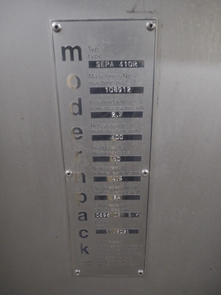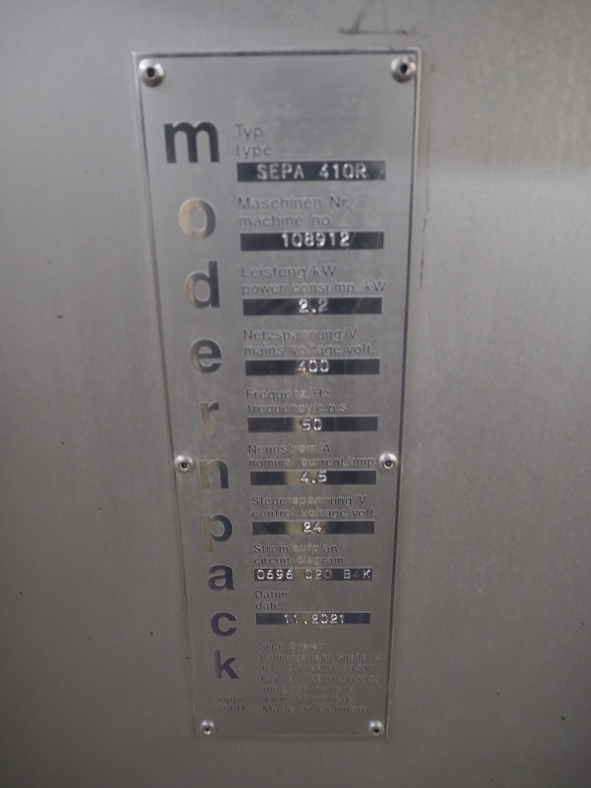 SEPAmatic seperator, type: SEPA 410R, machine number: 108912, year of construction: 11/2021, 400 V, 50 Hz, 4.5 A, roll width: 205 mm, ø perforations: 2 mm, total dimensions: 1300 mm x 1150 mm x 1600 mm.