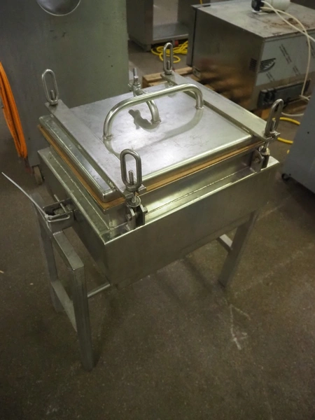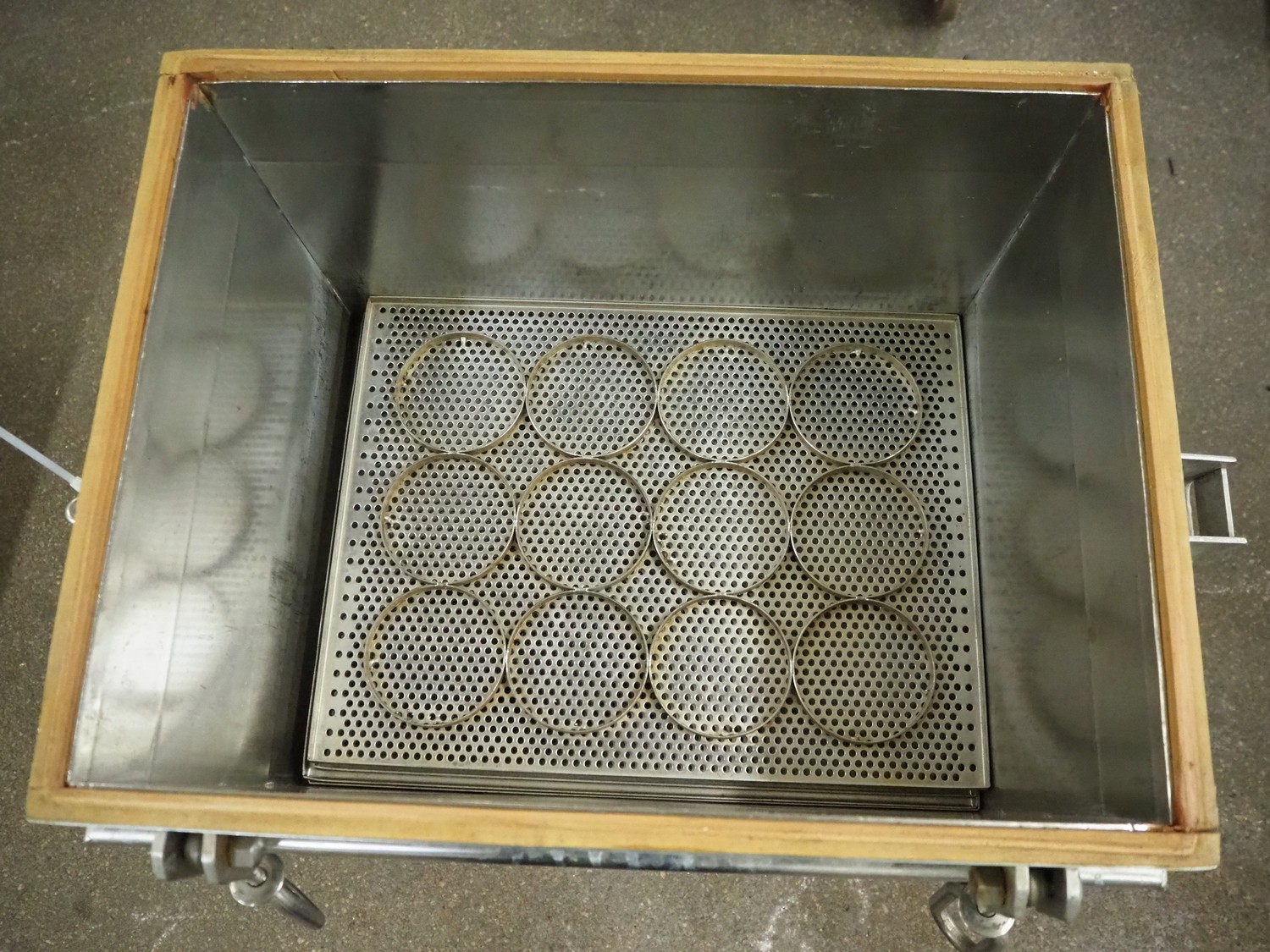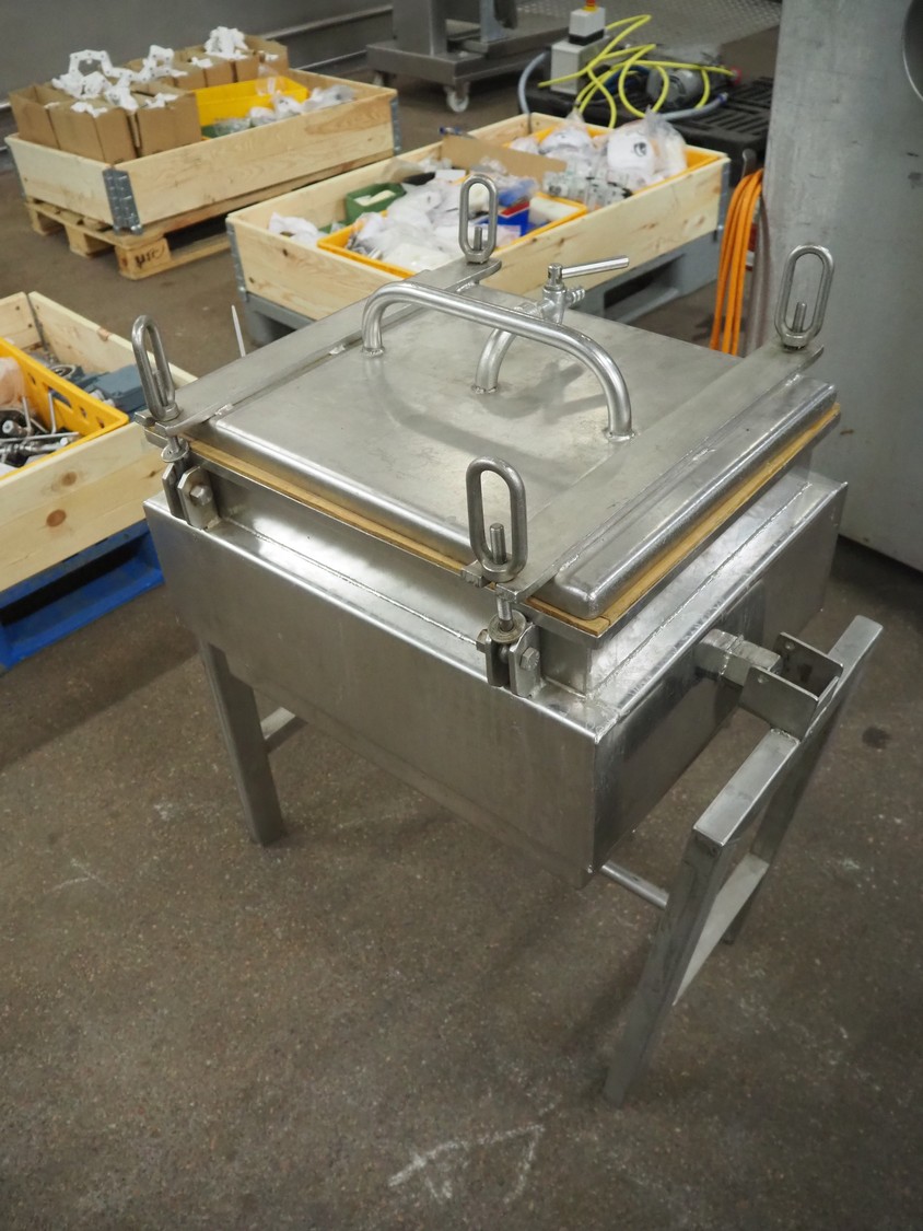 Autoclave, inside dimensions: 500 mm x 400 mm x 330 mm, diameter rings: 100 mm, total dimensions: 700 mm x 500 mm x 860 mm.