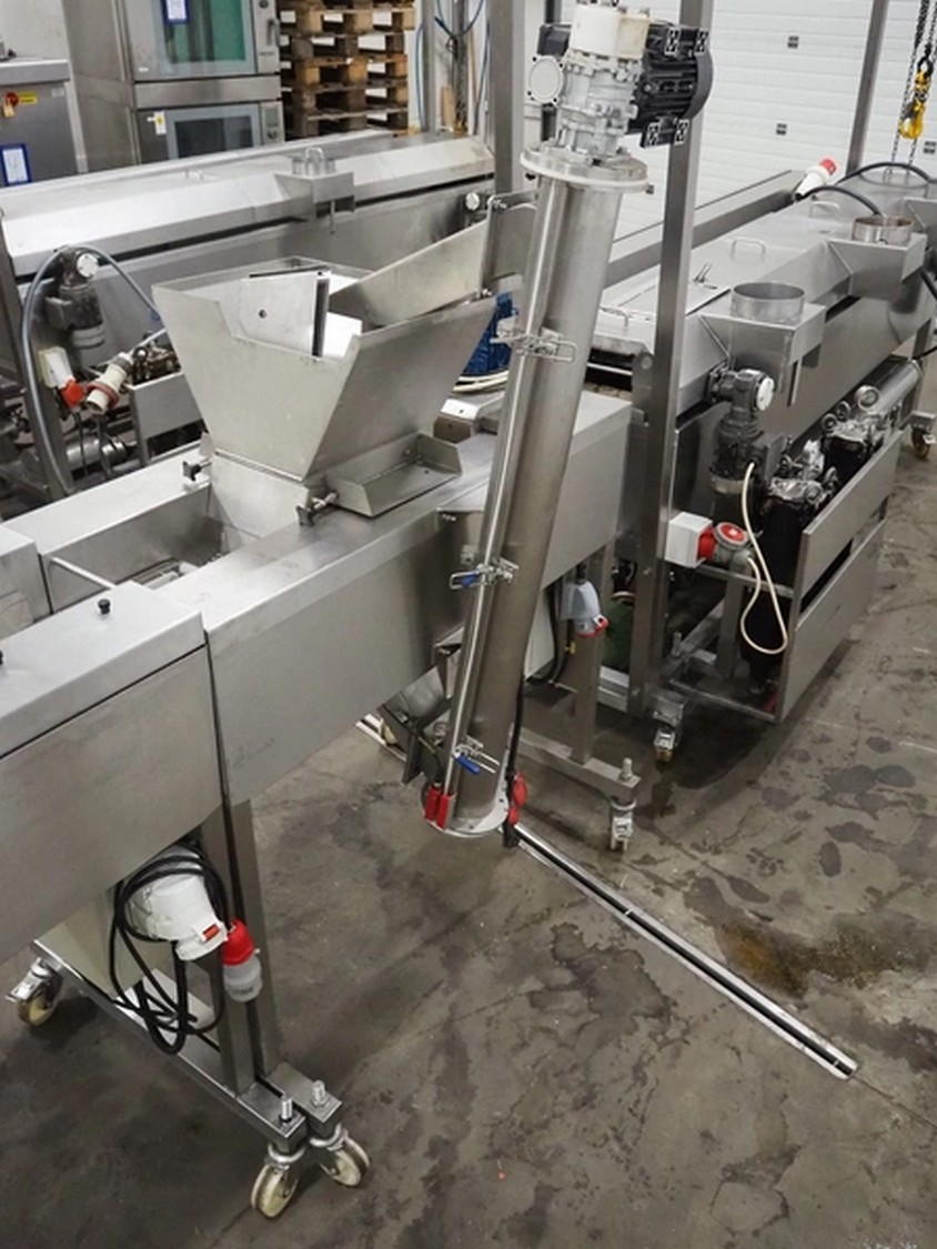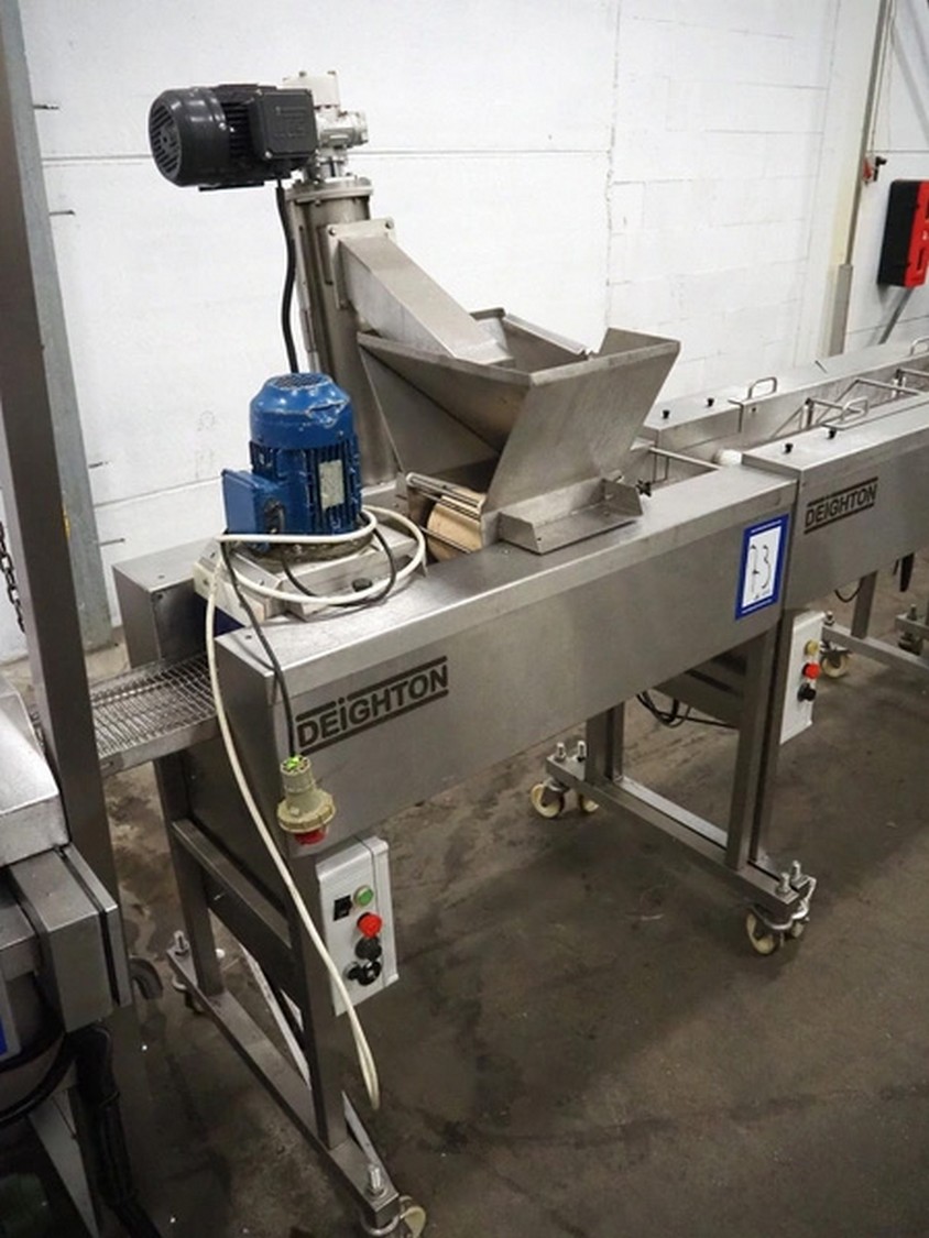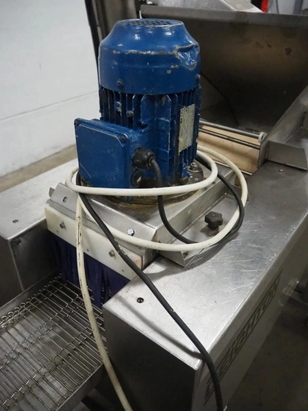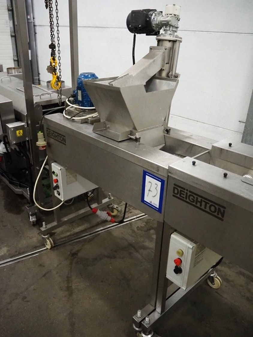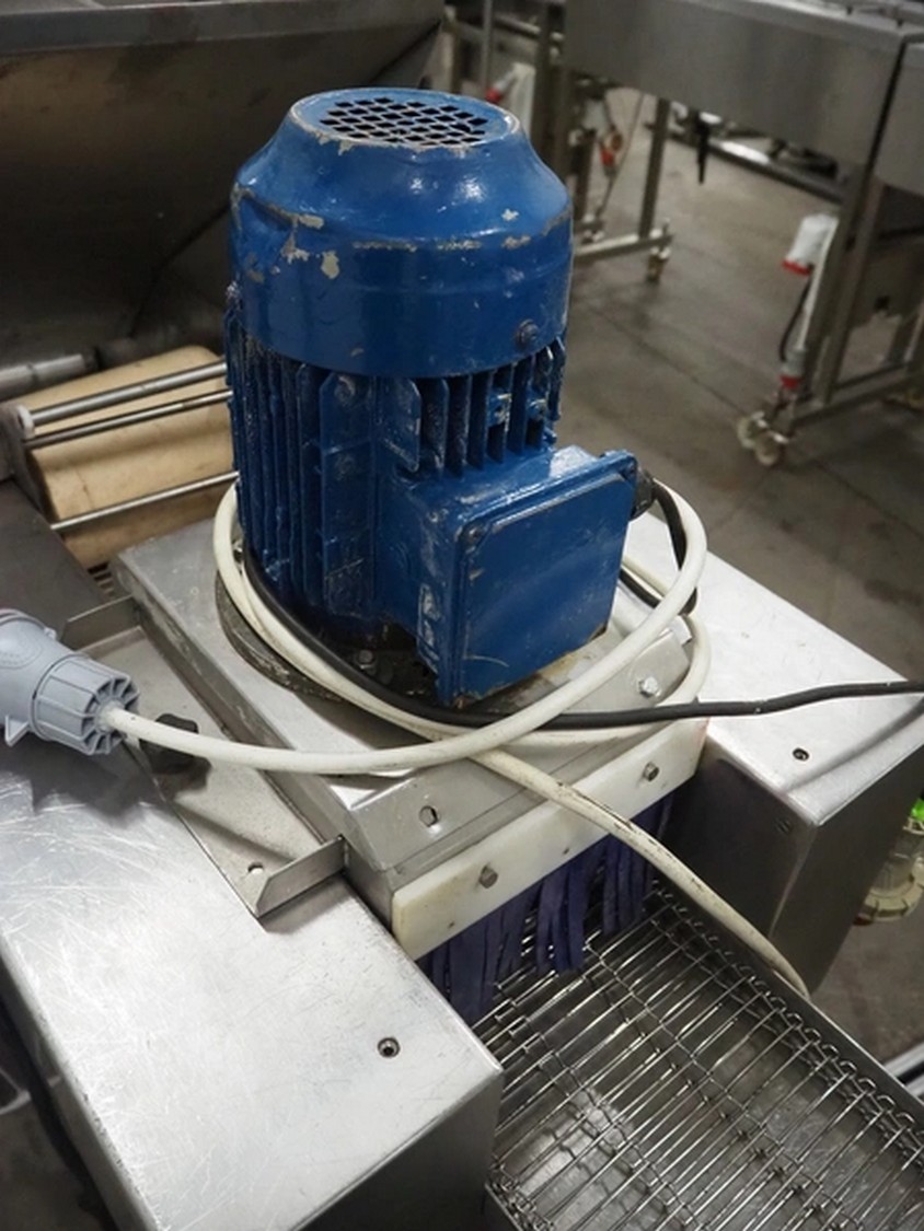 Deighton Manufacturing UK LTD mobile breading machine, s/s mesh belt, belt width: 220 mm, total dimensions: 1500 mm x 800 mm x 1200 mm.