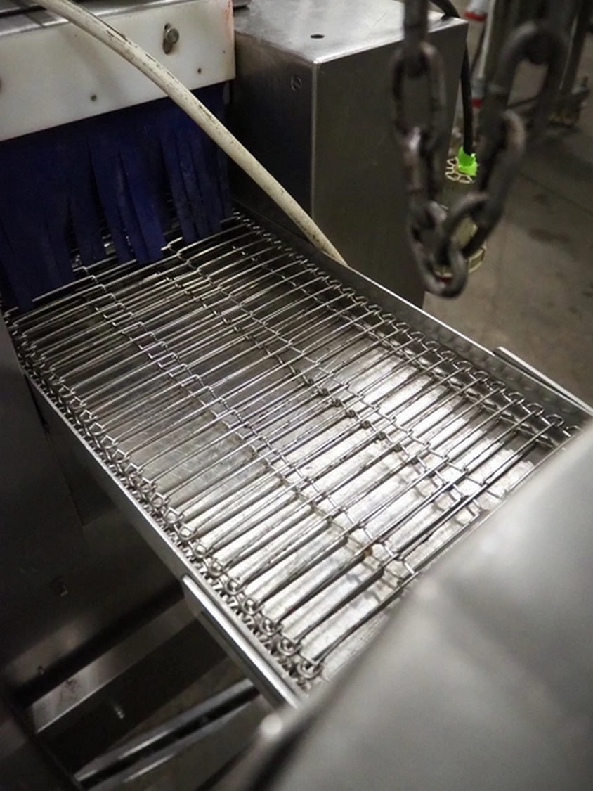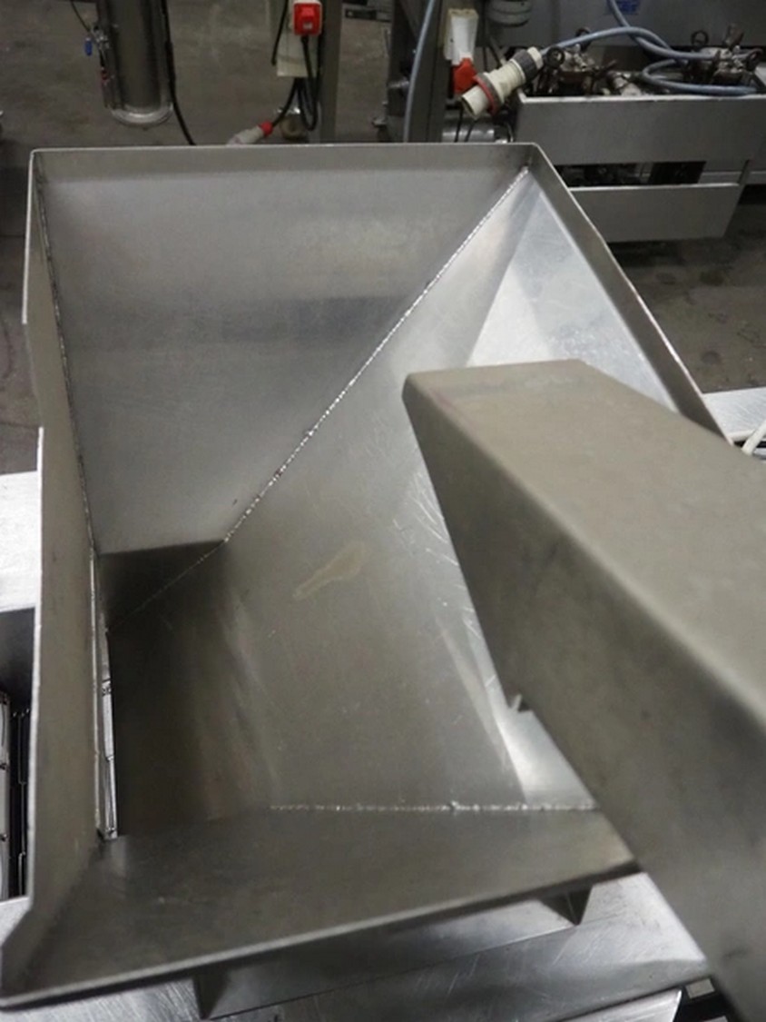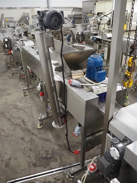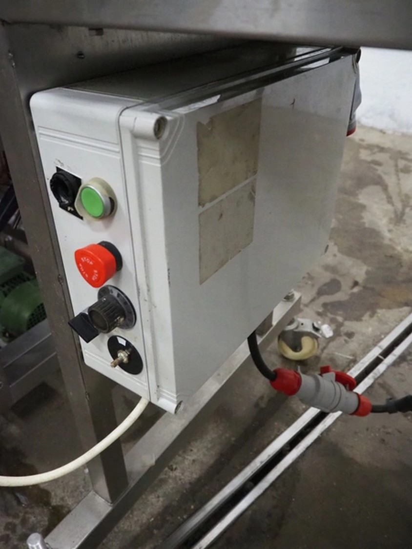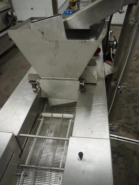 Deighton Manufacturing UK LTD mobile breading machine, s/s mesh belt, belt width: 220 mm, total dimensions: 1500 mm x 800 mm x 1200 mm.