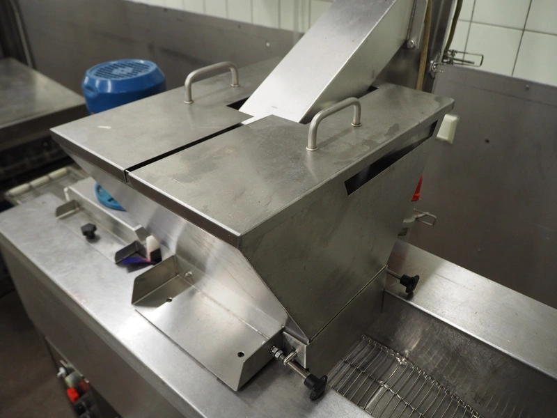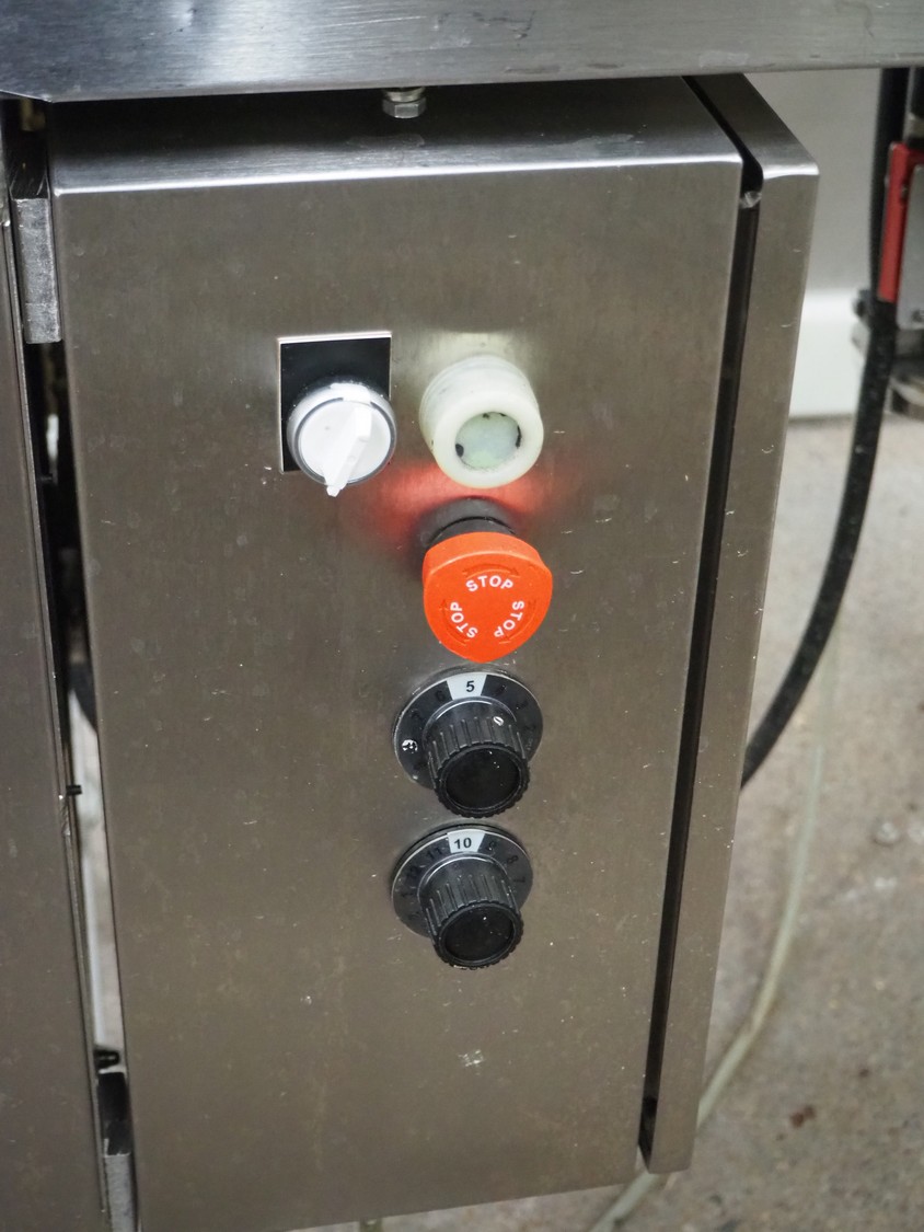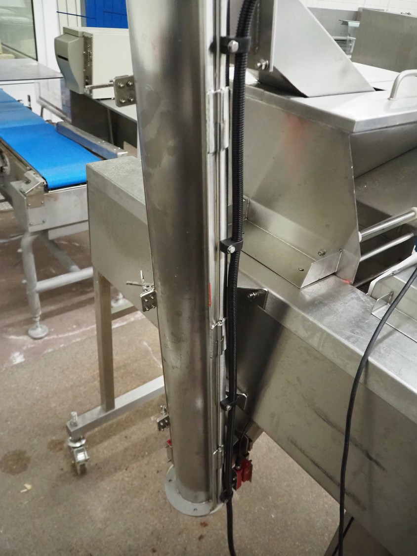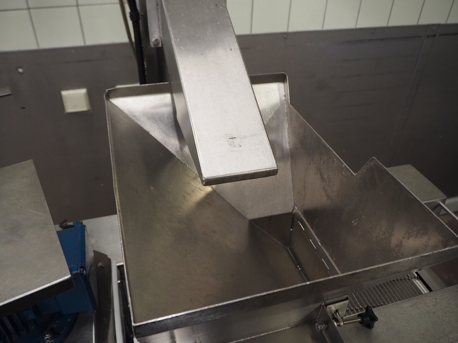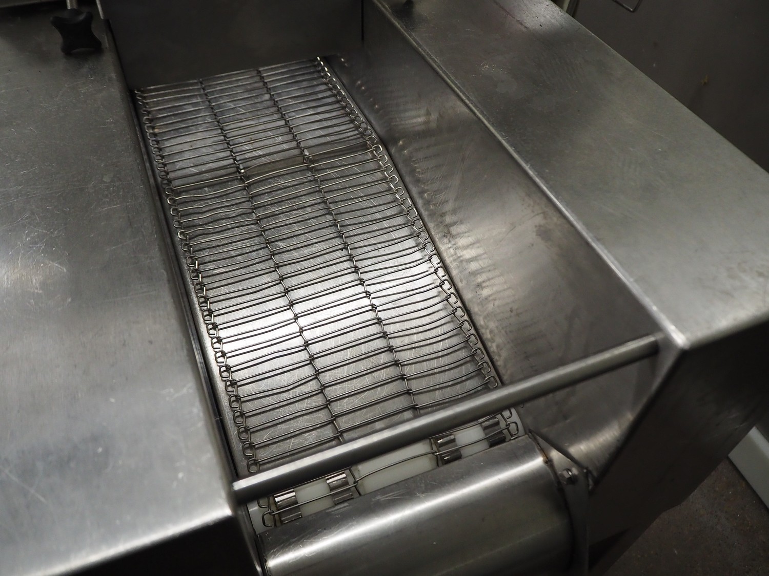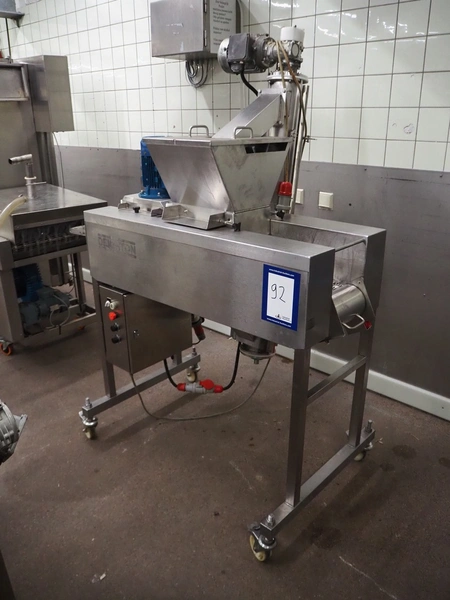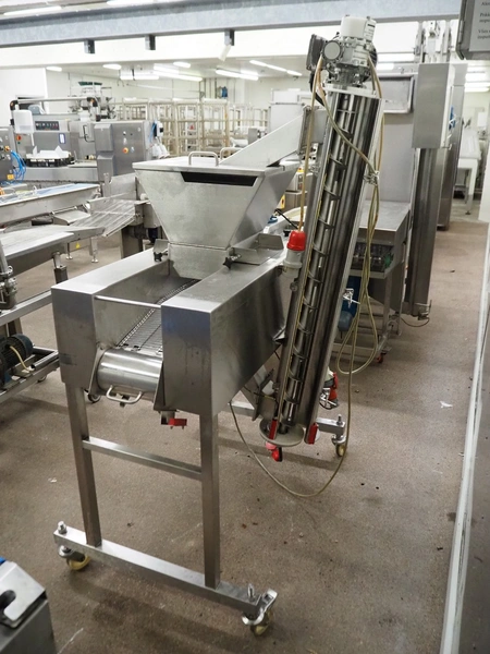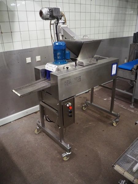 Deighton Manufacturing UK LTD mobile breading machine, s/s mesh belt, belt width: 200 mm, total dimensions: 1600 mm x 900 mm x 1900 mm.