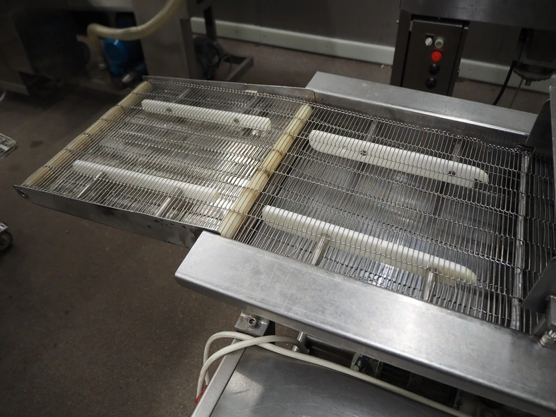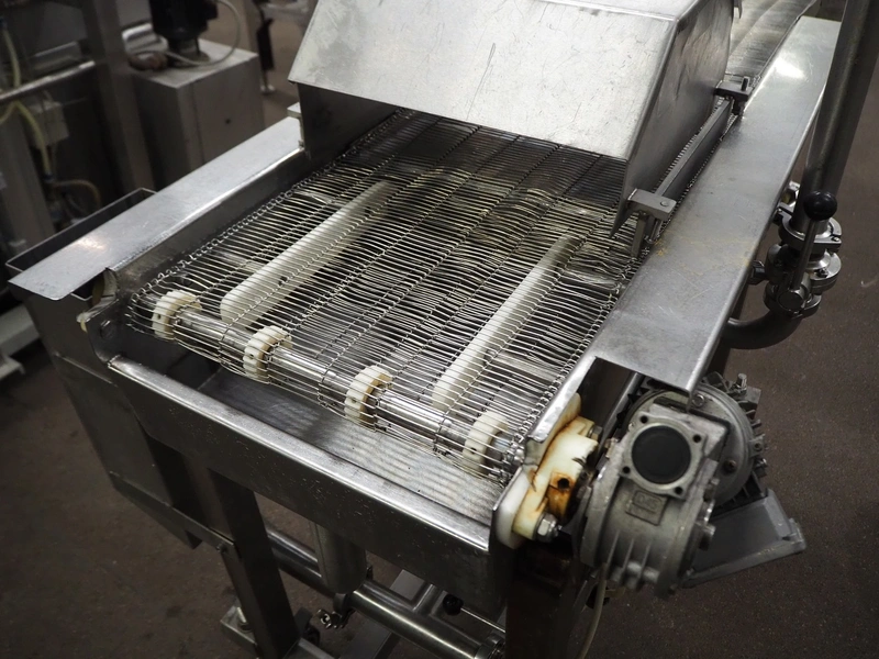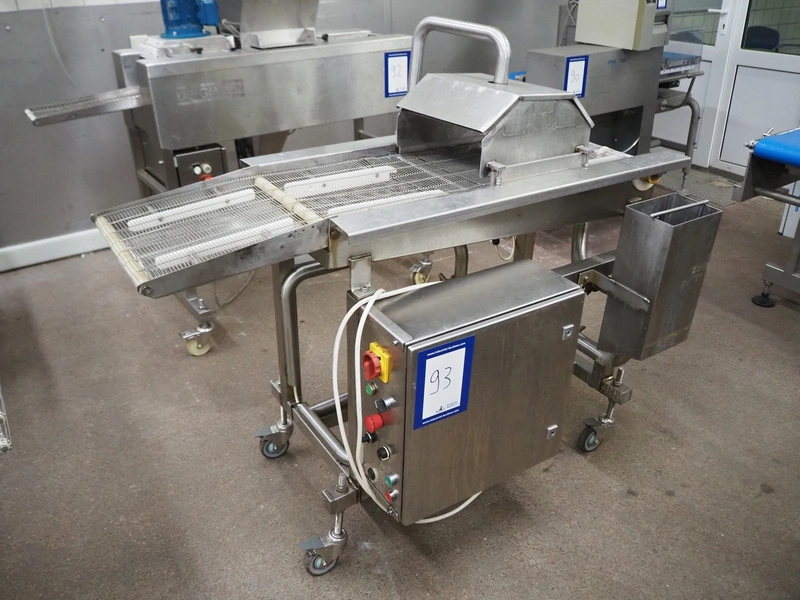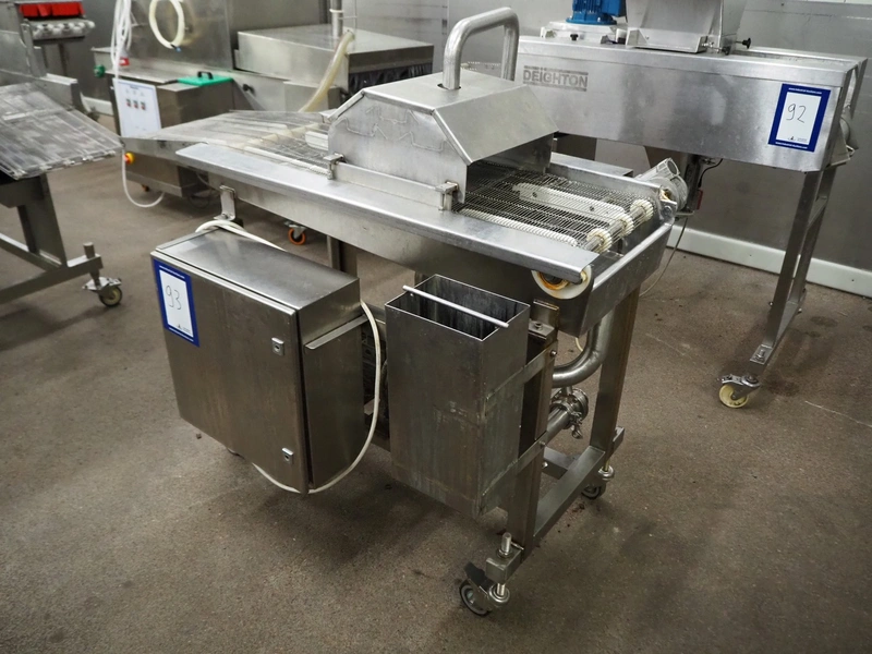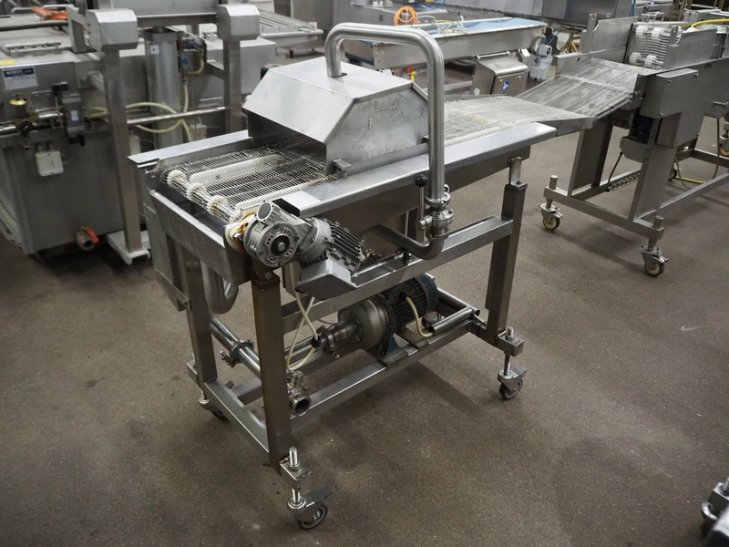 Mobile battering machine, s/s mesh belt, belt width: 400 mm, total dimensions: 1500 mm x 900 mm x 1340 mm.