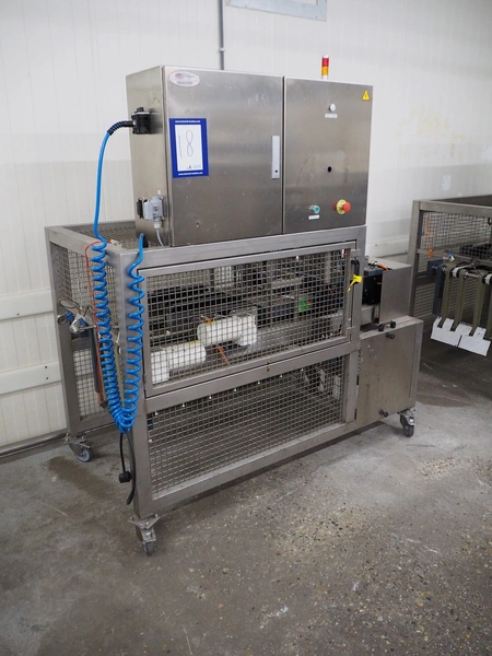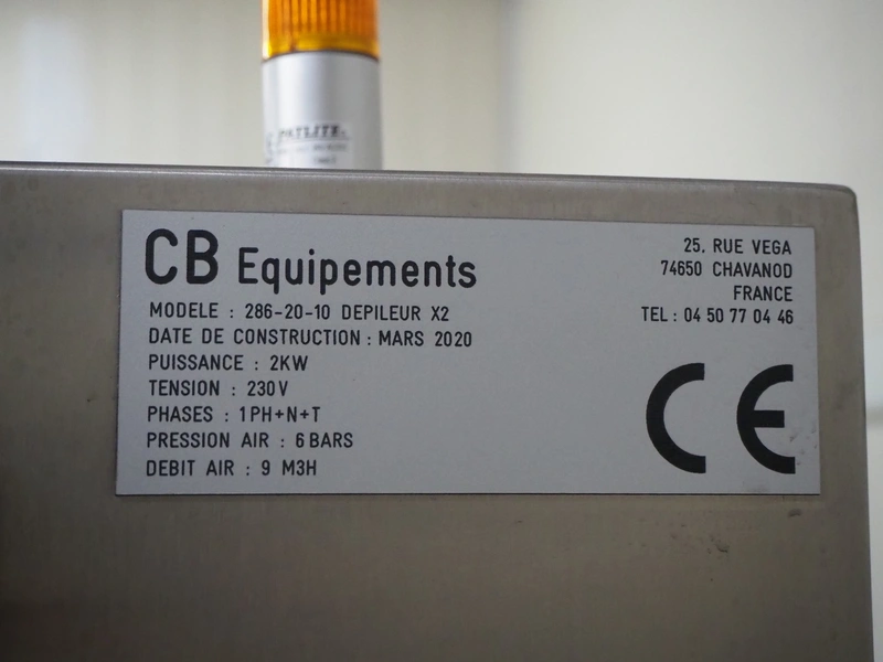 CB Equipments mobile denester, model: 286-20-10 Depileur X2, year of construction: Mars 2020, 230 V, 1 Ph, 2 kW, dye: (2x) 195 mm x 175 mm, total dimensions: 1760 mm x 950 mm x 1940 mm.