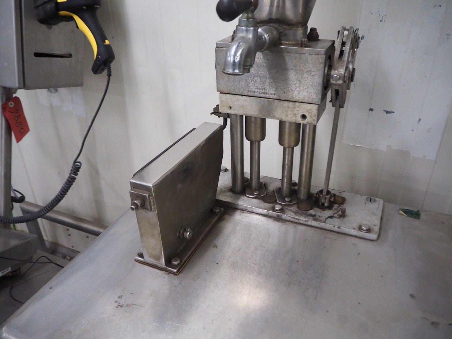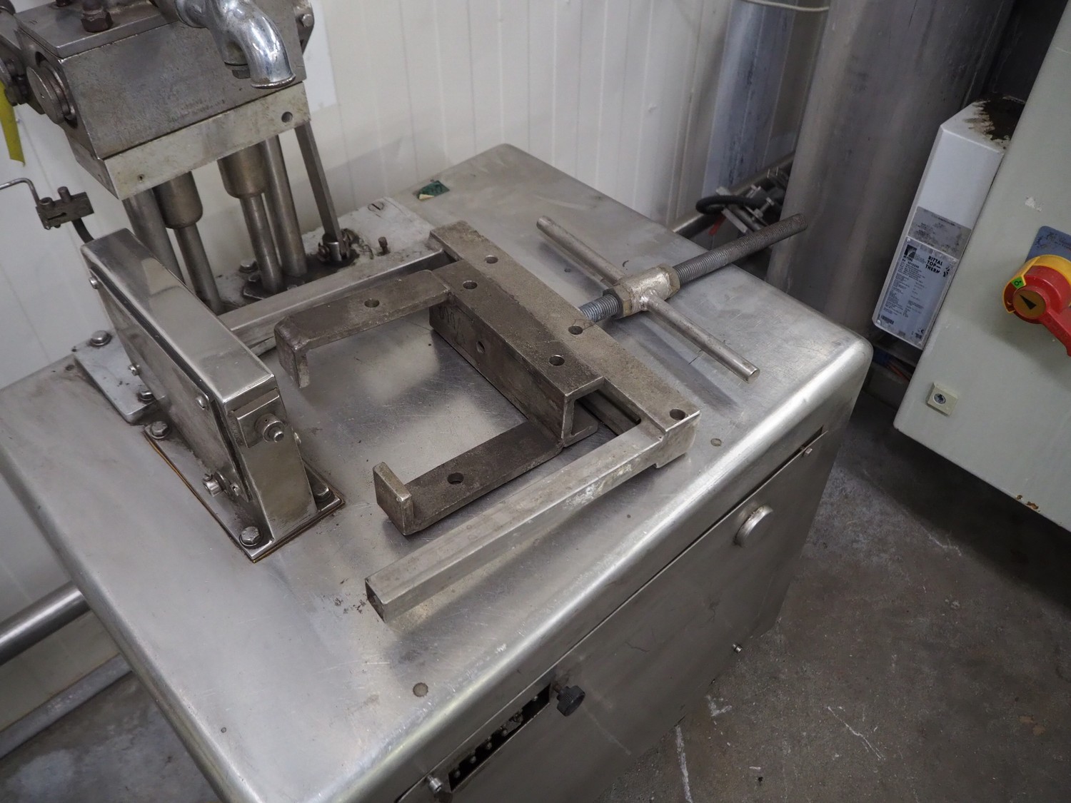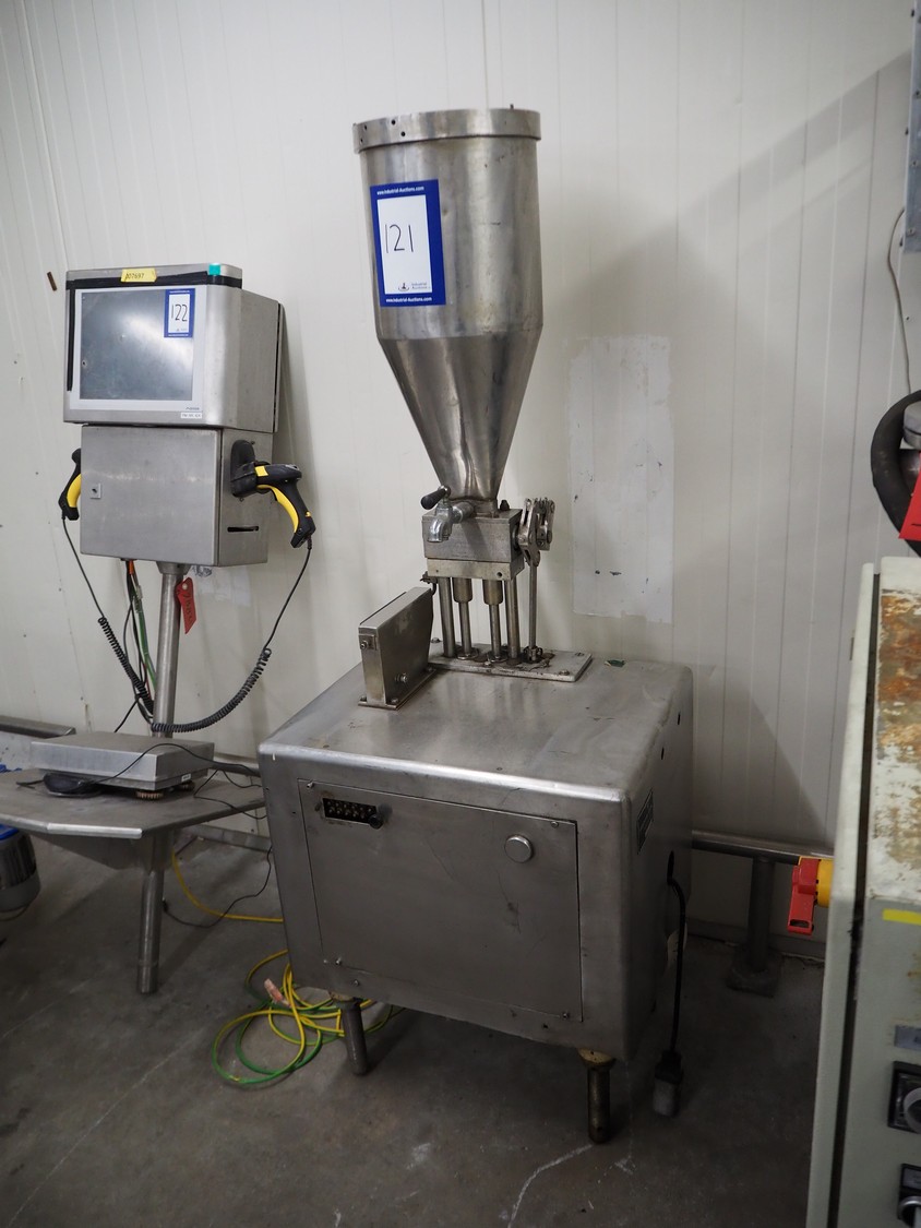 Ganzhorn + Stirn filling machine, number: 452.67, output: Ø 20, dimensions funnel: Ø 320 mm x 670 mm, total dimensions: 700 mm x 600 mm x 1800 mm.