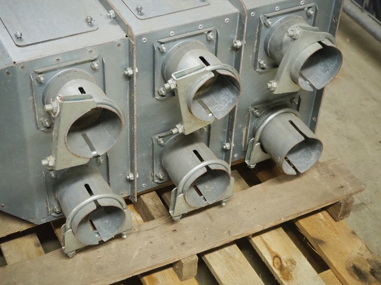 Dosing unit, diameter pipe: 75 mm and (6x) 90 mm, total dimensions: 880 mm x 450 mm x 980 mm.