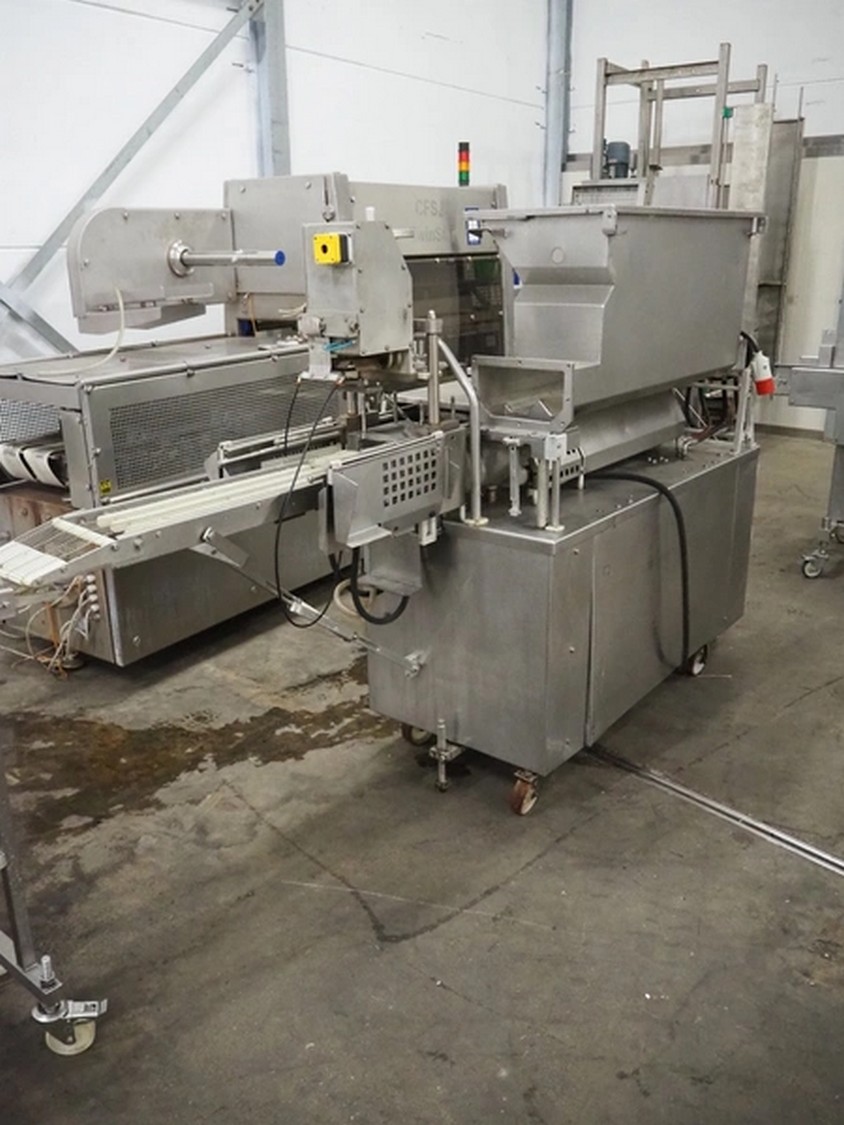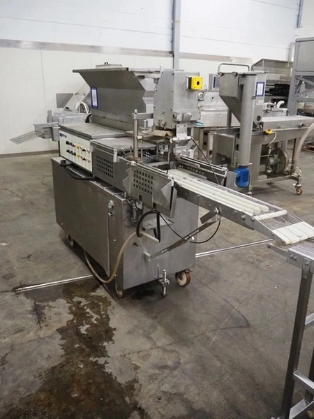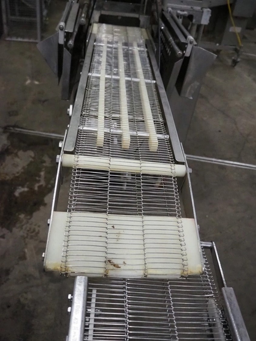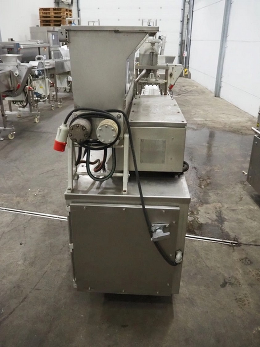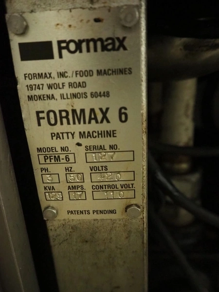 Formax mobile forming machine, model: PFM-6, serial number: 127, 420 V, 3 Ph, 50 Hz, 17 A, s/s mesh belt, belt width: 180 mm, total dimensions: 2800 mm x 800 mm x 1800 mm. Incomplete.