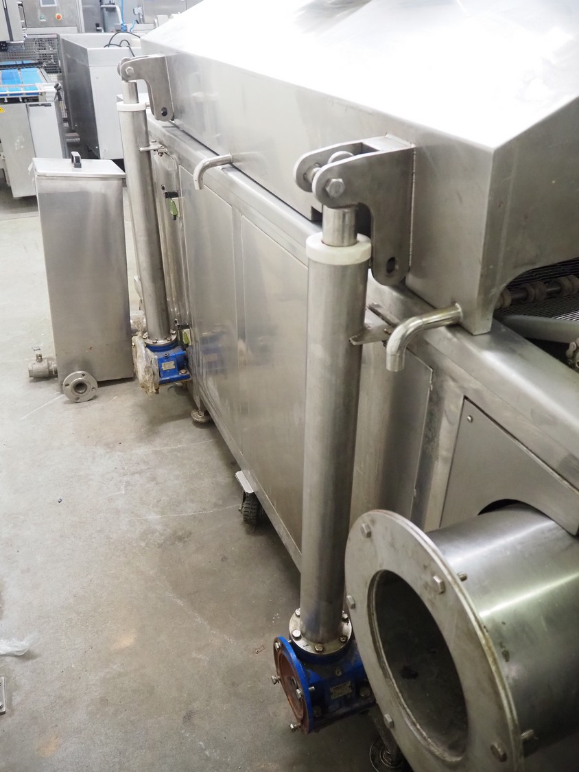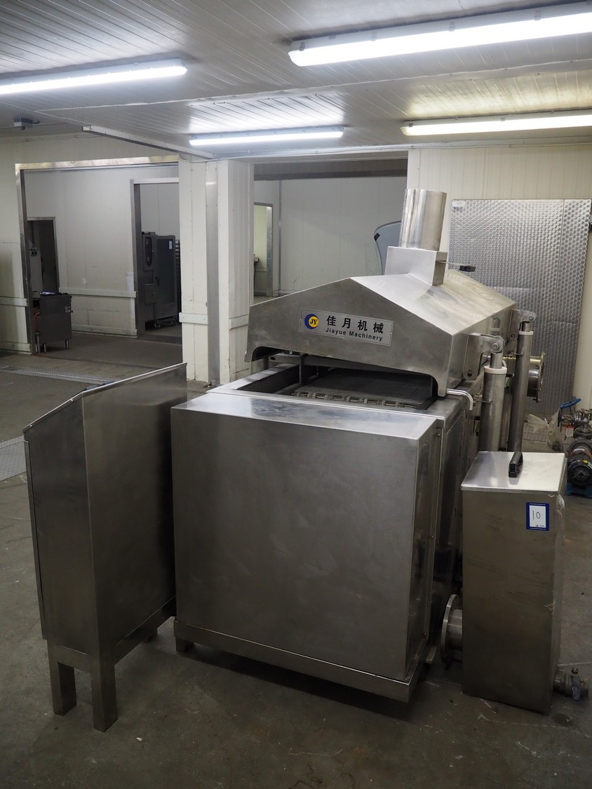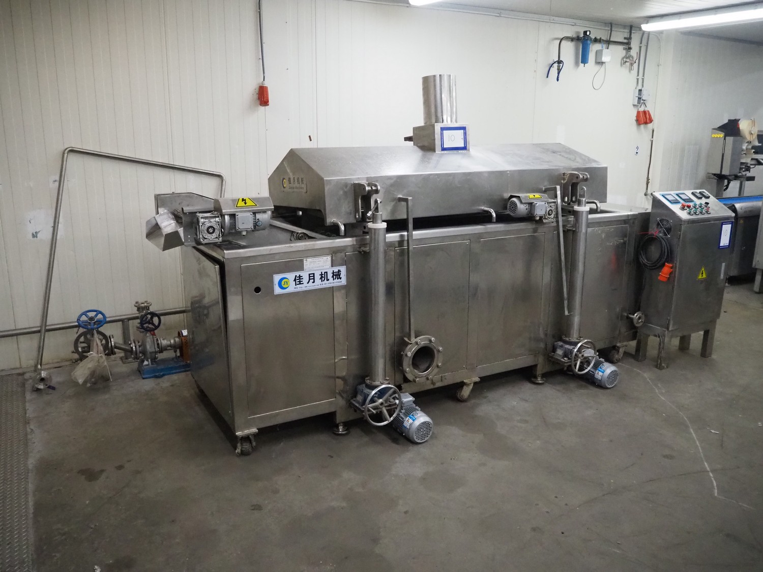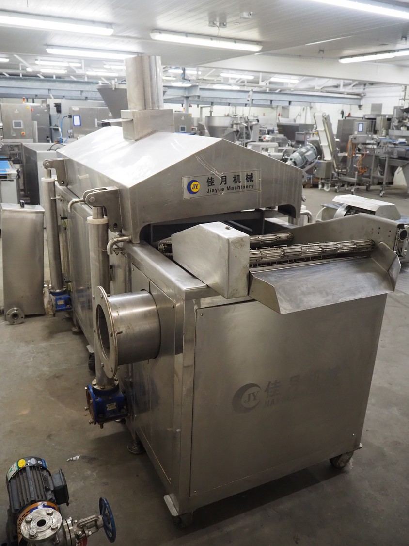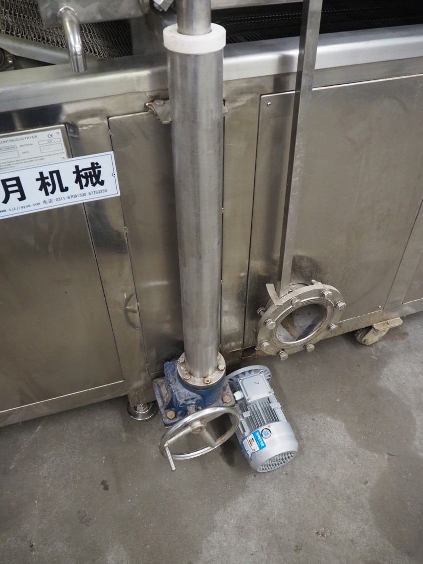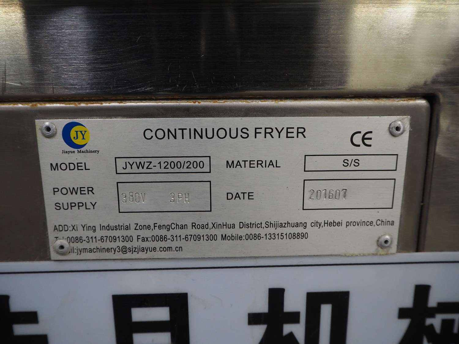Jiayue Machinery mobile continuous fryer, model: JYWZ-1200/200, 380 V, 3 Ph, s/s mesh belt, belt width: 600 mm, distance between dividers: 200 mm, divider height: 15 mm, total dimensions: 3450 mm x 1400 mm x 2000 mm. Including switch cabinet, dimensions: 600 mm x 260 mm x 1250 mm.