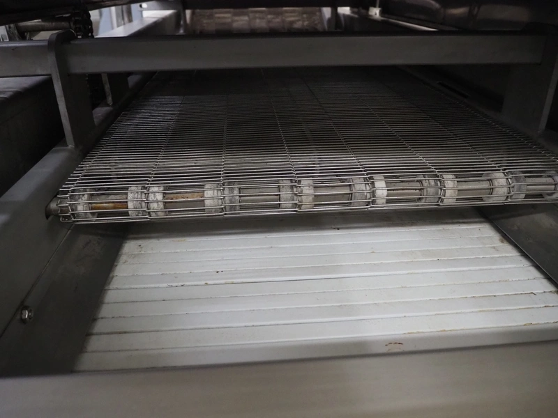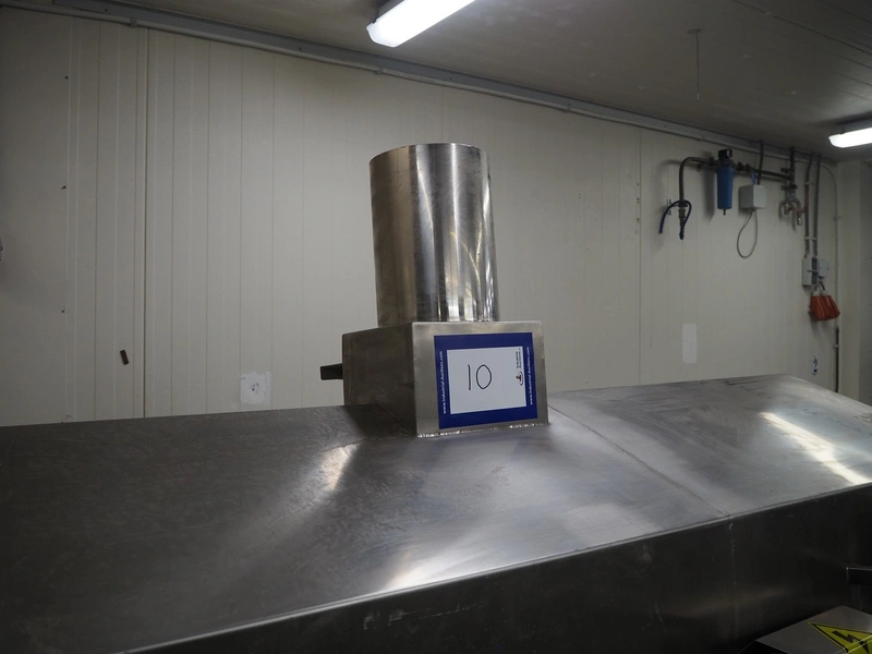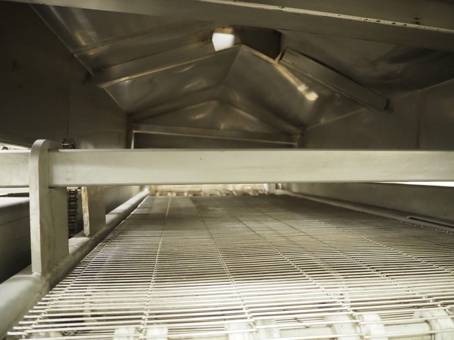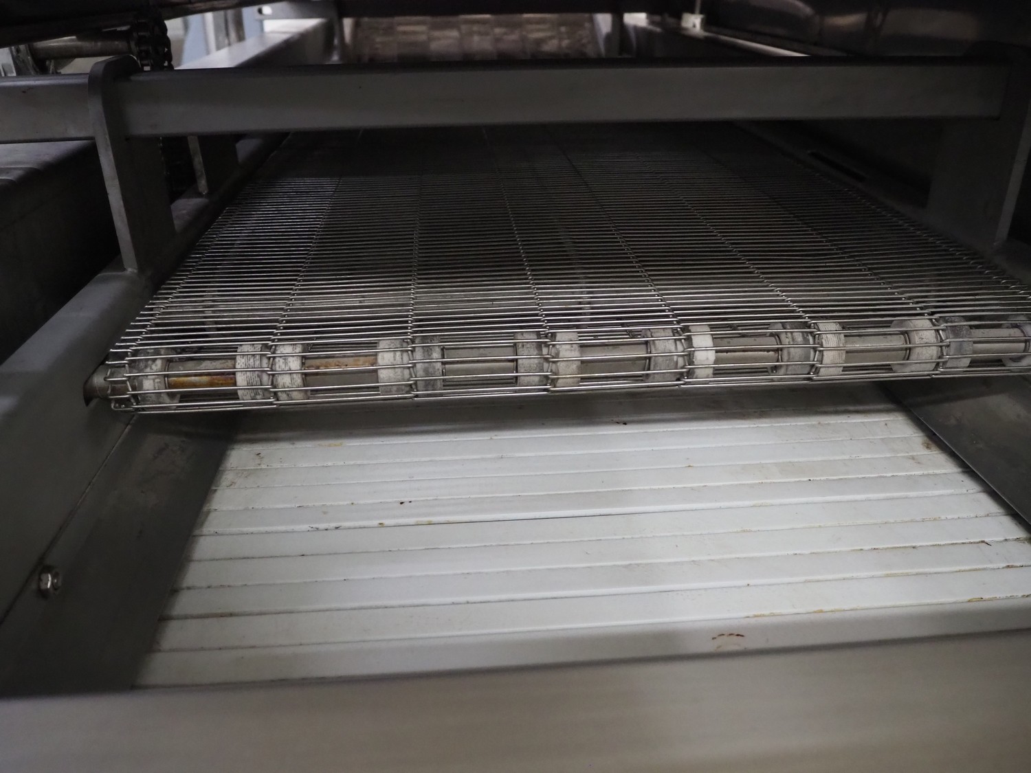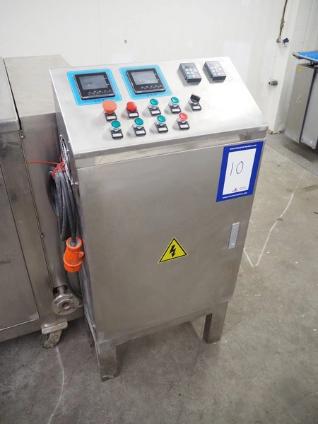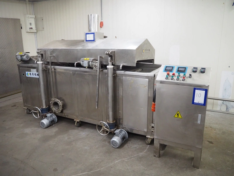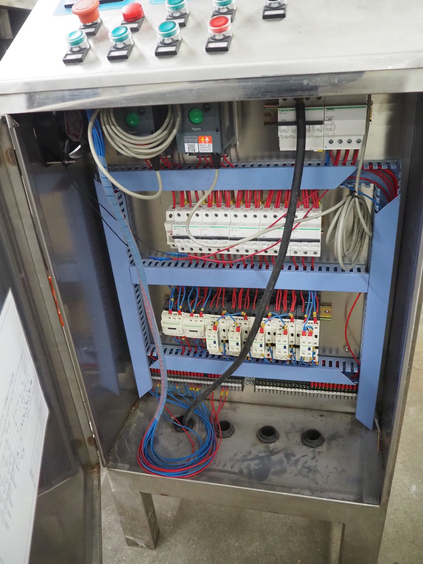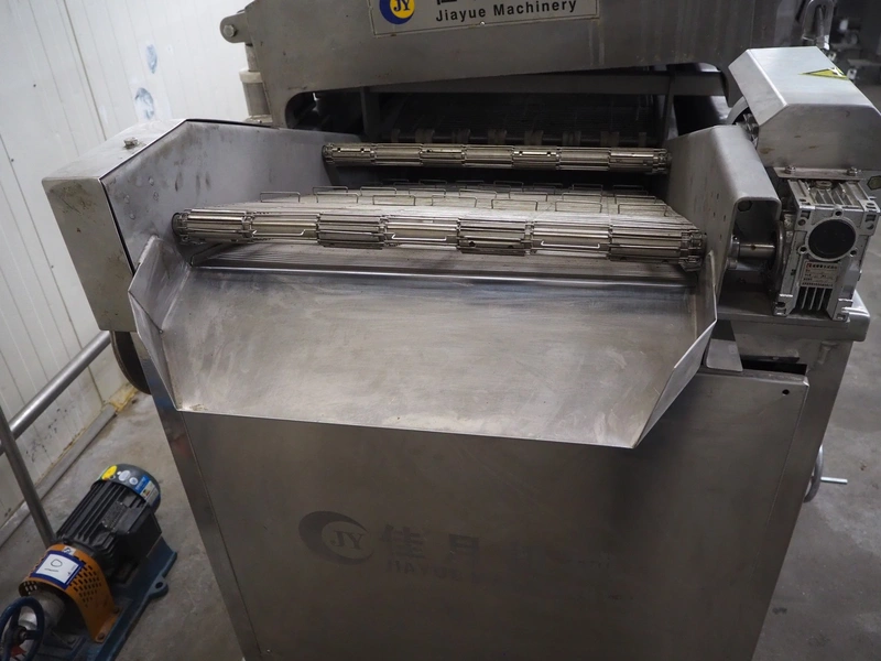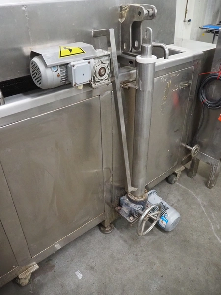 Jiayue Machinery mobile continuous fryer, model: JYWZ-1200/200, 380 V, 3 Ph, s/s mesh belt, belt width: 600 mm, distance between dividers: 200 mm, divider height: 15 mm, total dimensions: 3450 mm x 1400 mm x 2000 mm. Including switch cabinet, dimensions: 600 mm x 260 mm x 1250 mm.