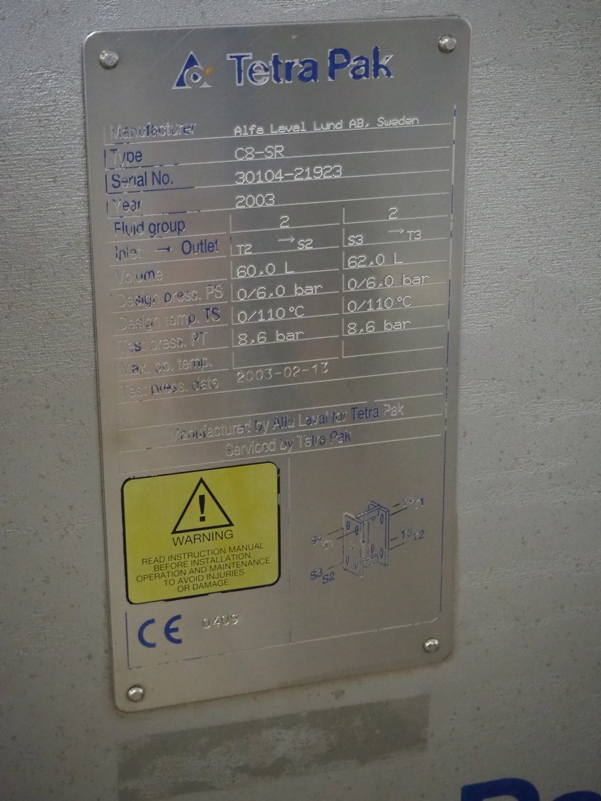Tetra Pak heat exchanger, type: C8-SR, serial number: 30104-21923, year of construction: 2003, volume: 60/62 liter, dimensions: 1380 mm x 500 mm x 1800 mm.