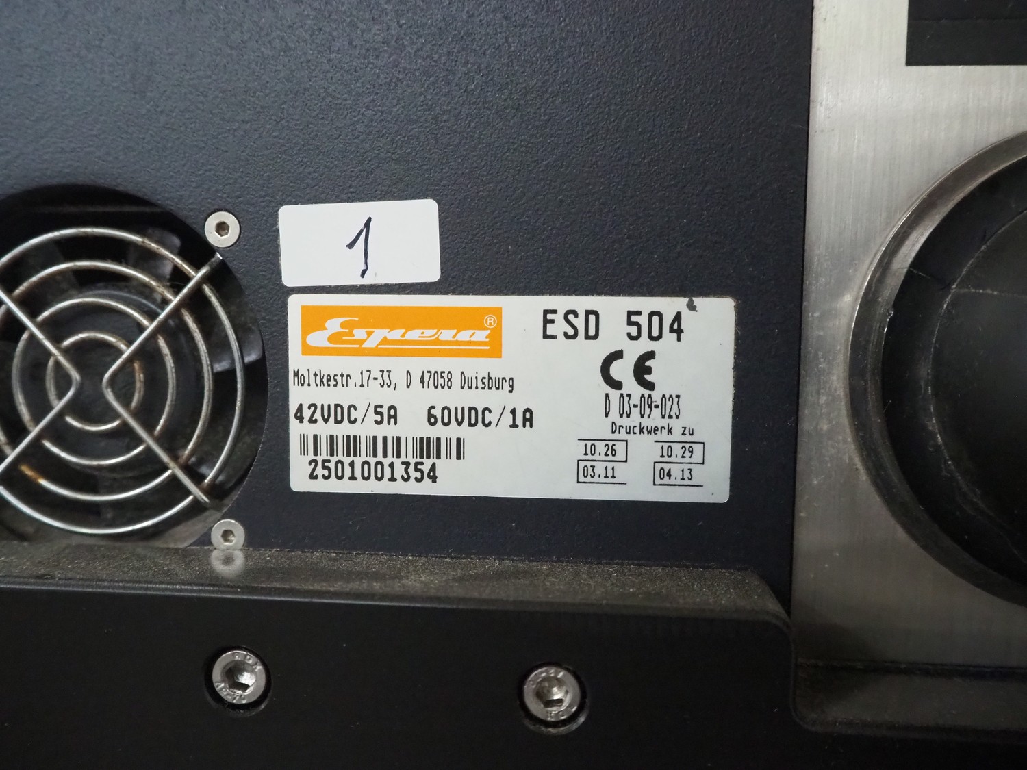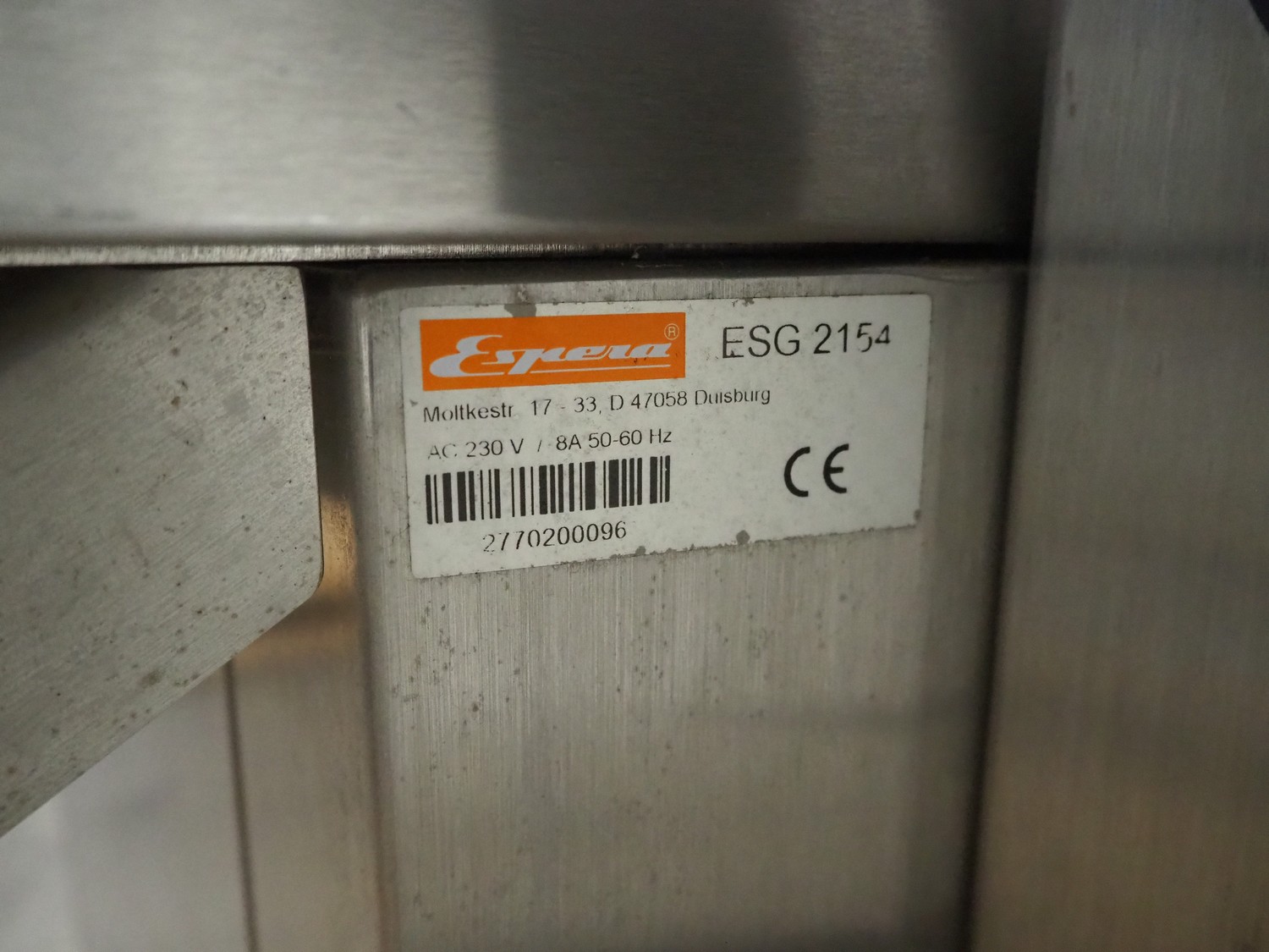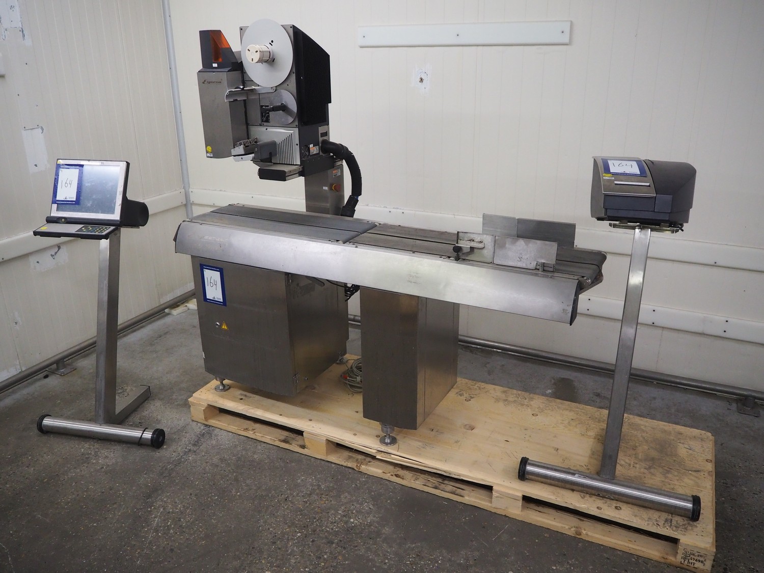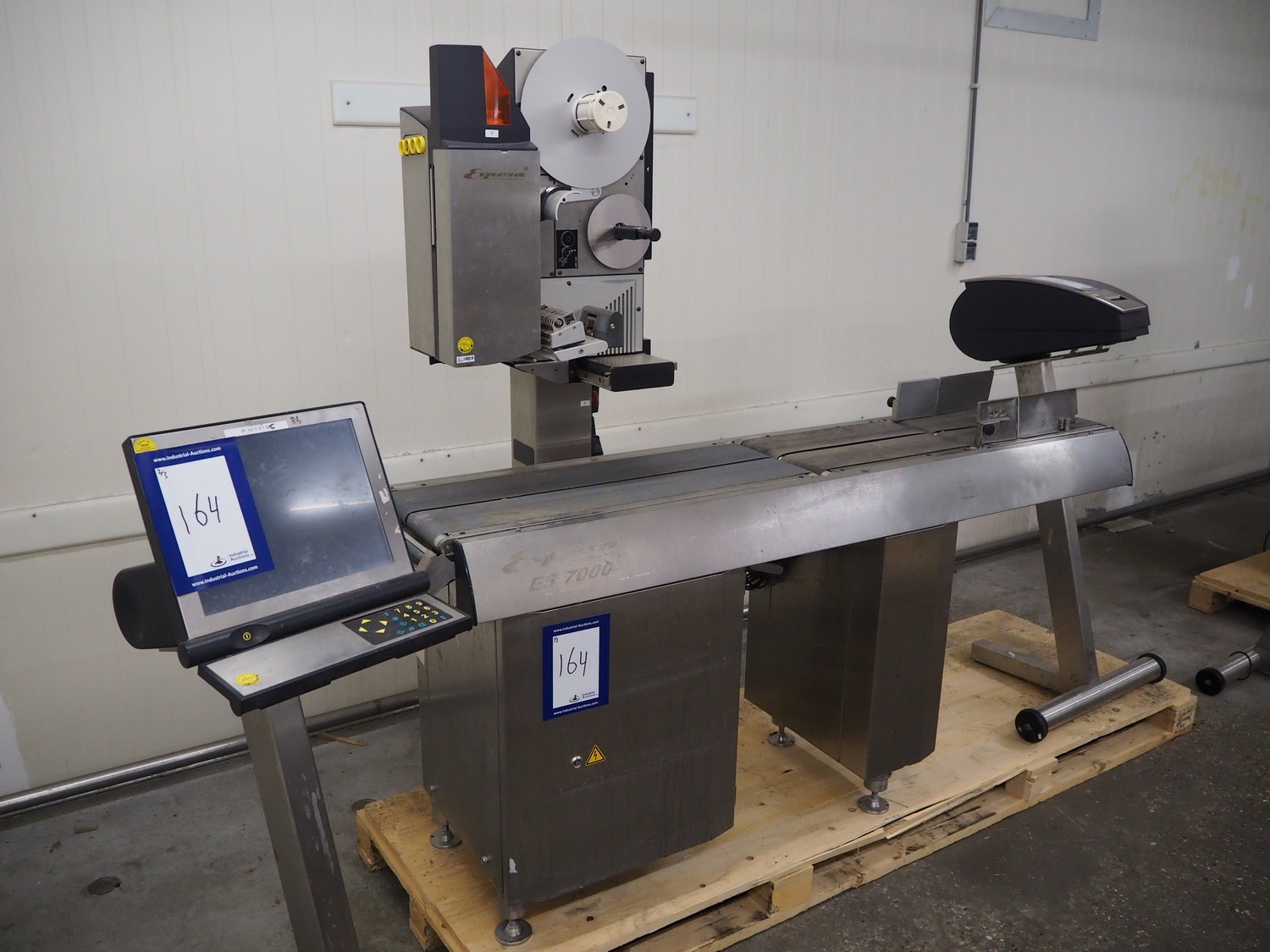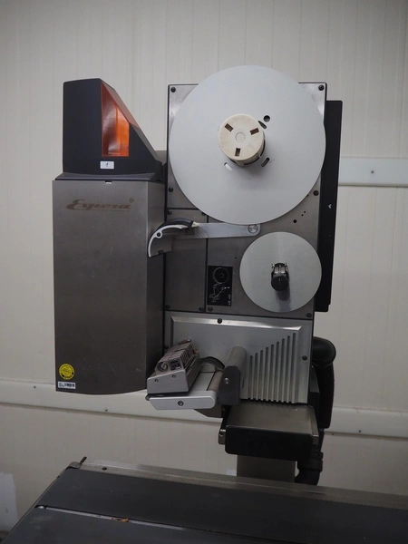 Espera labelling machine, model: ES 7000, model labeller: ESD 504, plastic belt, belt with: (2x) 145 mm, total dimensions: 2050 mm x 750 mm x 1800 mm. Including Espera control panel, model: ESC 964 and Espera label printer, model: ESD 104, dimensions: 680 mm x 470 mm x 1370 mm and 680 mm x 580 mm x 1360 mm.