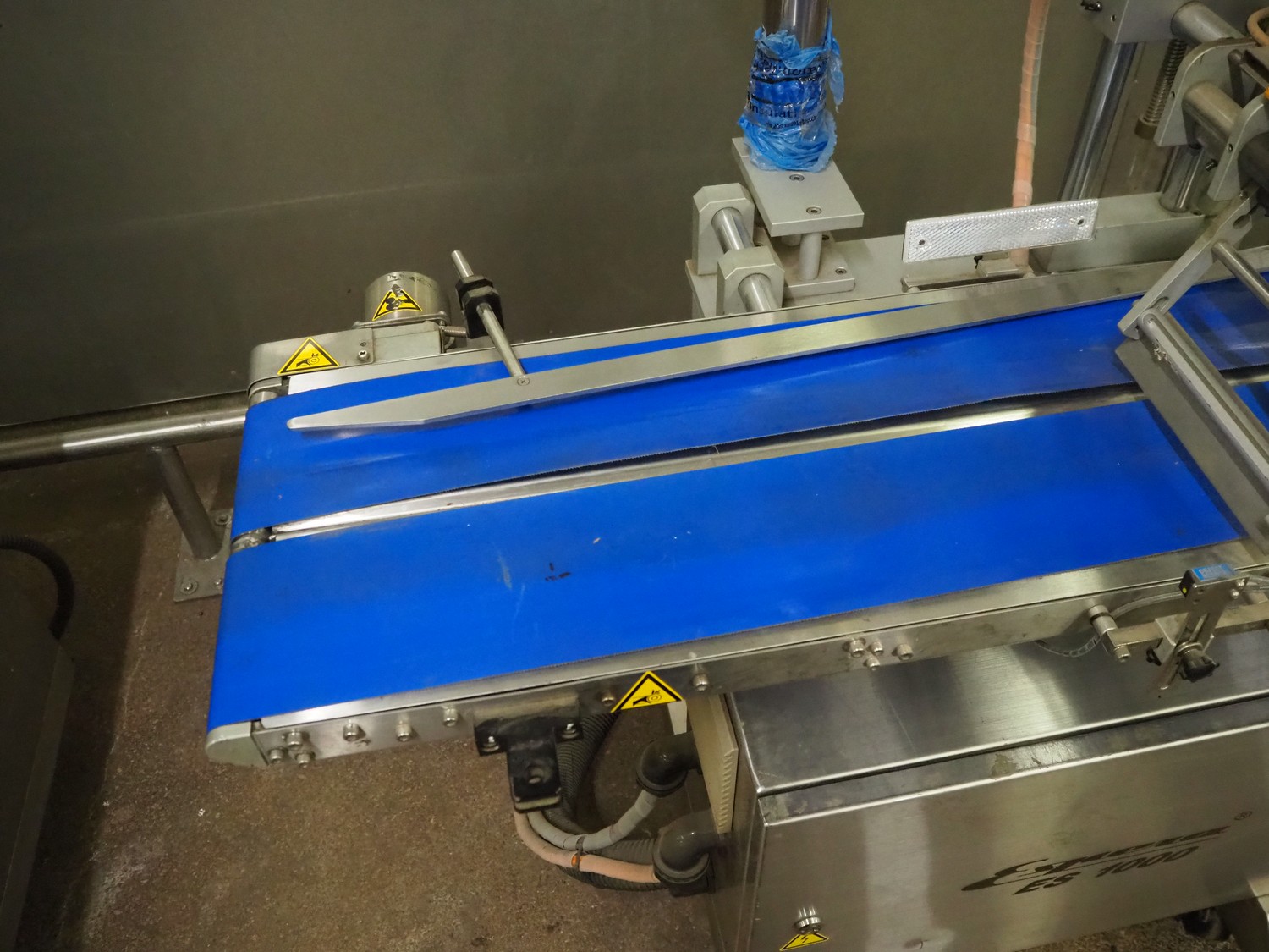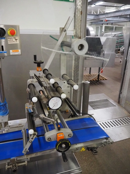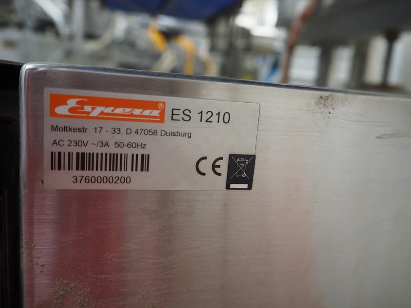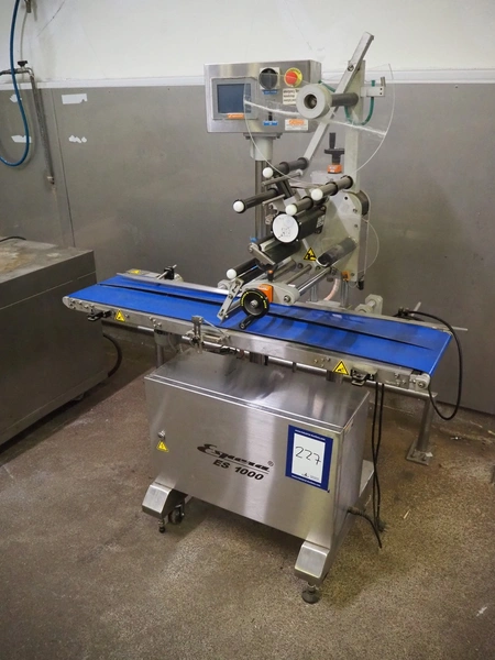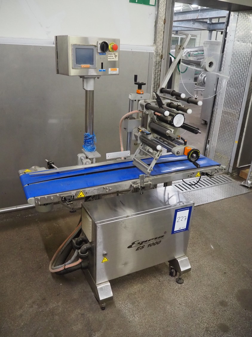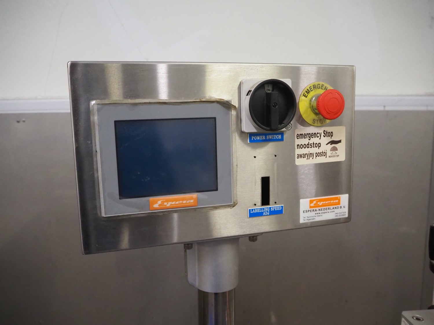 Espera labelling machine, model: ES 1000, type: ES 1210, 230 V, 50-60 Hz, 3 A, plastic belt, belt width: (2x) 140 mm, total dimensions: 1300 mm x 700 mm x 1750 mm.