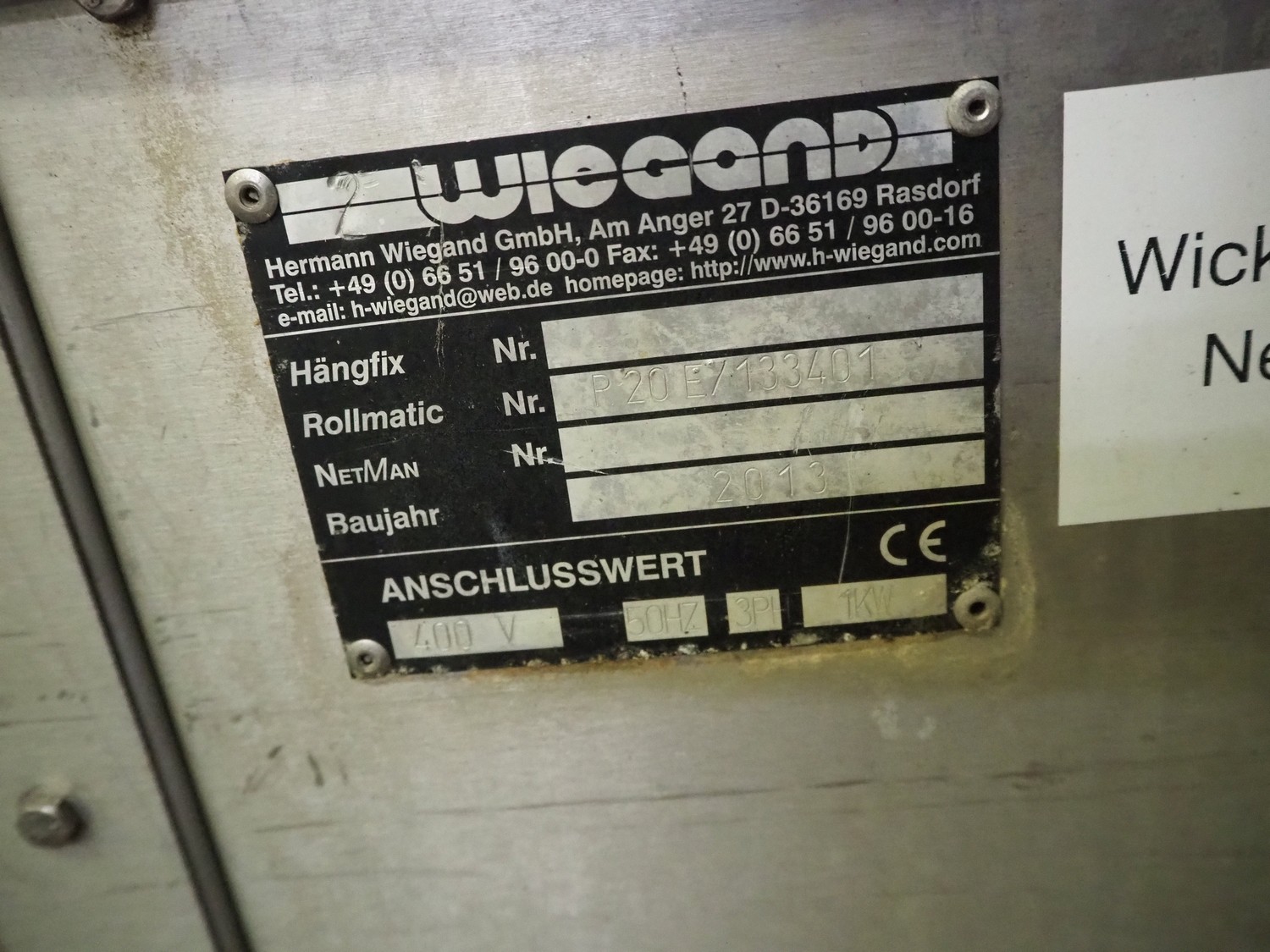 Wiegand mobile binding machine, number: R 20 E/113401, year of construction: 2013, 400 V, 3 Ph, 50 Hz, 1 kW, clearance: Ø 180 mm, total dimensions: 650 m x 540 mm x 1340 mm.