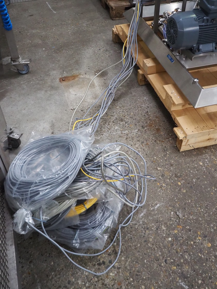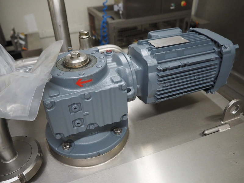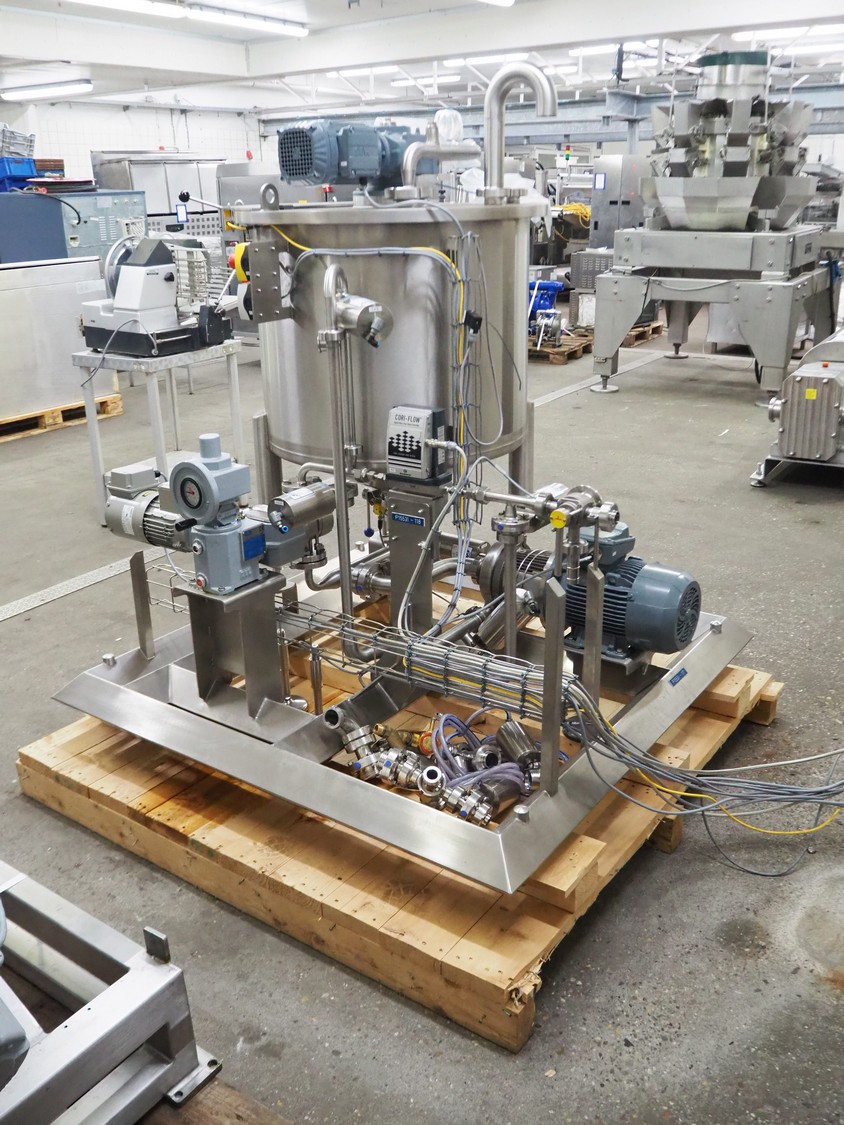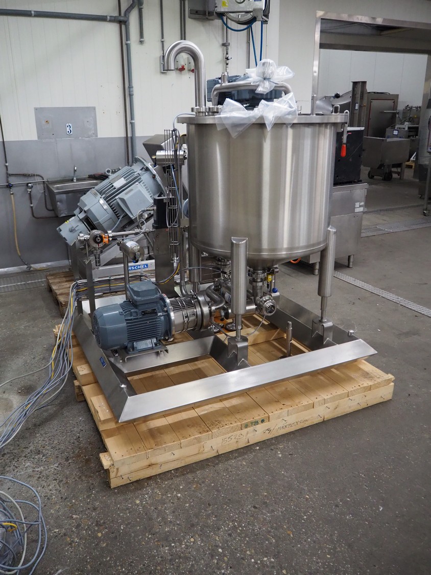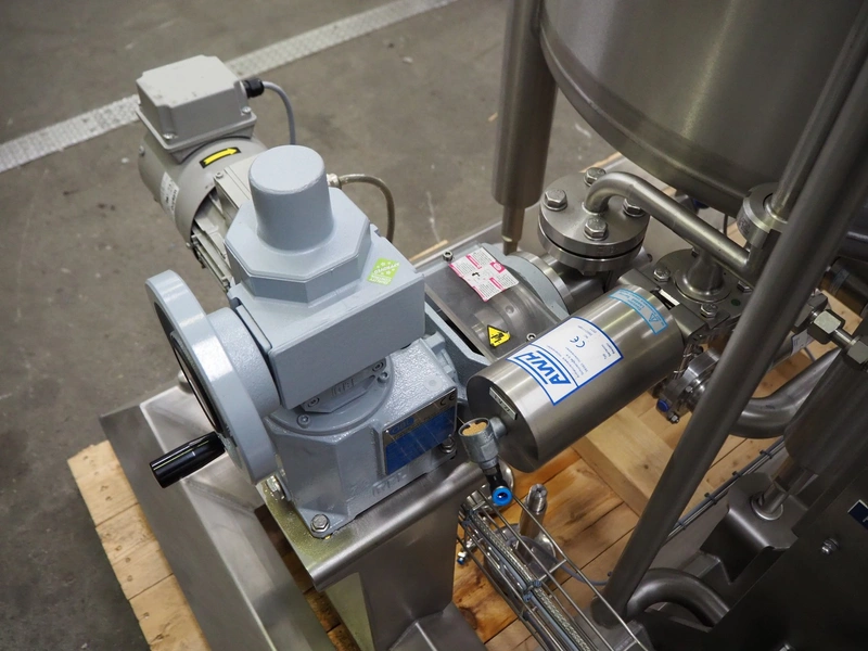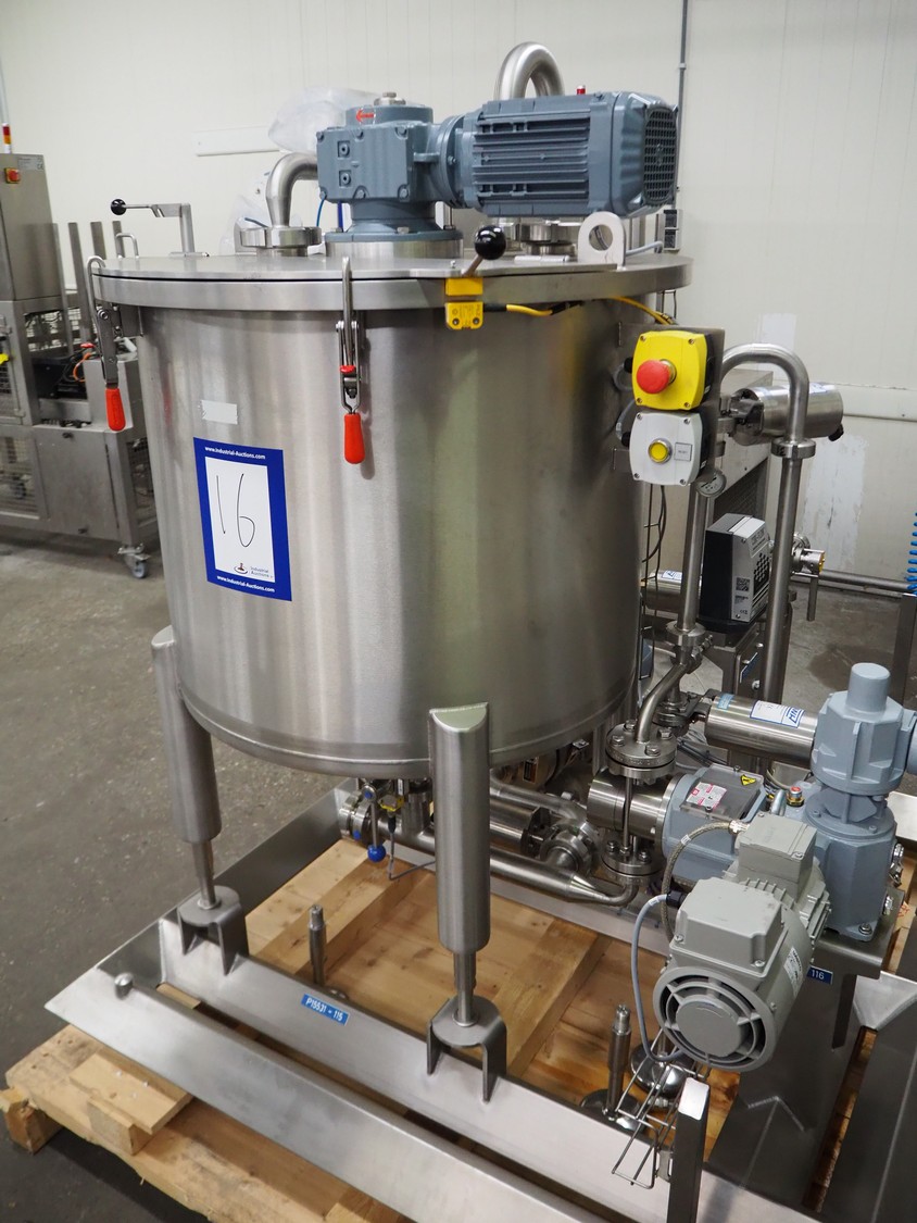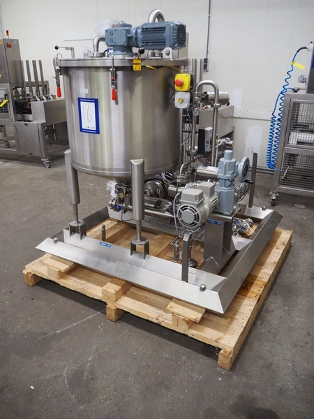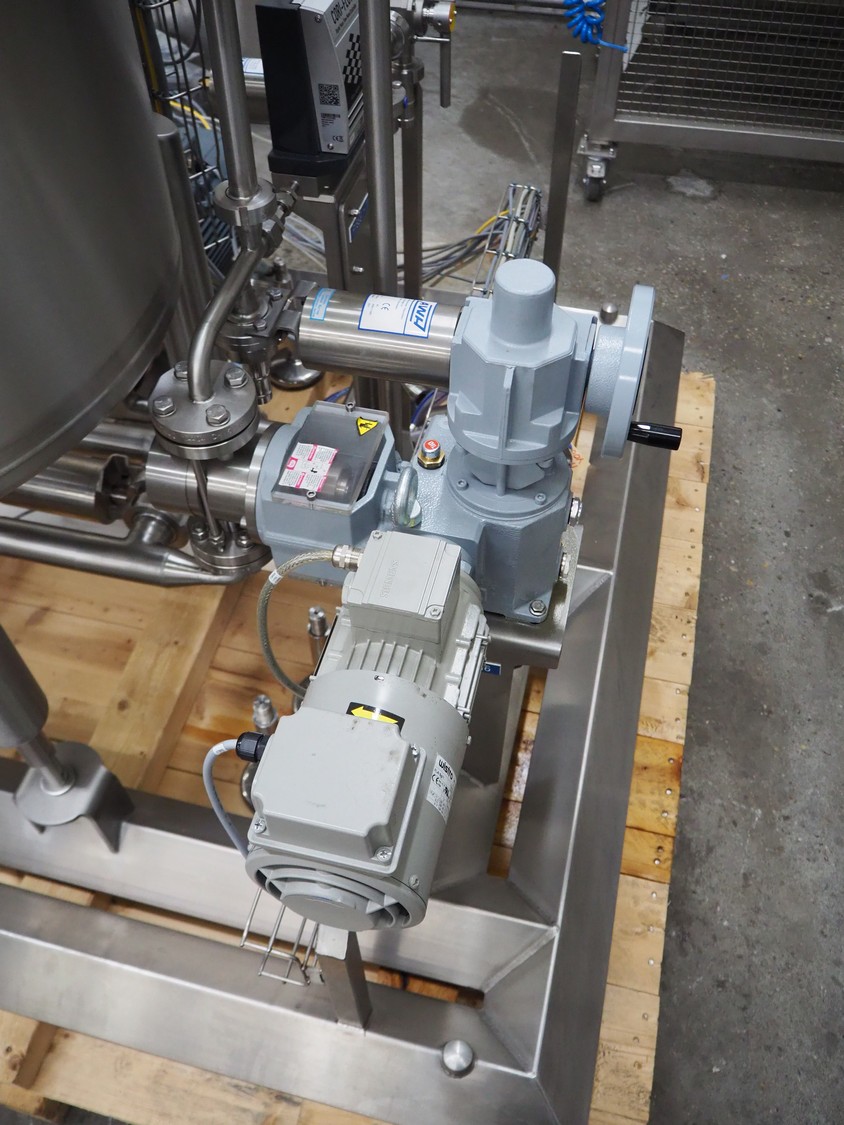 Process tank with SEW Eurodrive agitator and pump installation, capacity: 250 liter, dimensions tank: ø 740 mm x 600 mm, OBL pump, type: LY65ATB70RF G+M MV, capacity: 20 liter per hour, SPX centrifugal pump, model: C216, total dimensions: 1400 mm x 1400 mm x 1600 mm. Never used.