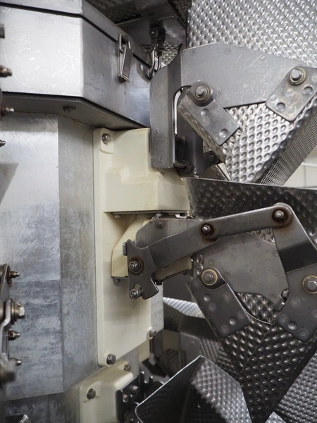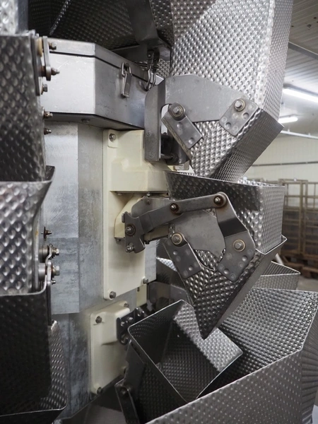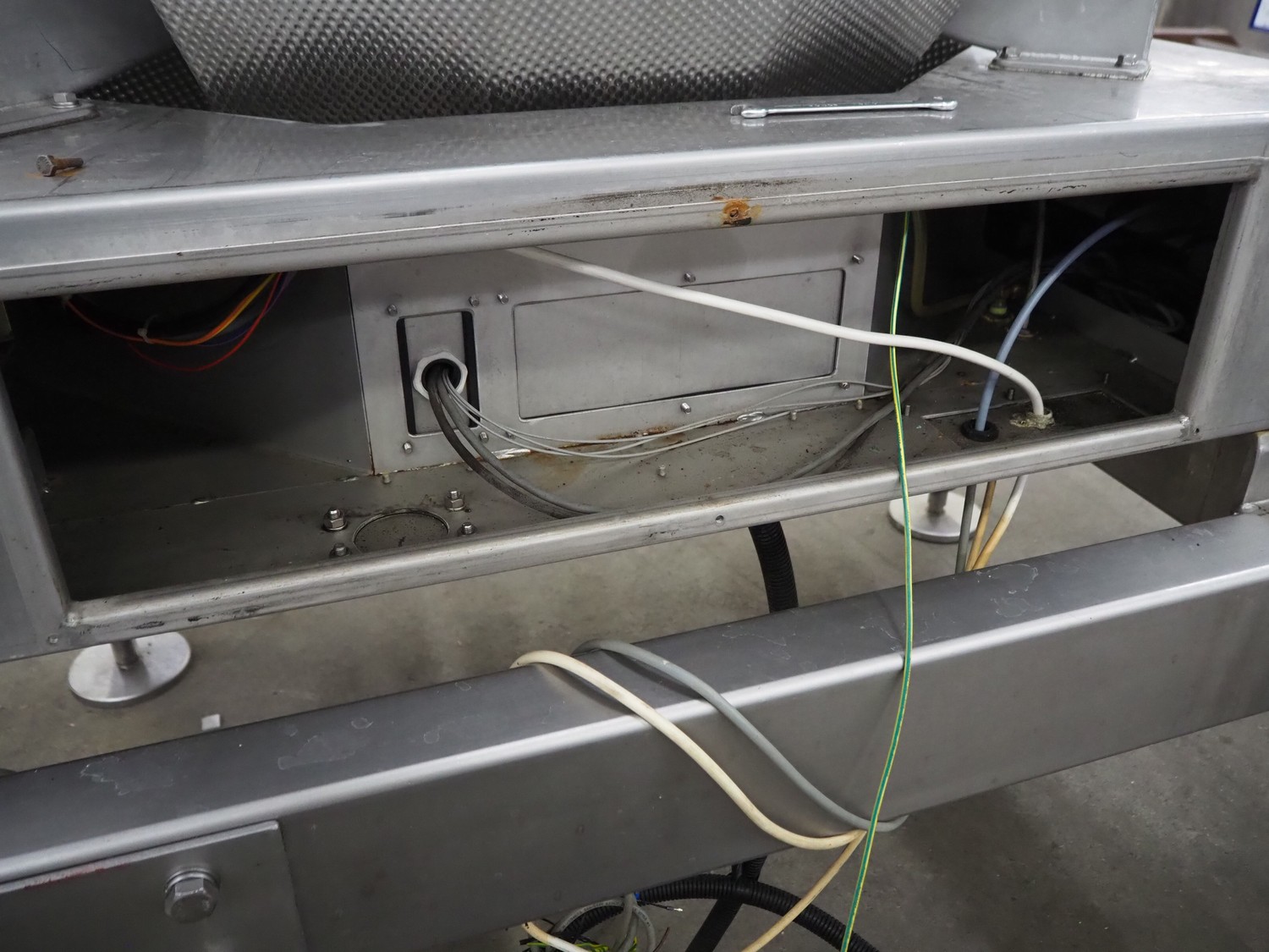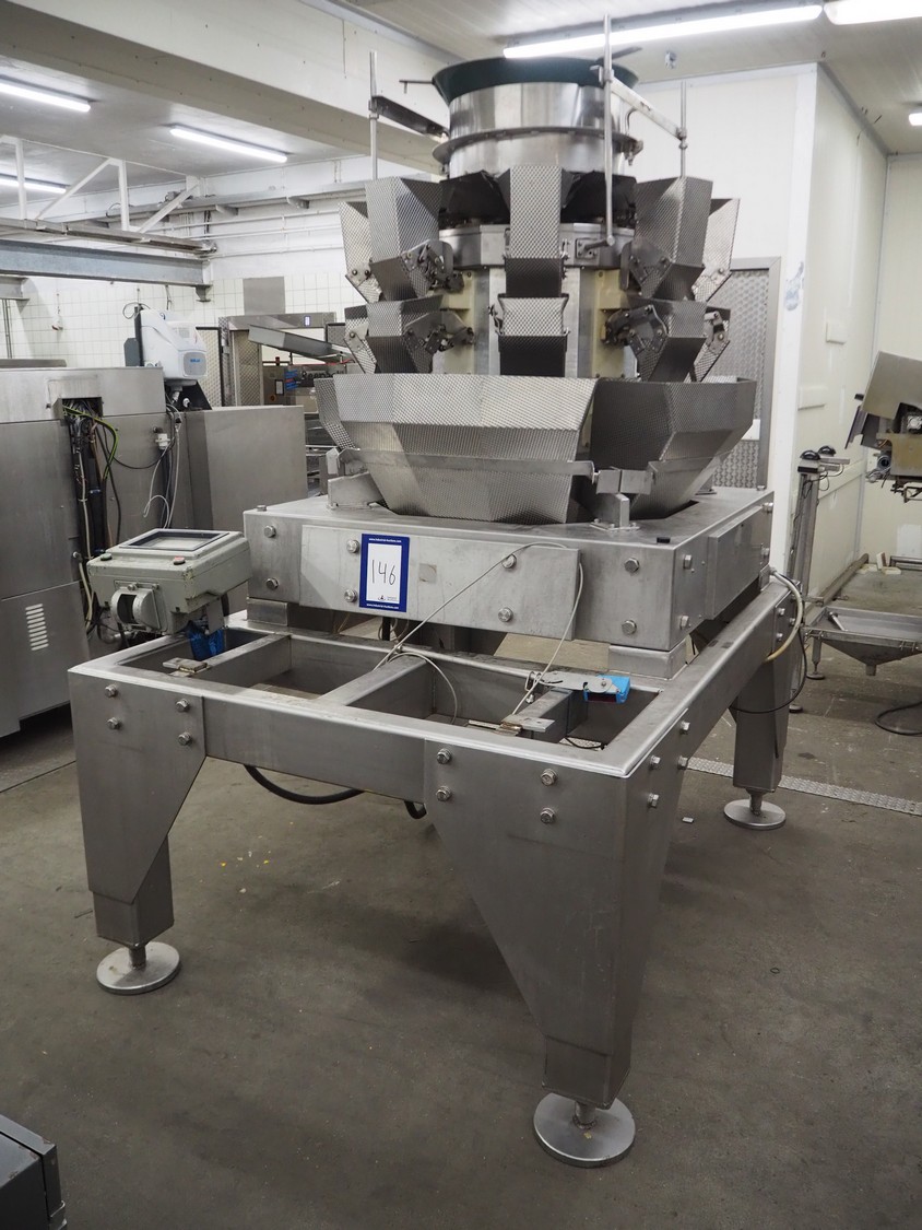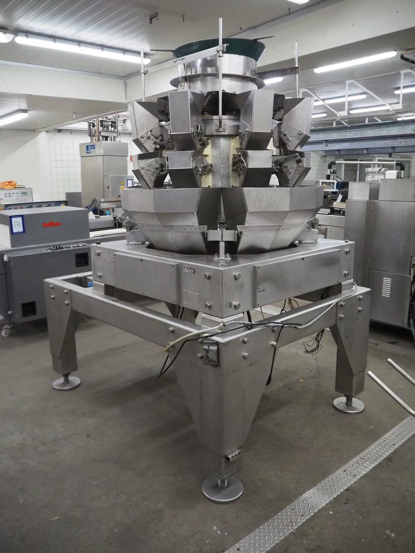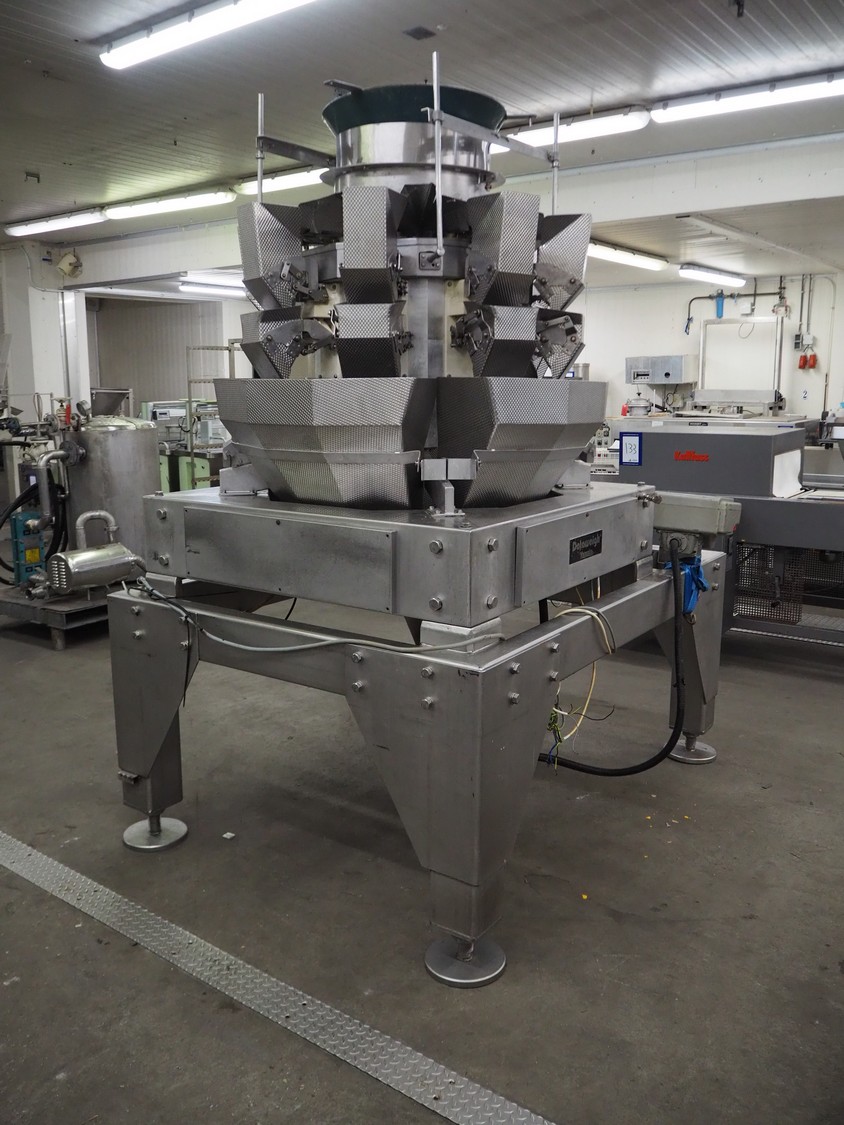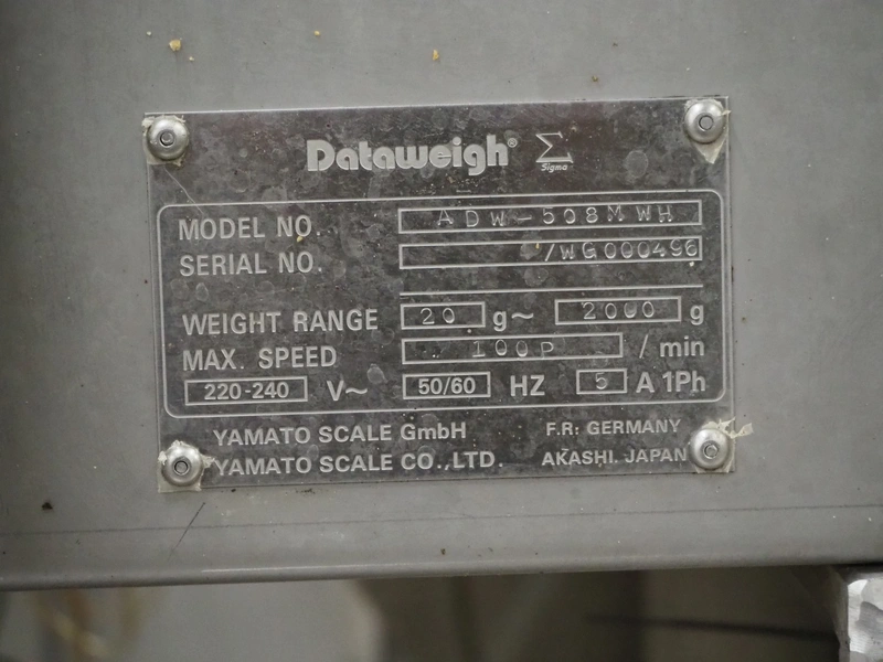 Yamato Scale GmbH 8 heads multihead weigher, model: ADW-508MWH, serial number: WG000496, 220-240 V, 1 Ph, 50/60 Hz, 5 A, weighing range: 20-2000 g, maximum speed: 100 pieces per minute, dimensions: 1950 mm x 1500 mm x 2400 mm.