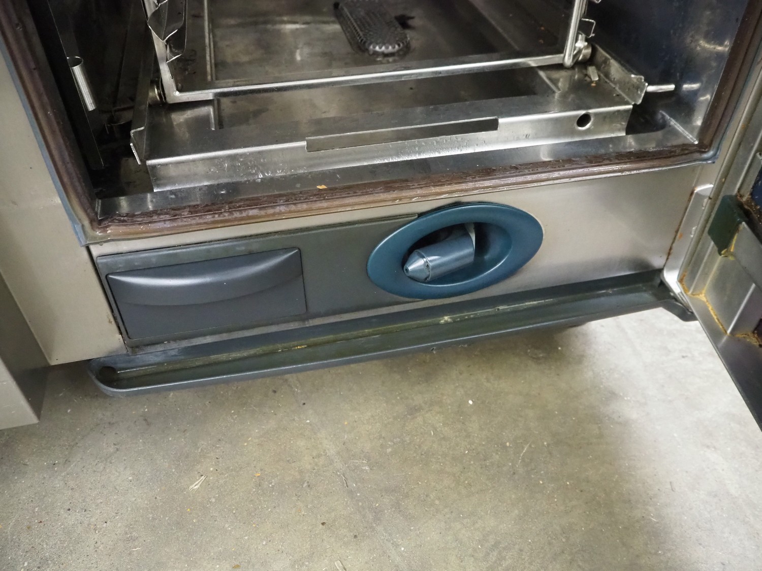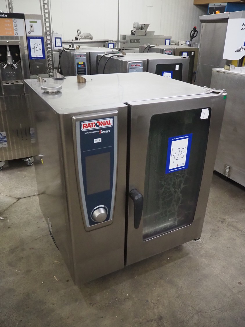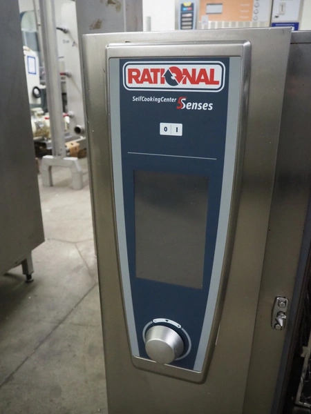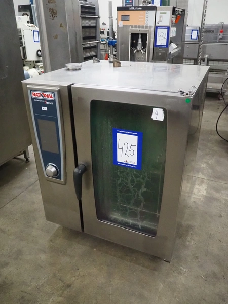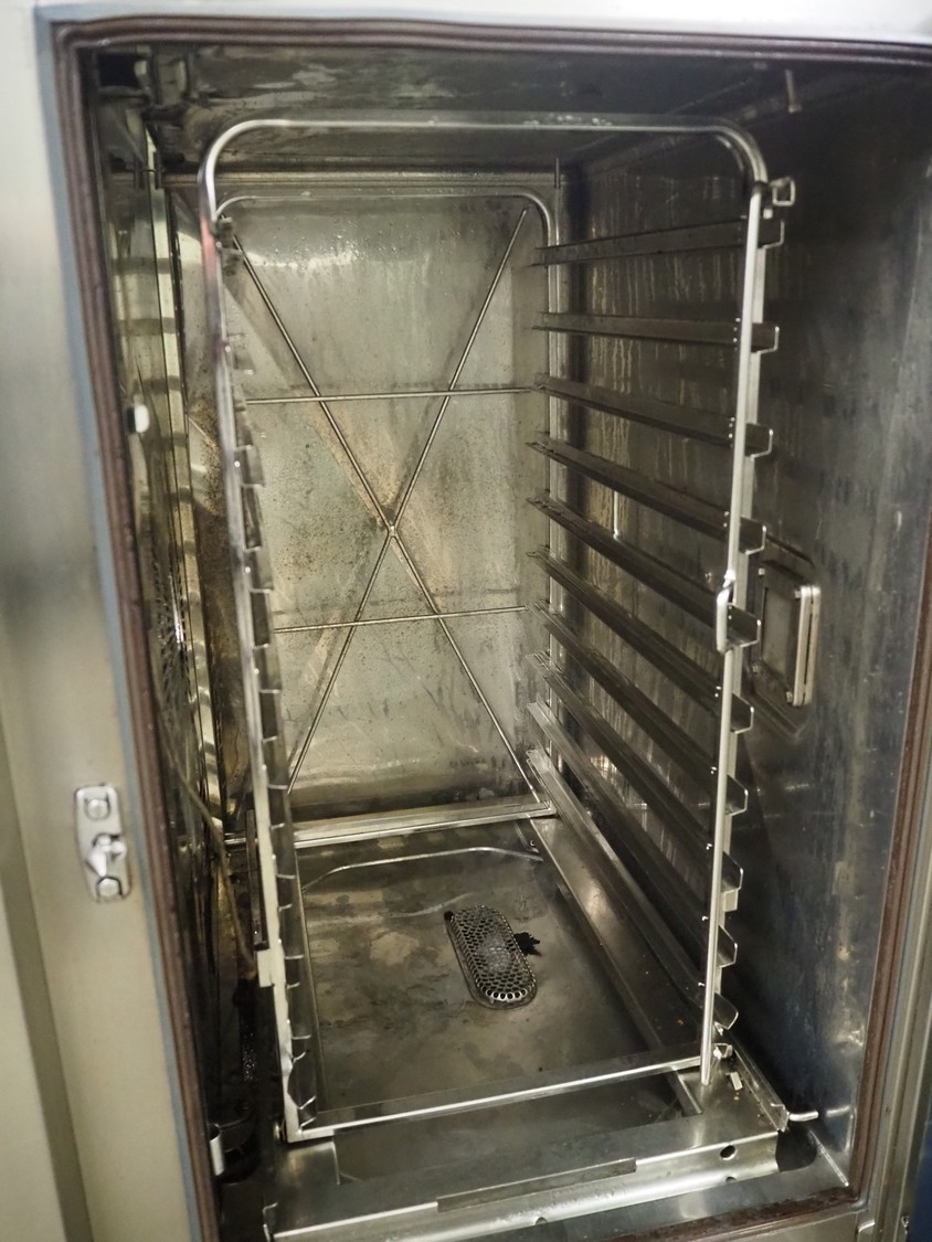 Rational combi steamer, 10 floors, dimensions each floor: 500 mm x 330 mm, total dimensions: 850 mm x 800 mm x 1080 mm.