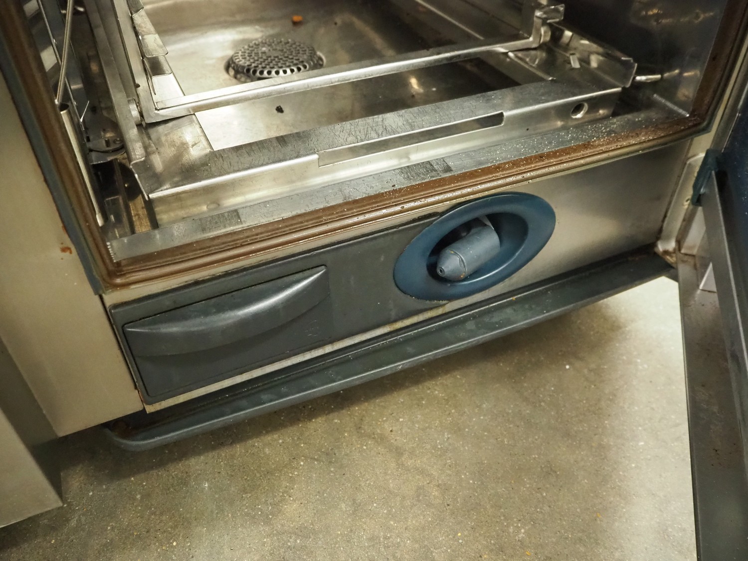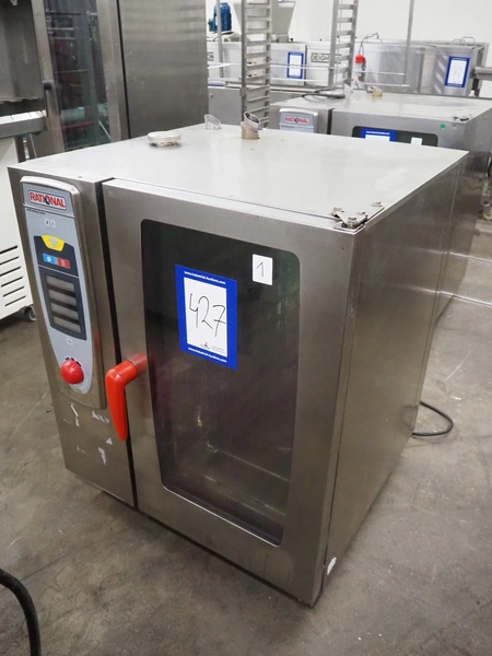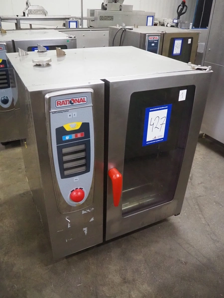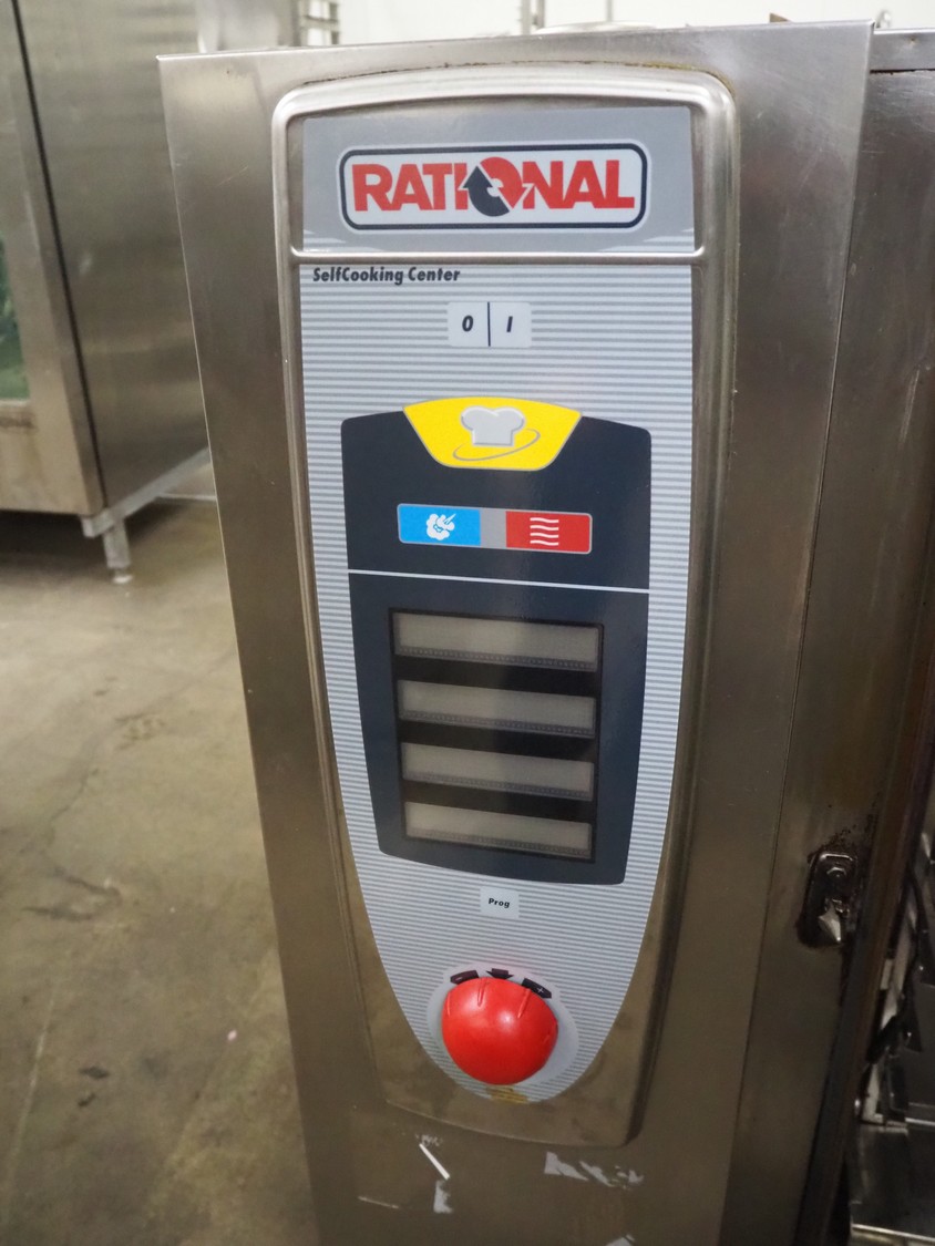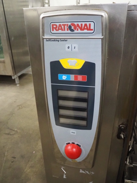 Rational combi steamer, 10 floors, dimensions each floor: 500 mm x 330 mm, total dimensions: 850 mm x 800 mm x 1050 mm.