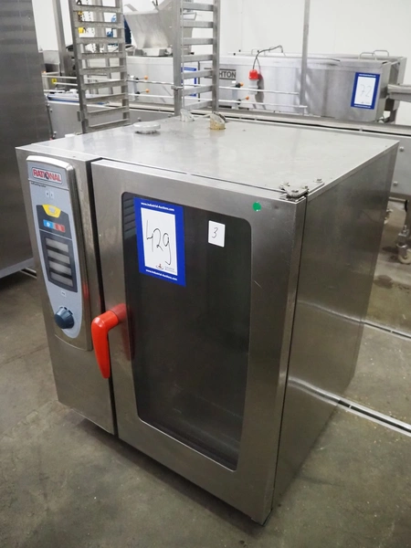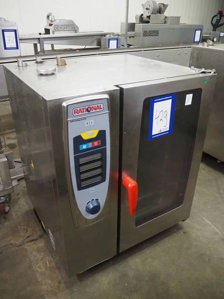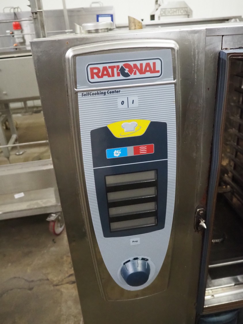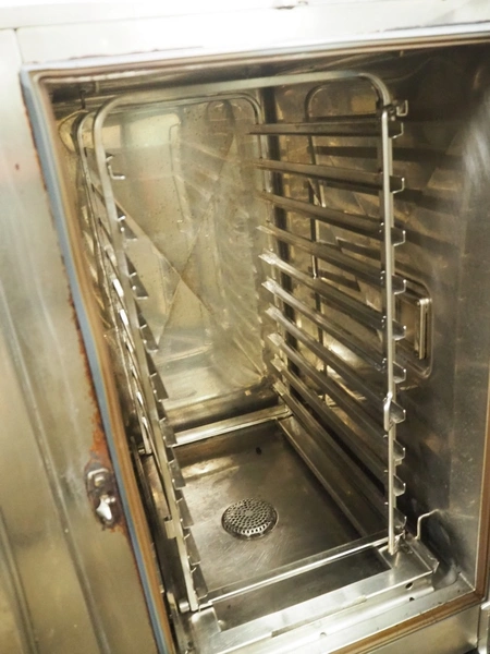 Rational combi steamer, 10 floors, dimensions each floor: 500 mm x 330 mm, total dimensions: 850 mm x 800 mm x 1090 mm.