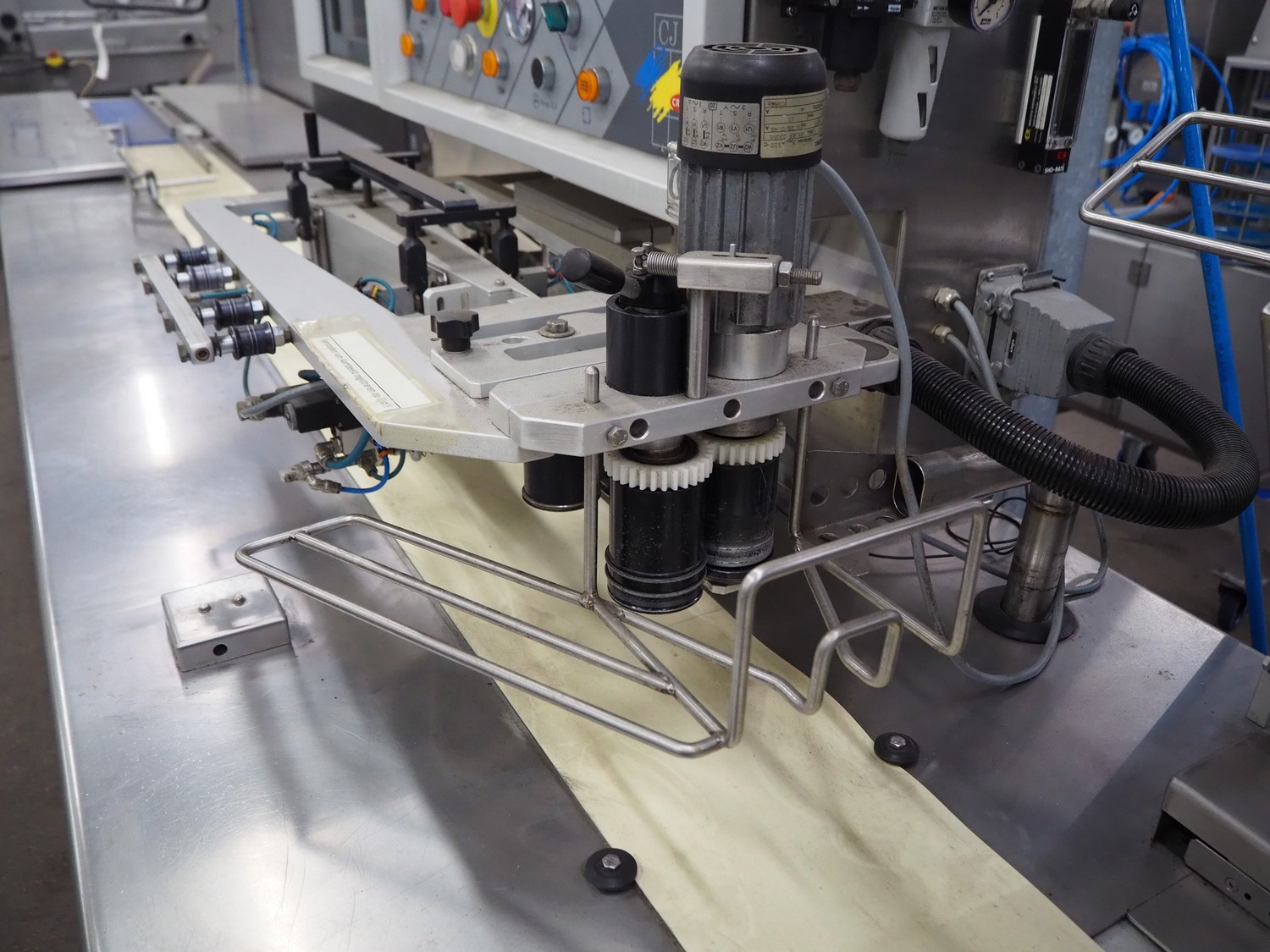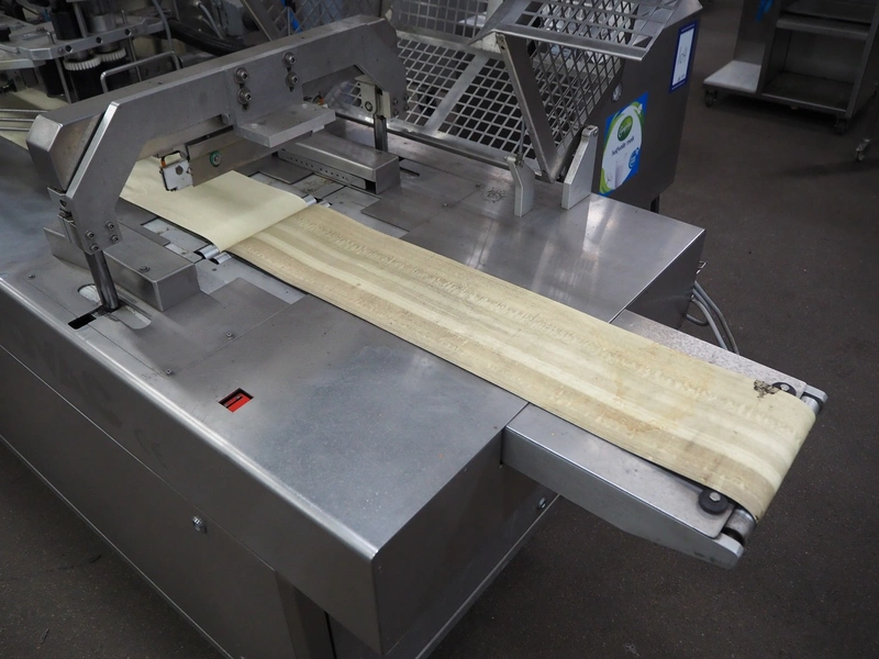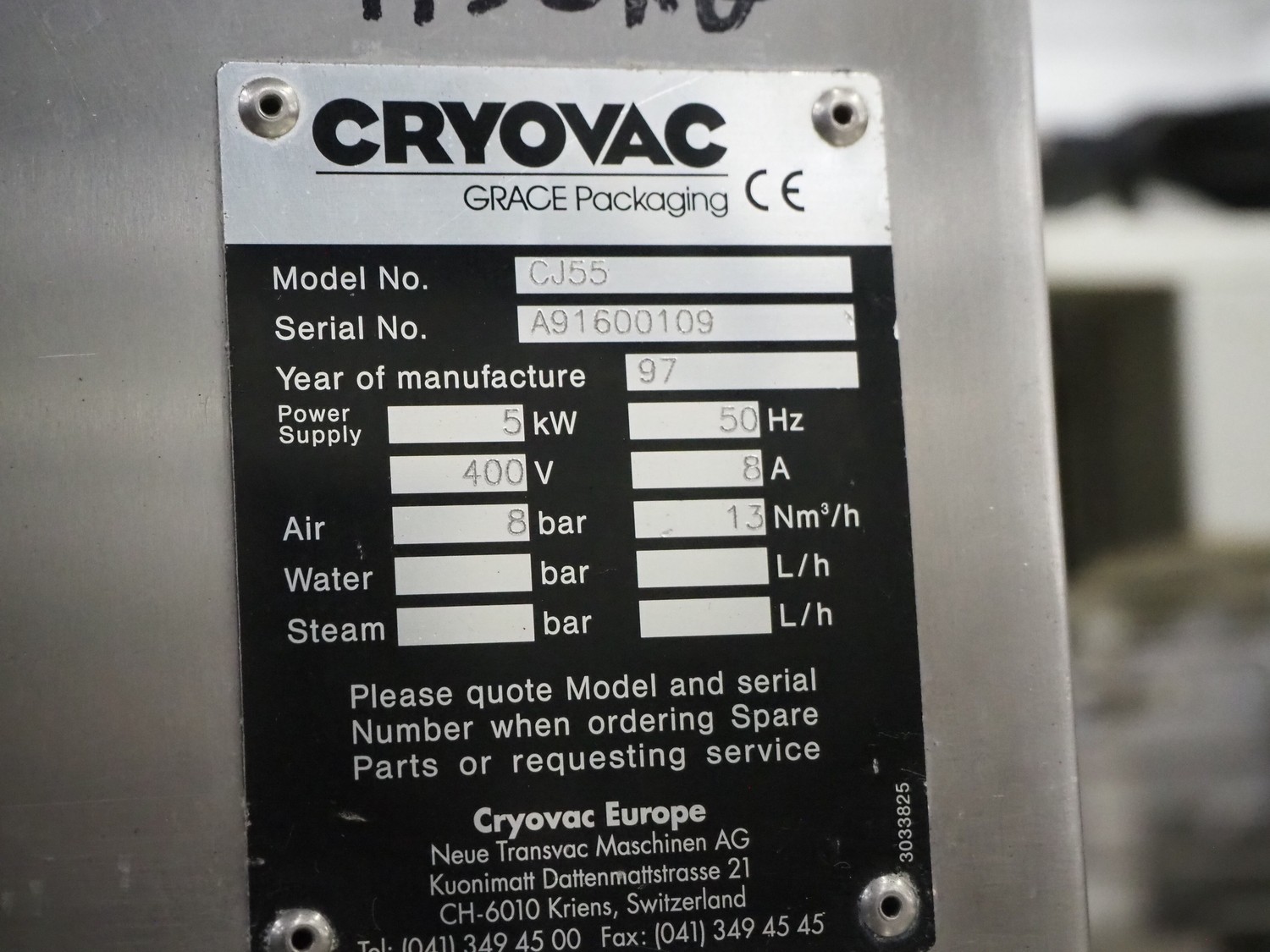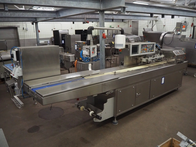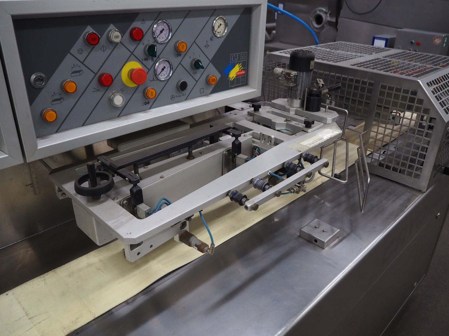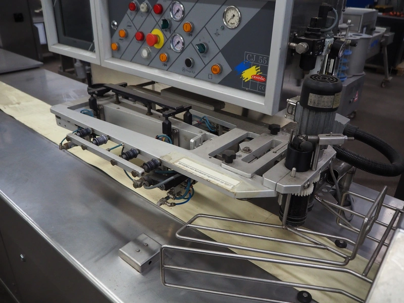 Cryovac flowpacker, model: CJ55, serial number: A91600109, year of construction: 1997, 400 V, 50 Hz, 8 A, 5 kW, plastic belt, belt width: 200 mm, seal width: 330 mm, total dimensions: 5100 mm x 1400 mm x 1950 mm. Including crate with parts.