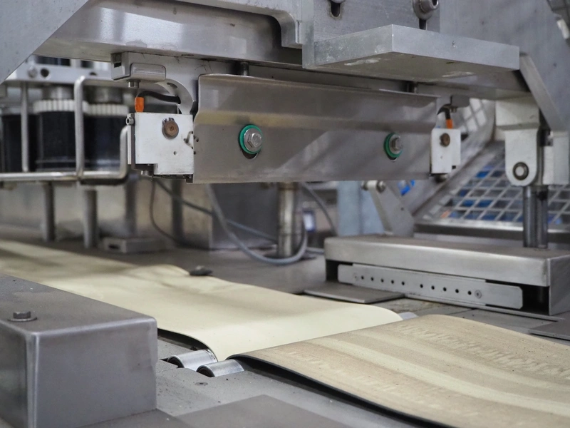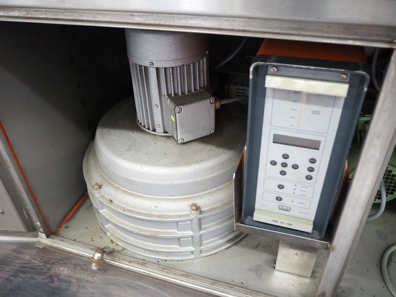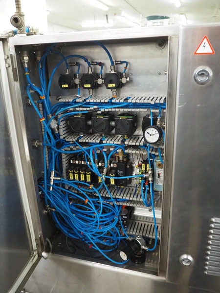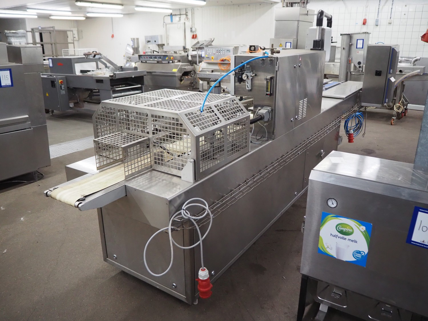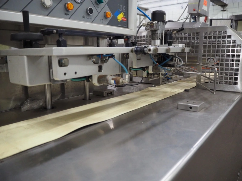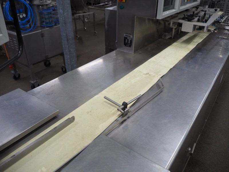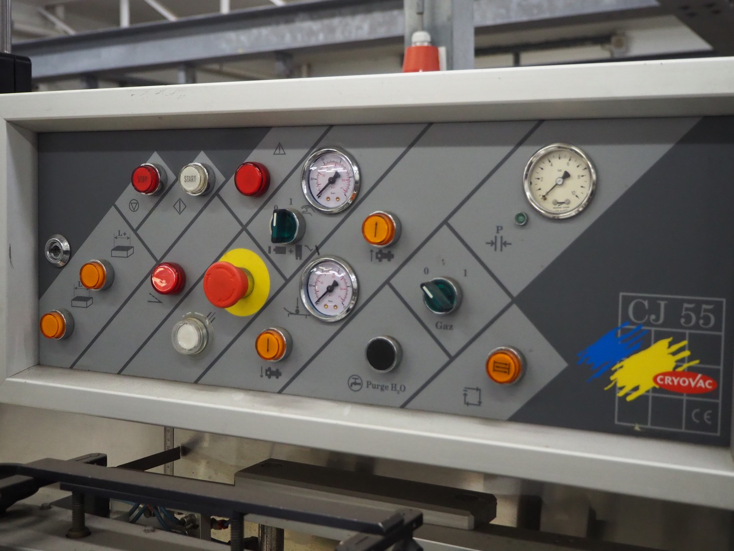 Cryovac flowpacker, model: CJ55, serial number: A91600109, year of construction: 1997, 400 V, 50 Hz, 8 A, 5 kW, plastic belt, belt width: 200 mm, seal width: 330 mm, total dimensions: 5100 mm x 1400 mm x 1950 mm. Including crate with parts.