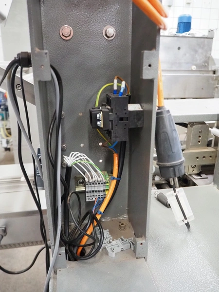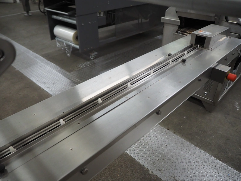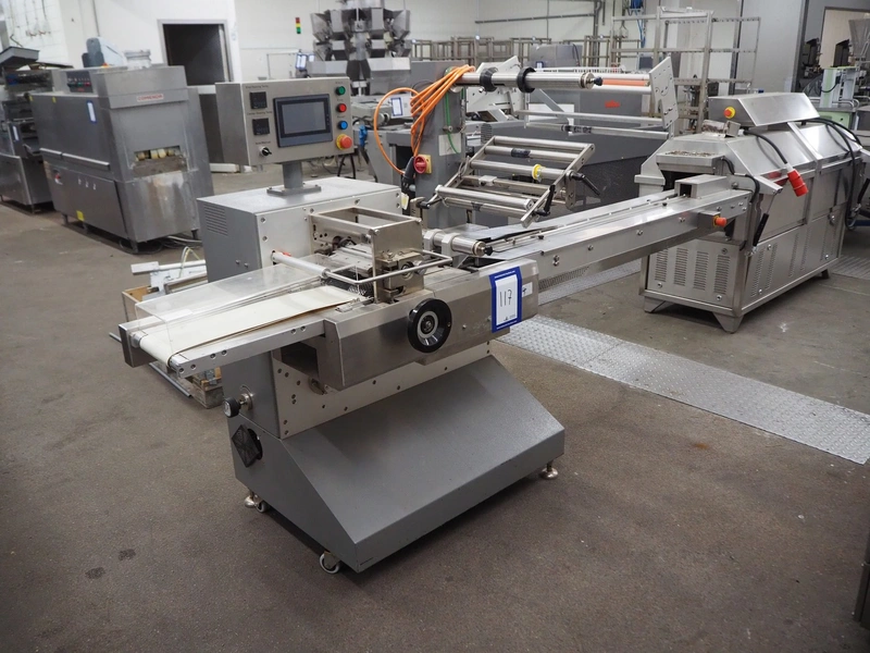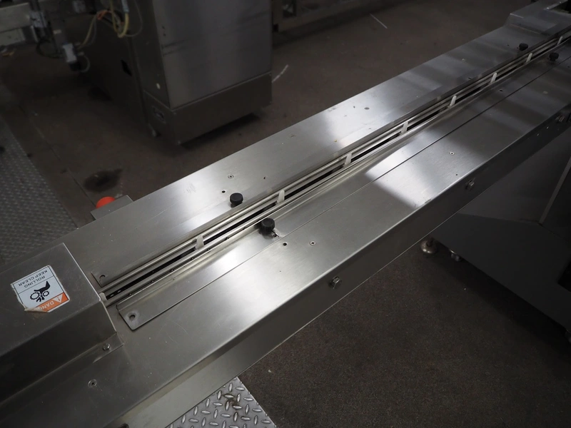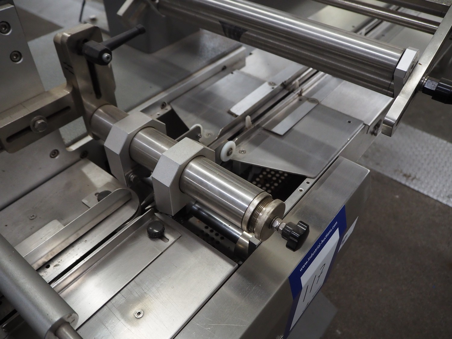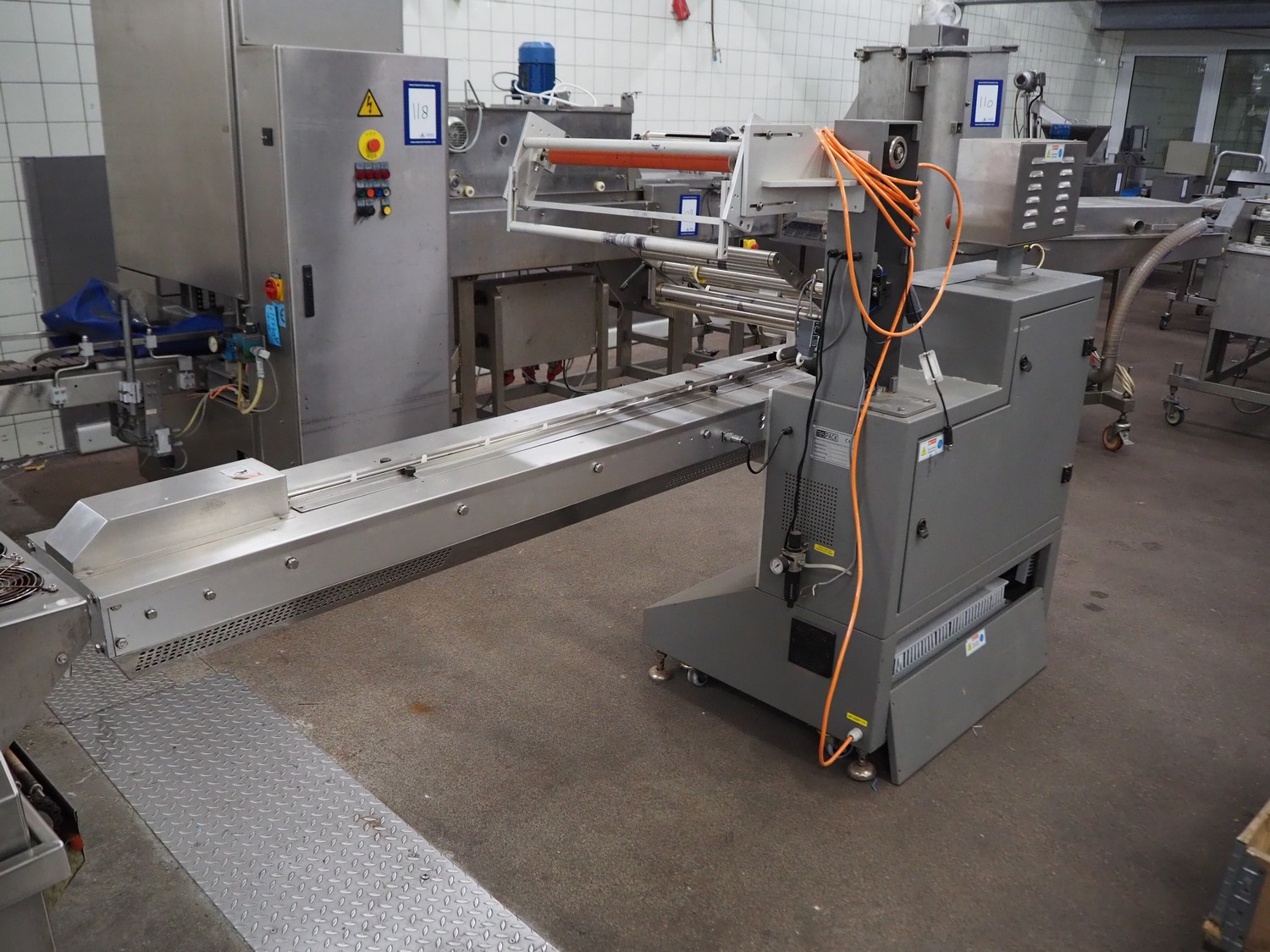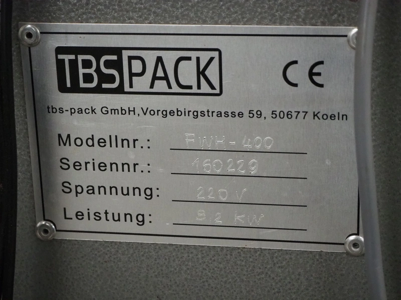 TBS-Pack GmbH mobile flow packer, model: FWH-400, serial number: 160229, 220 V, 3.2 kW, seal width: 200 mm, plastic belt, belt width: 180 mm, total dimensions: 3000 mm x 850 mm x 1520 mm.