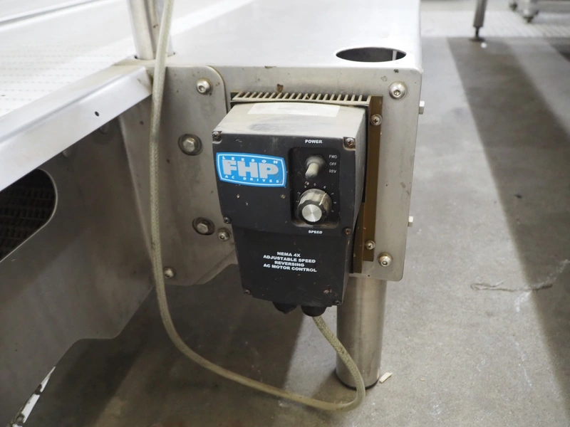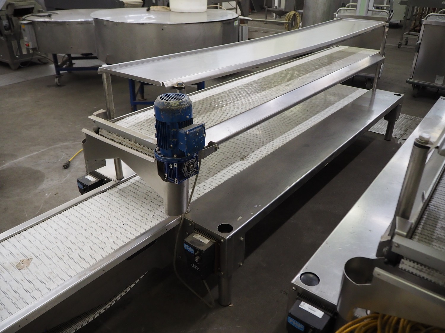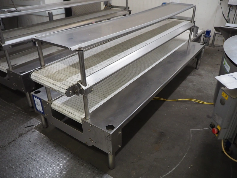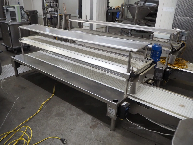 BBC Technologies packaging table with 2-level transport belts, product: 3TPT, model: 80052, serial number: 116028, plastic belt, belt width: (2x) 410 mm, total dimensions: 3900 mm x 1000 mm x 1150 mm.