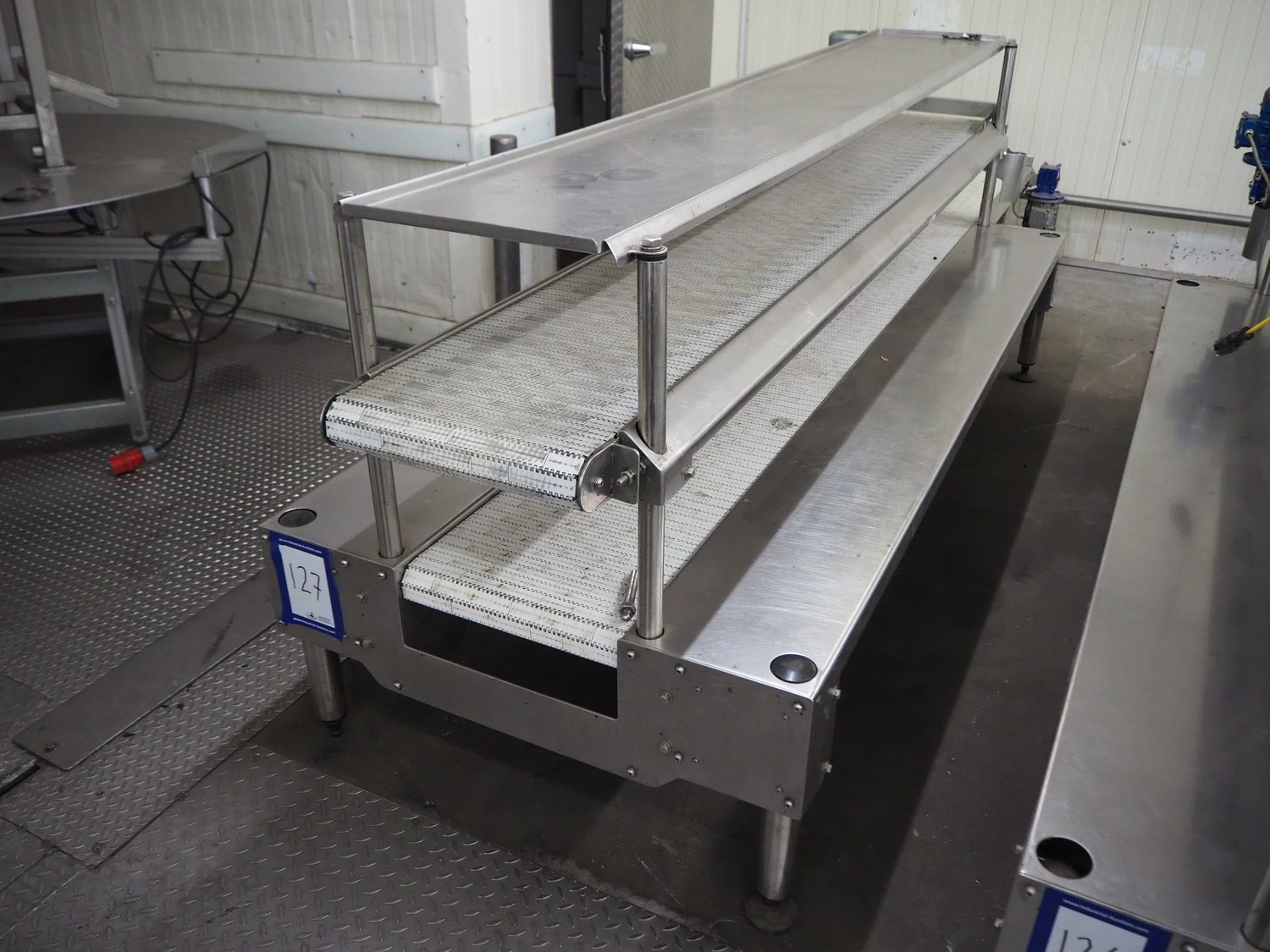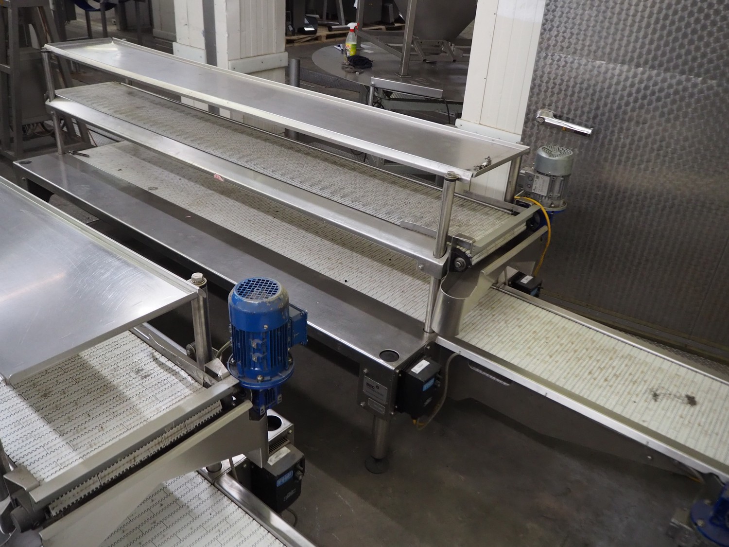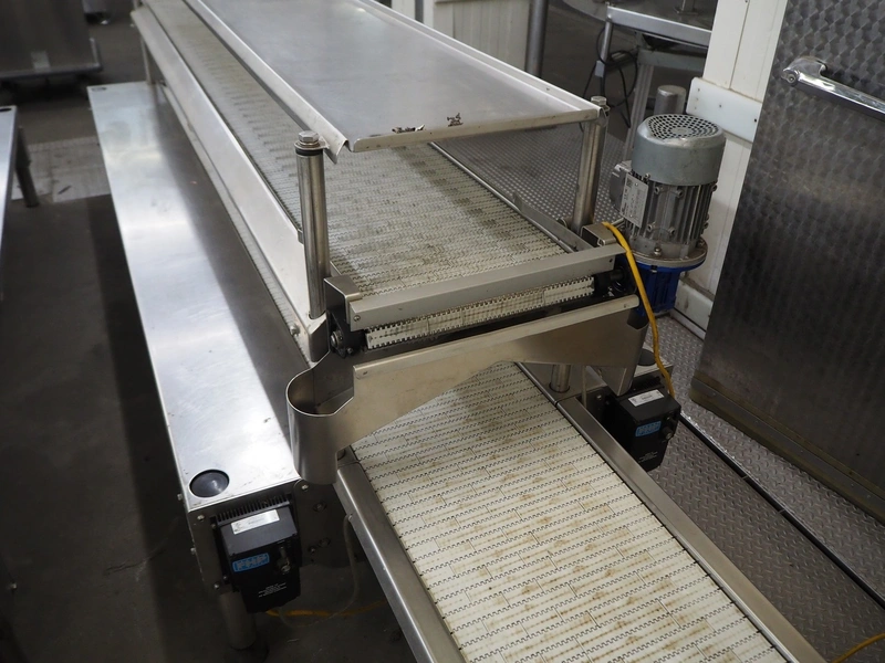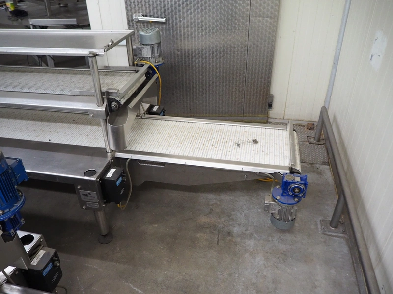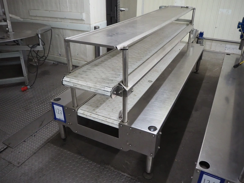 BBC Technologies packaging table with 2-level transport belts, product: PT3T, model: 80052, serial number: 117554, plastic belt, belt width: (2x) 410 mm, total dimensions: 3900 mm x 1000 mm x 1150 mm.