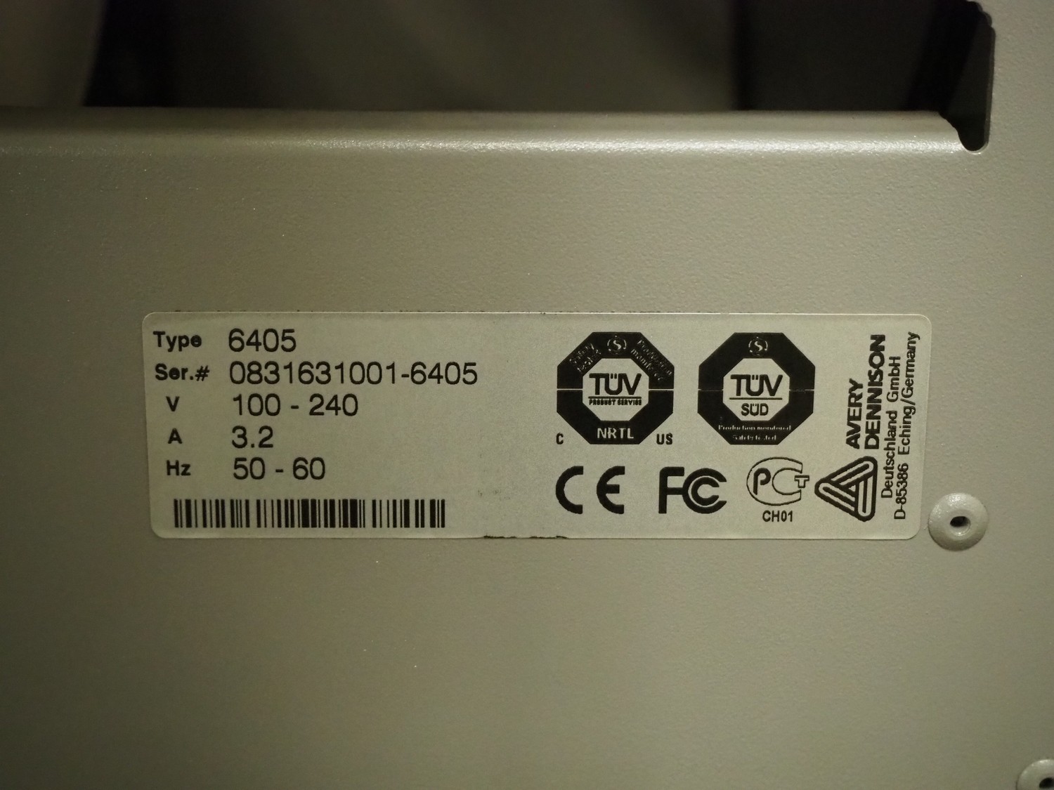 Avery Dennison label printer, type: 6405, serial number: 0831631001-6405, 100-240 V, 50-60 Hz, 3.2 A, dimensions: 500 mm x 320 mm x 310 mm.