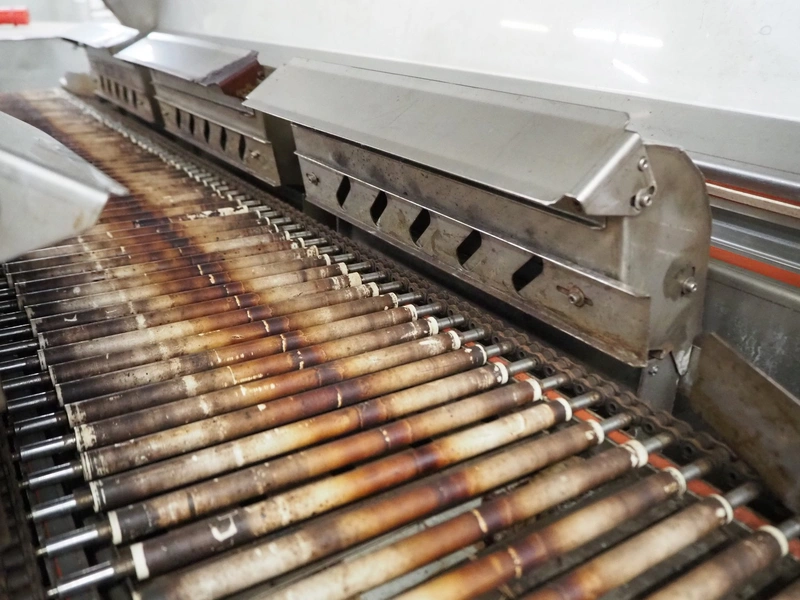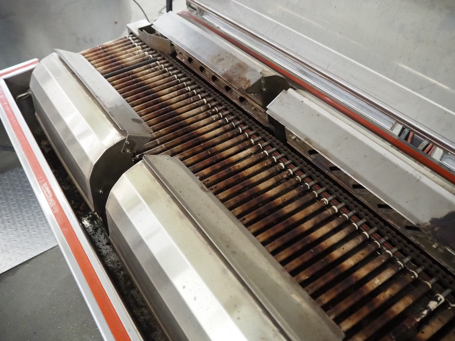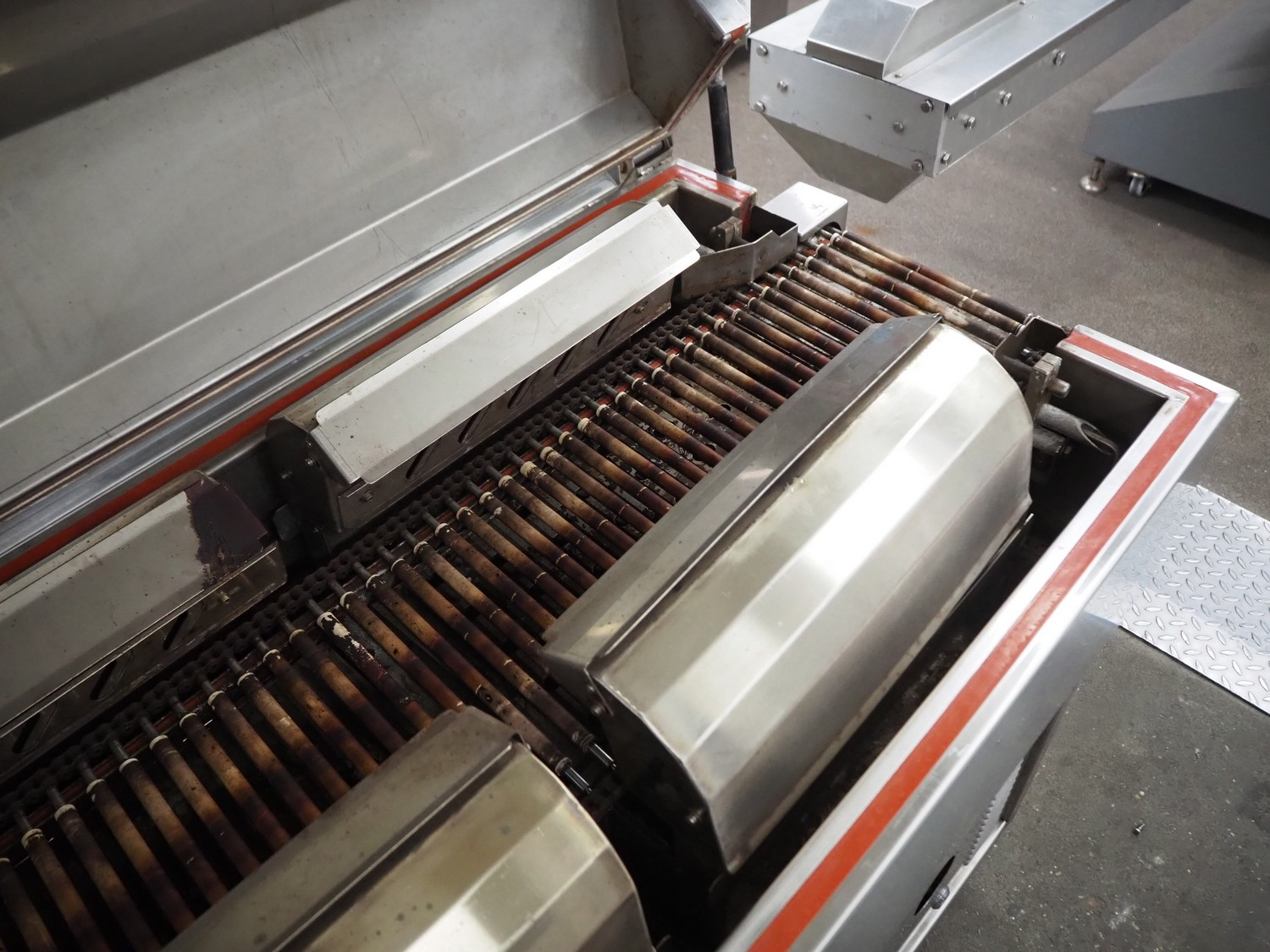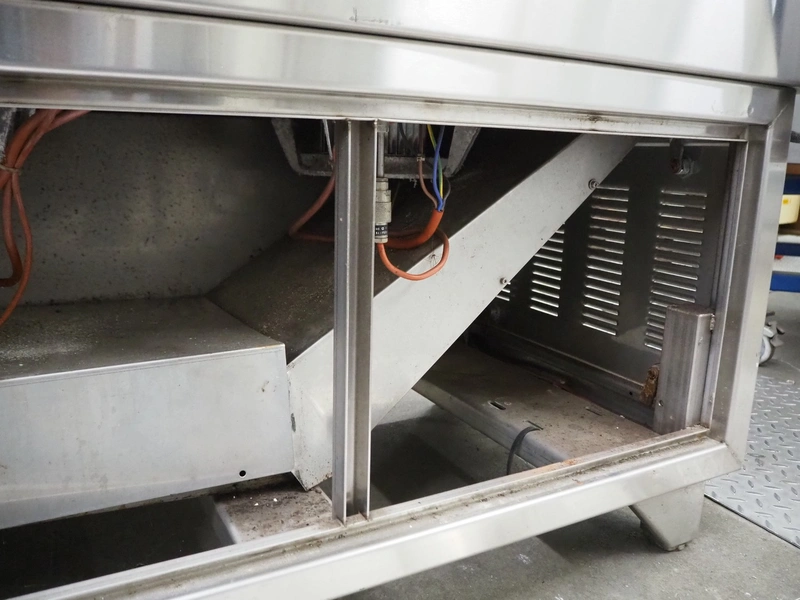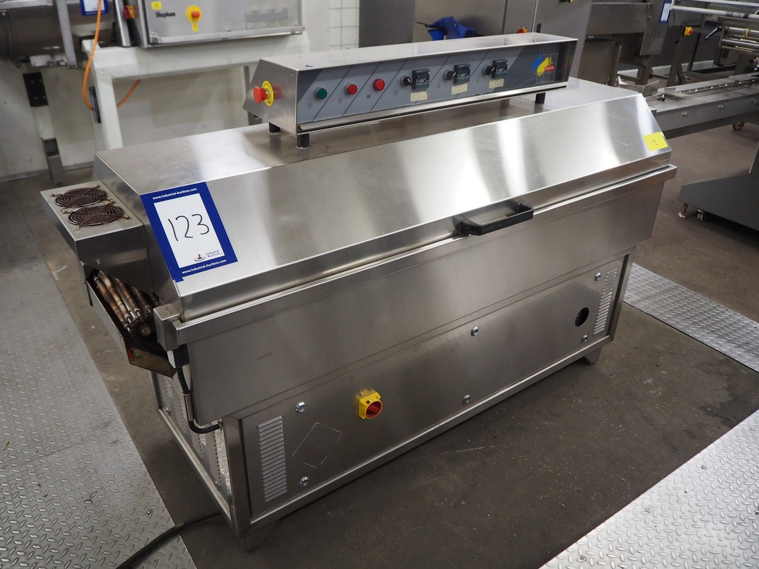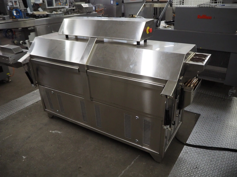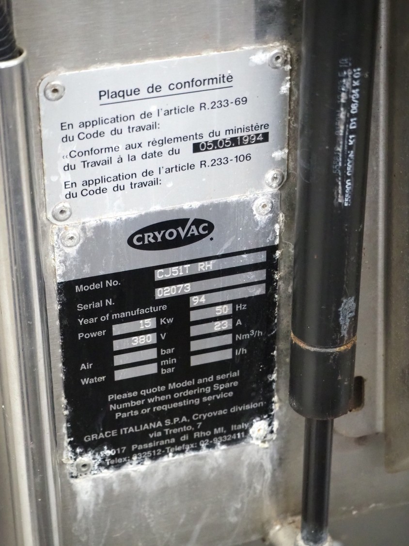 Cryovac shrink tunnel, model: CJ51T RH, serial number: 02073, year of construction: 1994, 380 V, 50 Hz, 23 A, 15 kW, plastic roller conveyor, roller width: 300 mm, clearance: 300 mm x 100 mm, total dimensions: 2100 mm x 900 mm x 1300 mm.