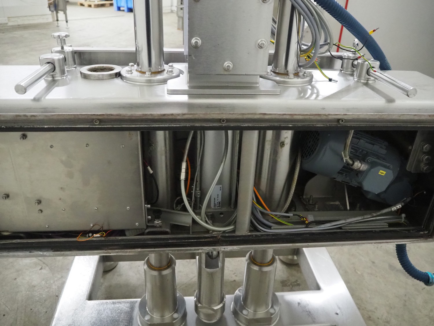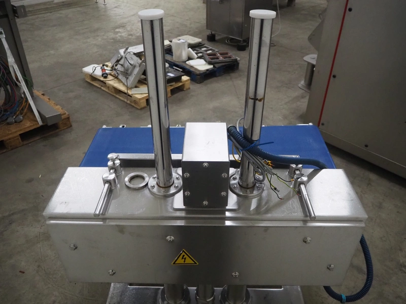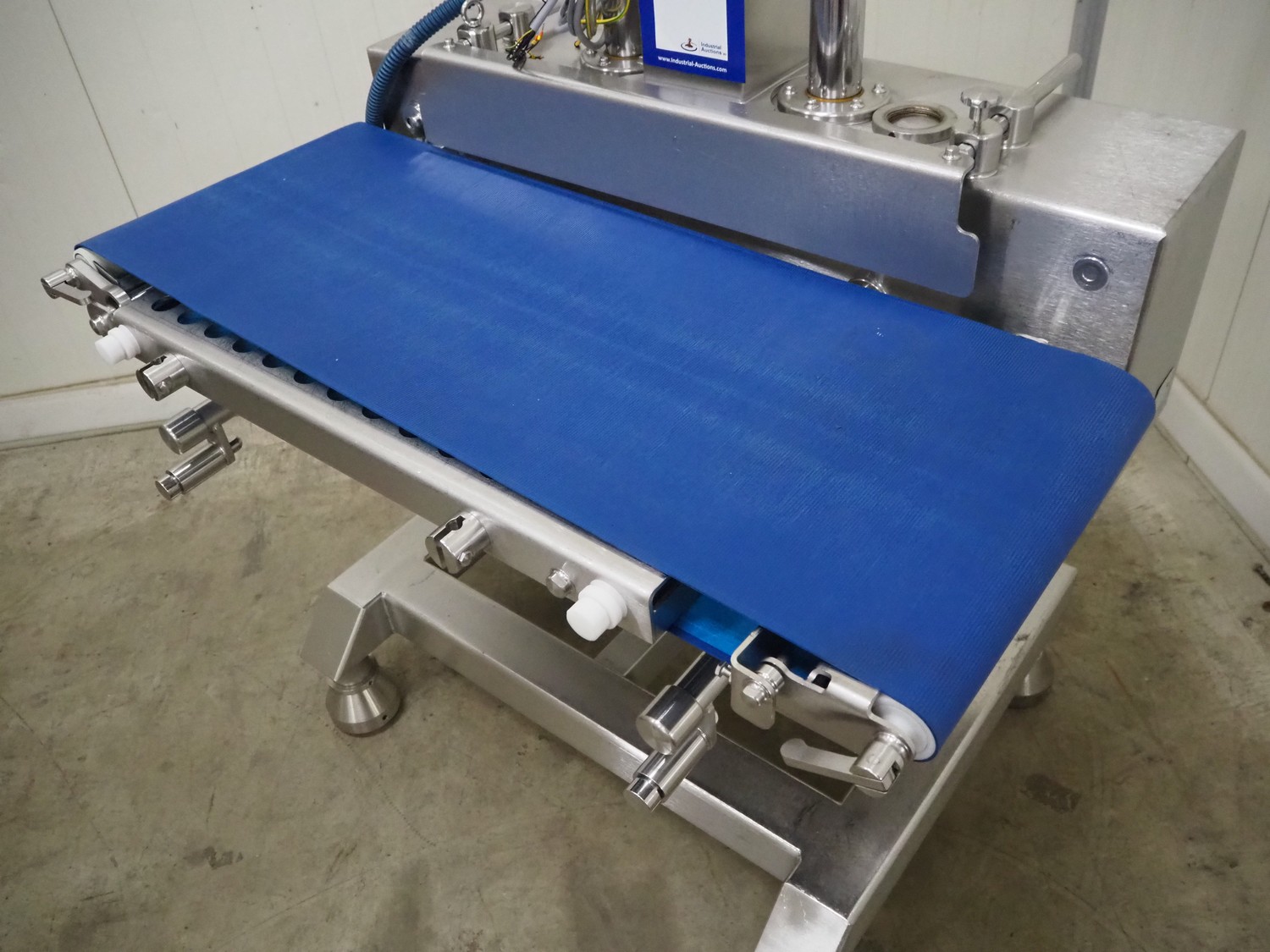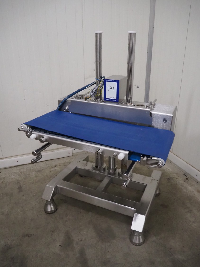 Weber infeed belt lift, type: CHB, number: 181, year of construction: 08-2009, s/s frame, plastic belt, belt width: 450 mm, total dimensions: 1200 mm x 840 mm x 1650 mm.