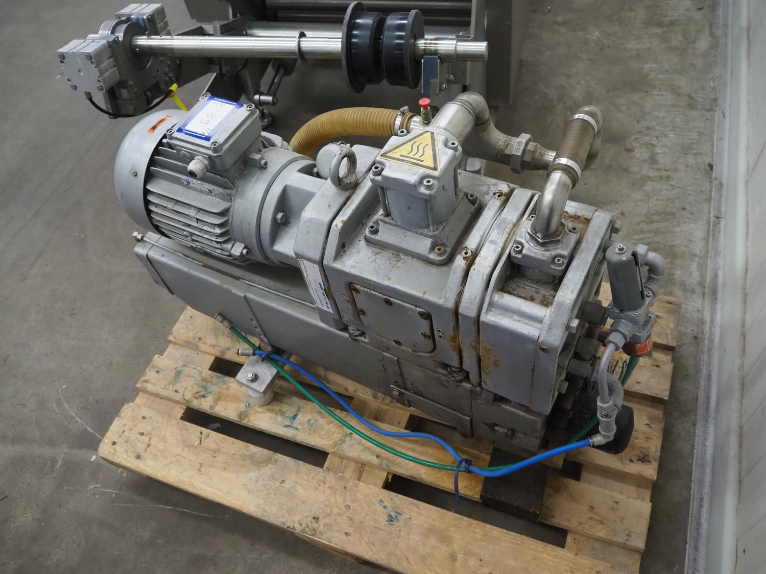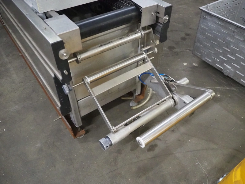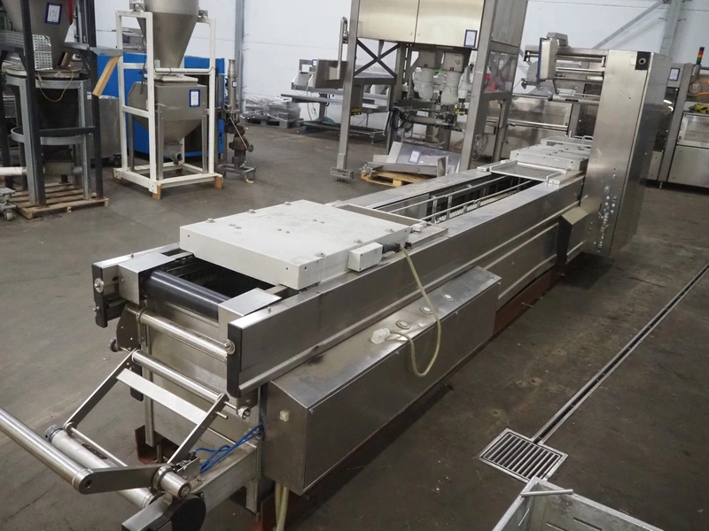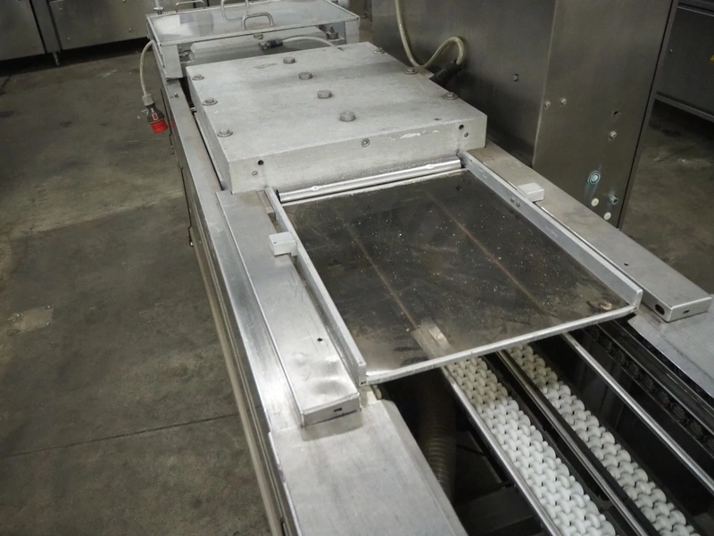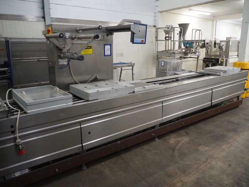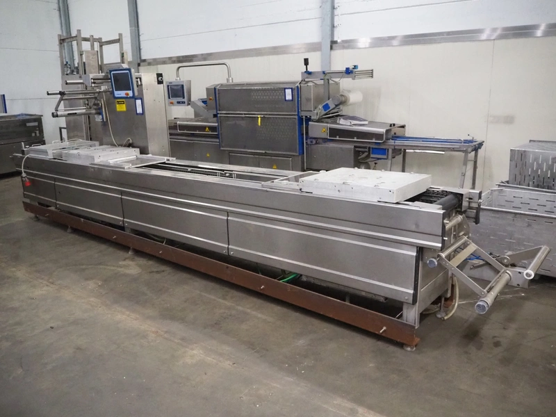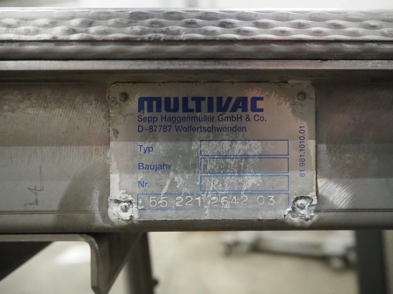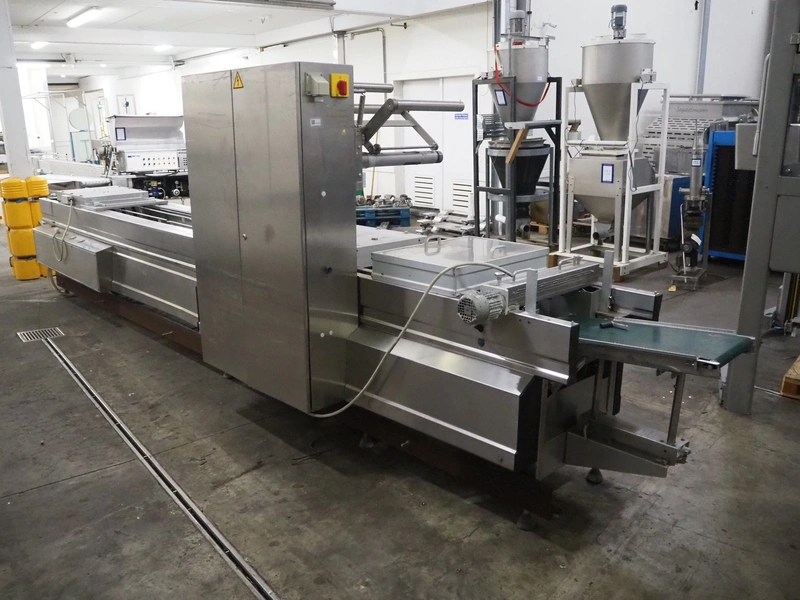 Multivac thermoformer, type: R530, dimensions dye: (8x) 78 mm x 325 mm, plastic belt, belt width: 378 mm, total dimensions: 7660 mm x 1040 mm x 1870 mm. Including Busch vacuum pump, dimensions pump: 1100 mm x 370 mm x 7200 mm.