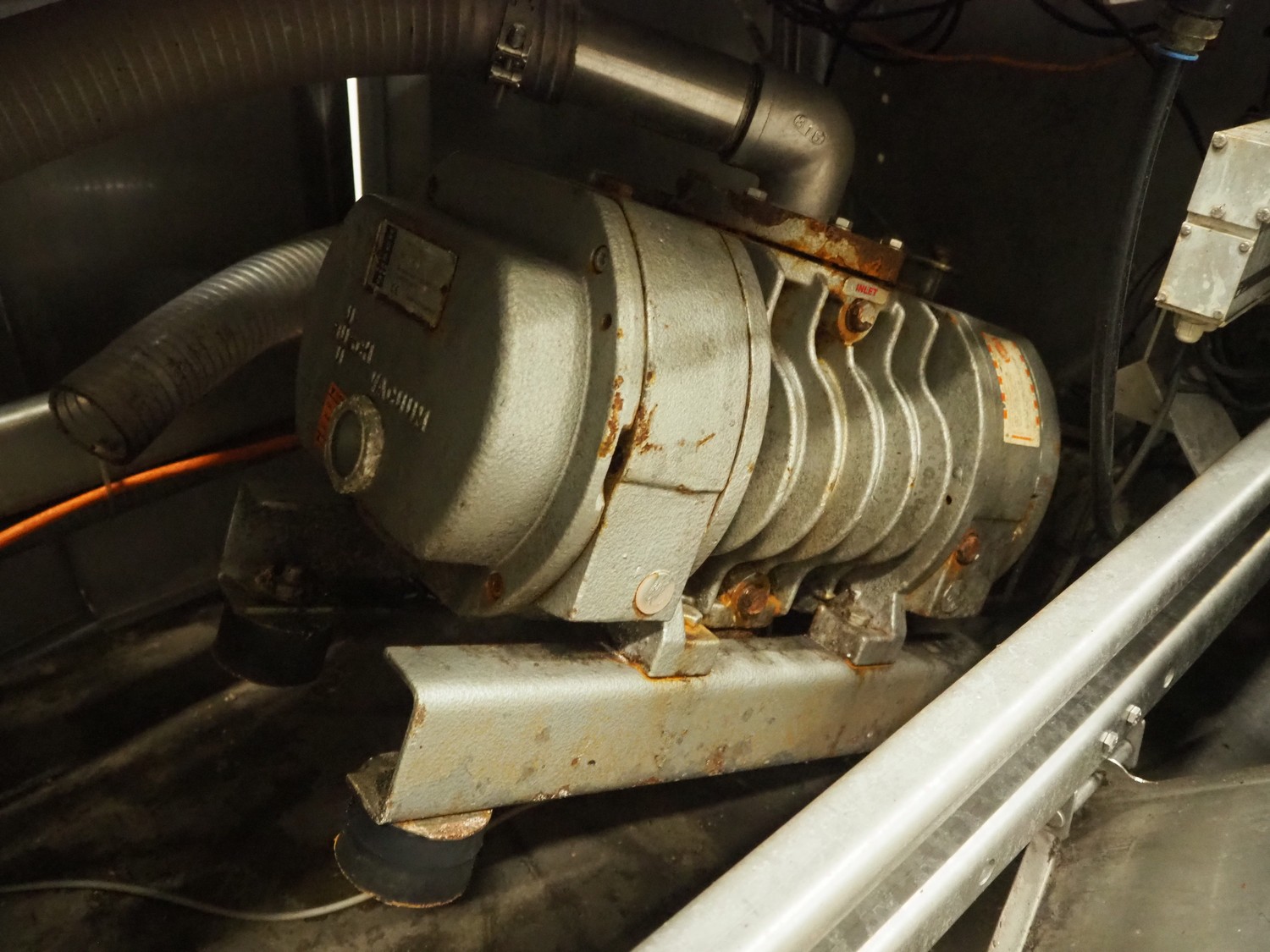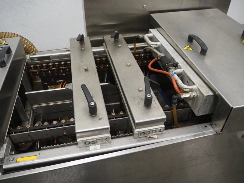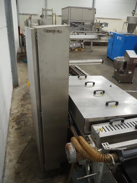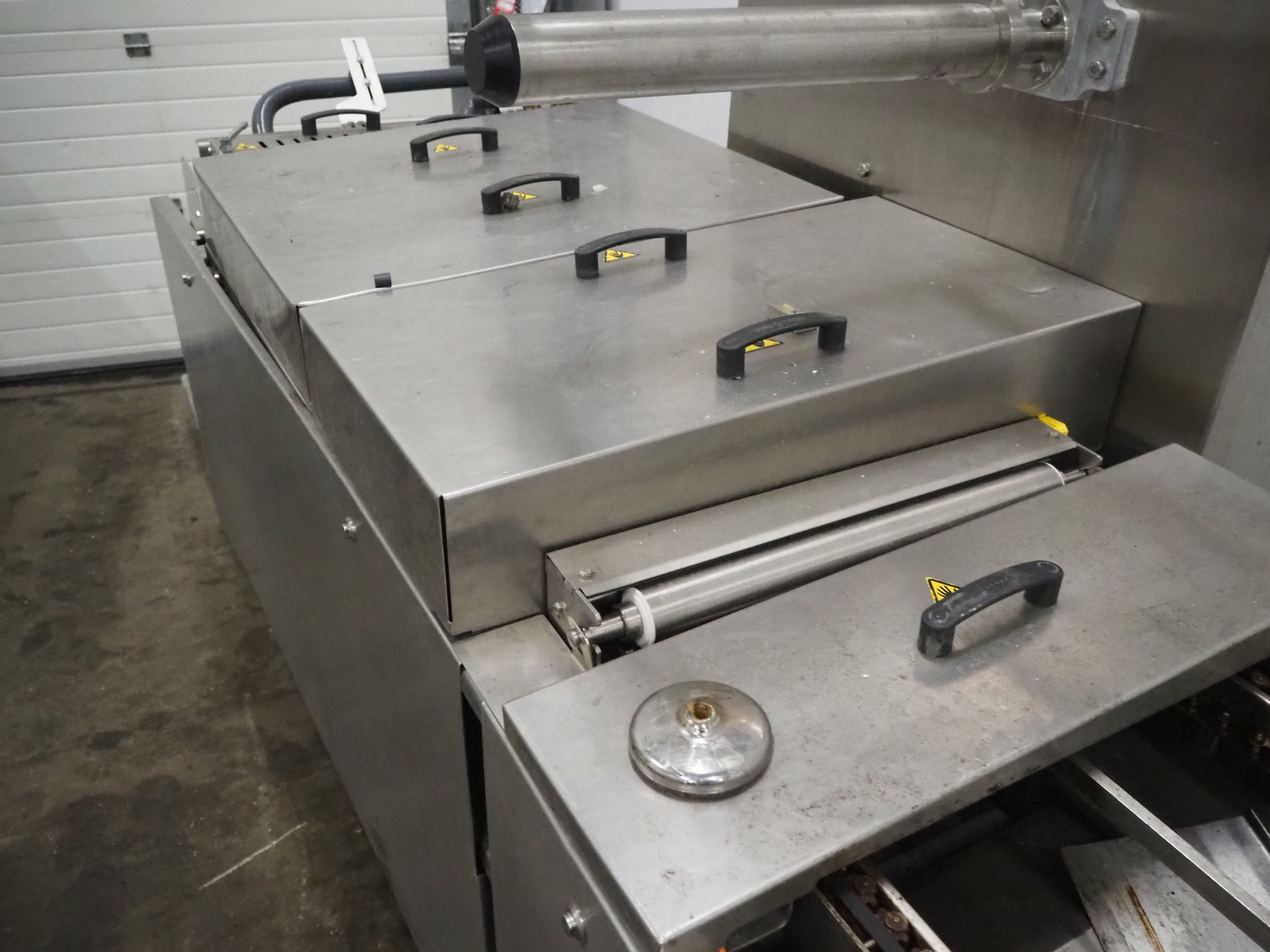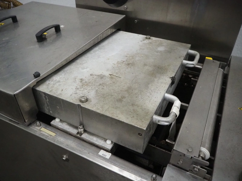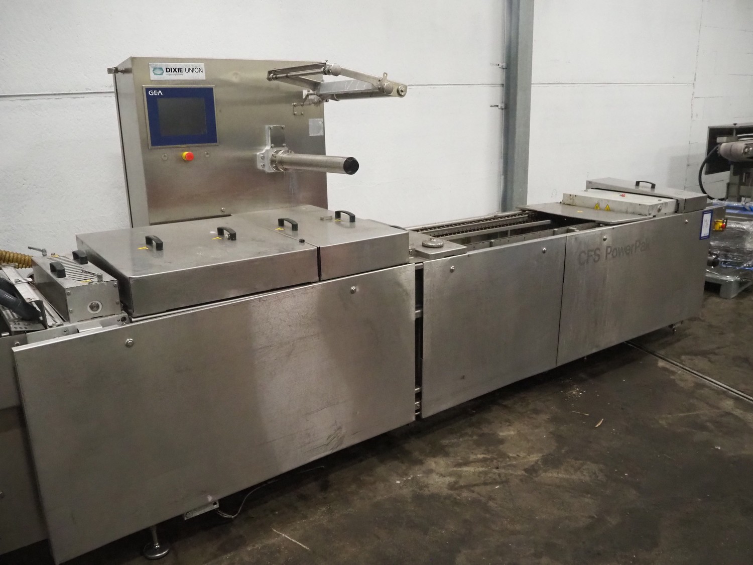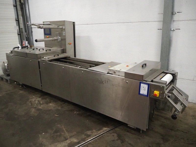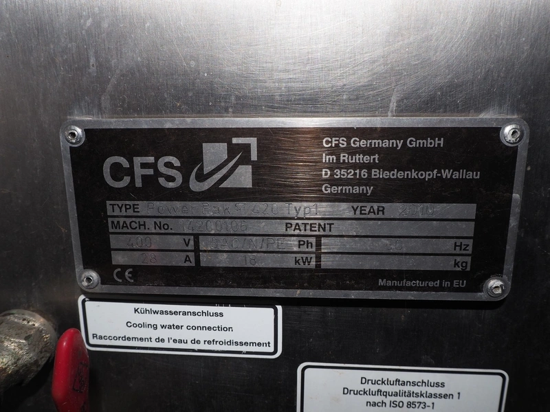CFS thermoformer, type: PowerPak ST 420, Typ1, machine number: 14200106, year of construction: 2010, 400 V, 3 Ph, 50 Hz, 28 A, 18 kW, dye: (4x) 380 mm x 85 mm, plastic belt, belt width: 355 mm, Busch booster pump, type: WV 0500 H 001, number: 09919000265, capacity: 500 m³ per hour, total dimensions: 5200 mm x 1300 mm x 1800 mm. Including suction device, pallet with dyes, dye: (3x) 345 mm x 165 mm and parts.
