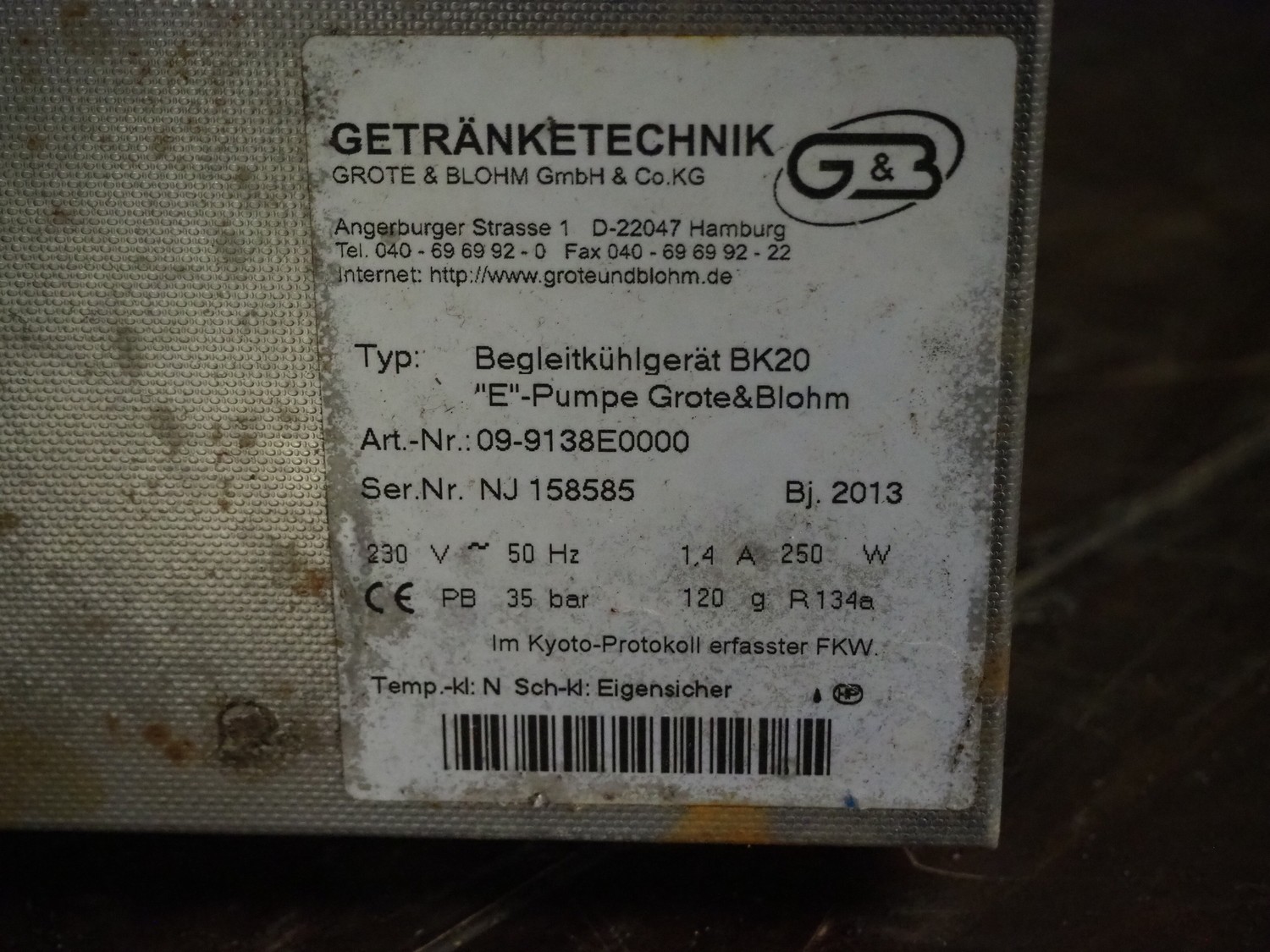 Getränketechinik Grote & Blohm GmbH & Co. KG cooling unit, type: begleitkühlgerät BK20, serial number: NJ 158585, year of construction: 2013, 230 V, 50 Hz, 1.4 A, 250 W, refrigerant: R134a/120 g, dimensions: 380 mm x 300 mm x 340 mm.