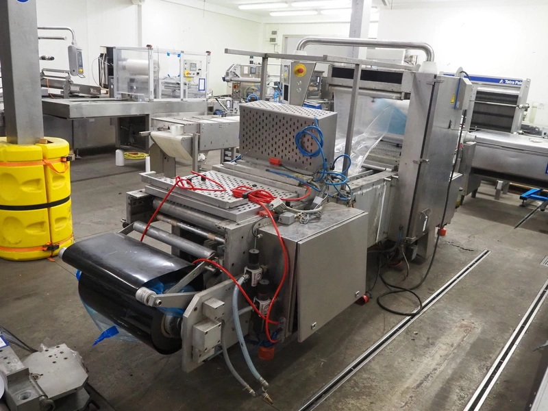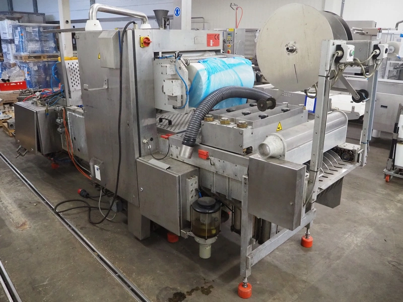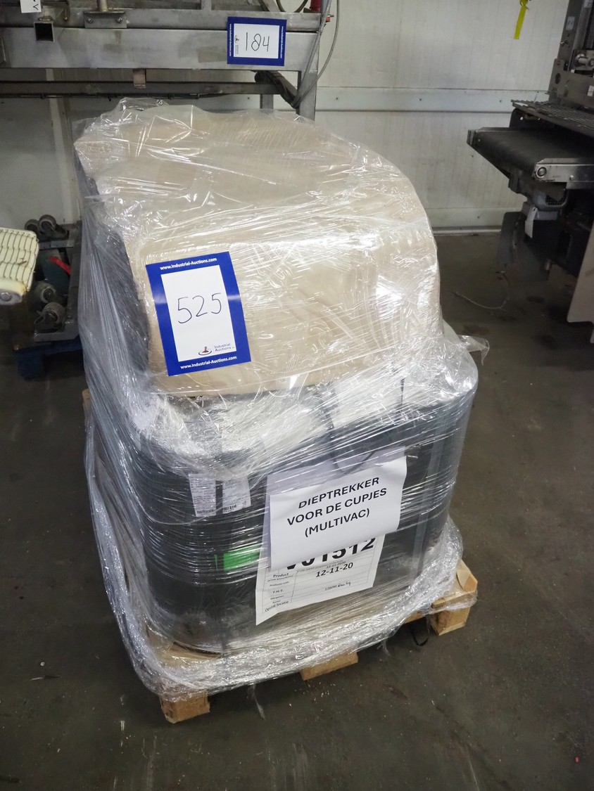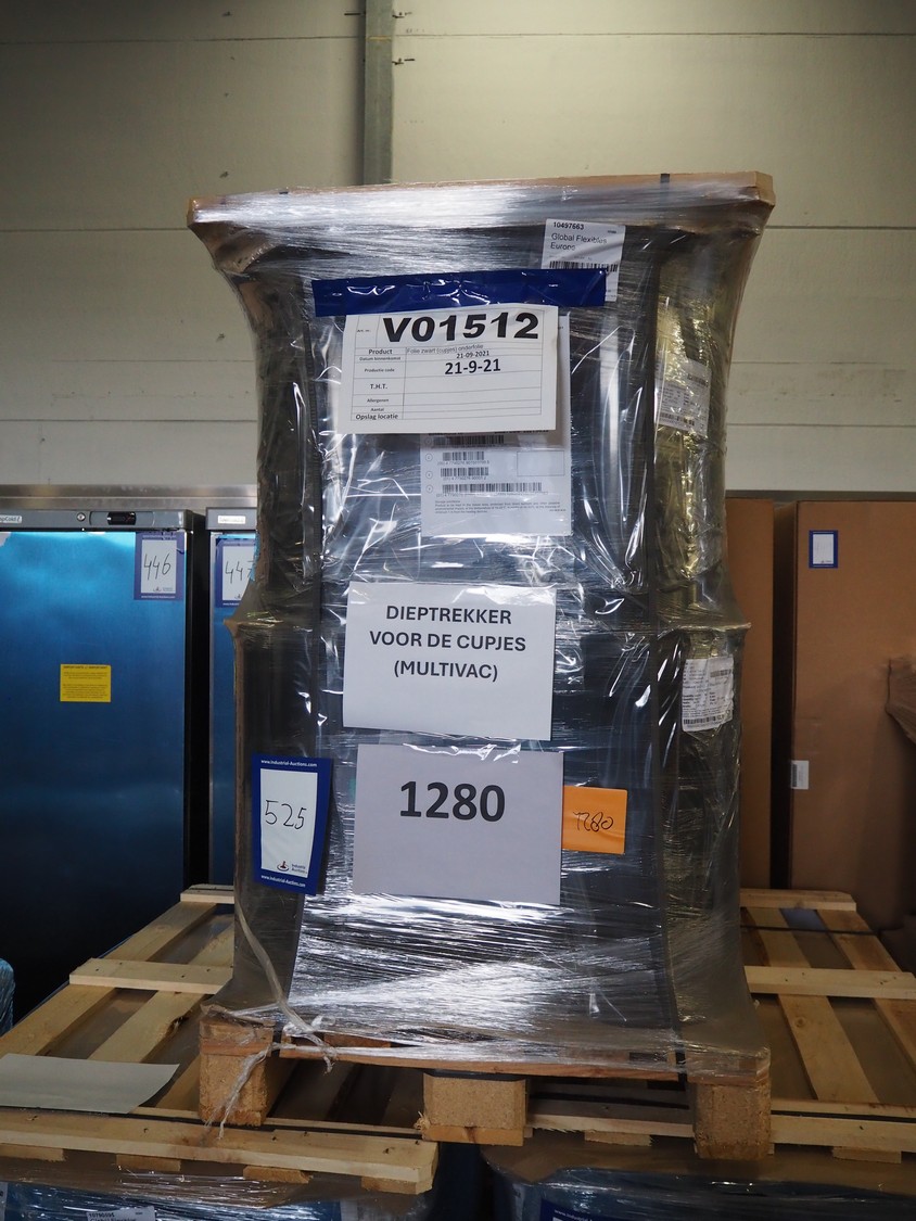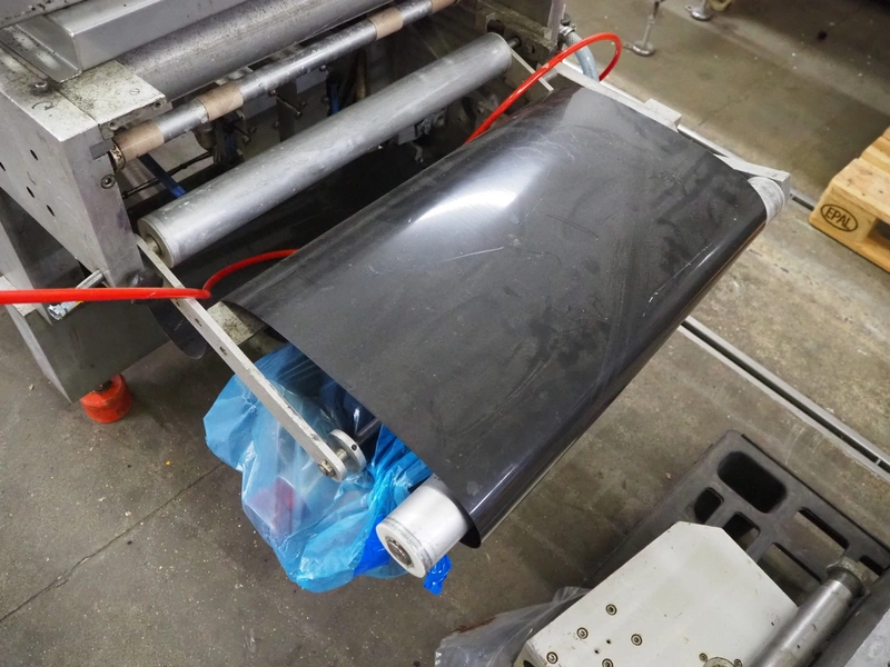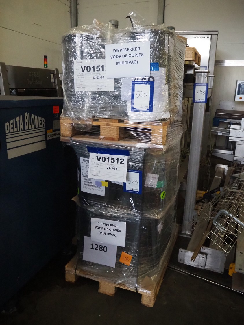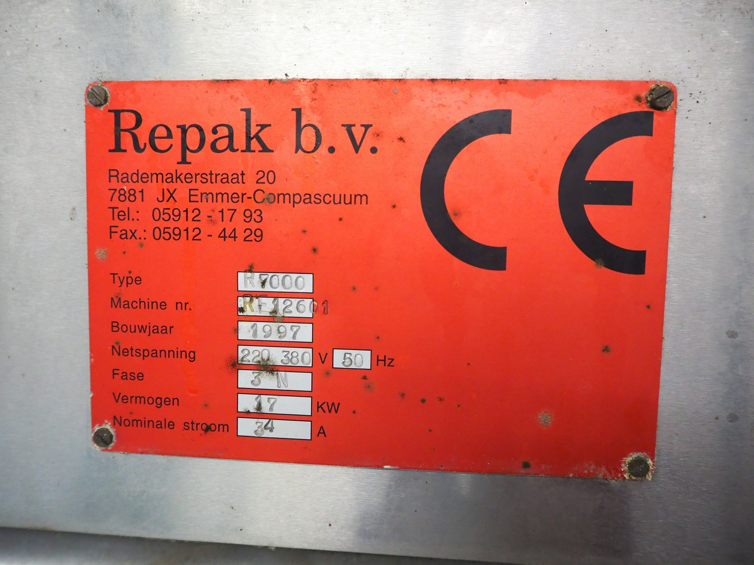 Repak b.v. thermoformer, type: R7000, machine number: RE12601, year of construction: 1997, 220/380 V, 3 Ph, 50 Hz, 34 A, 17 kW, film width: 560 mm, dye: (21x) 50 mm x 50 mm, Busch vacuum pump, capacity: 63 m³ per hour, total dimensions: 4300 mm x 1050 mm x 1850 mm. Including 3 pallets with parts and 7 pallets with film rolls.